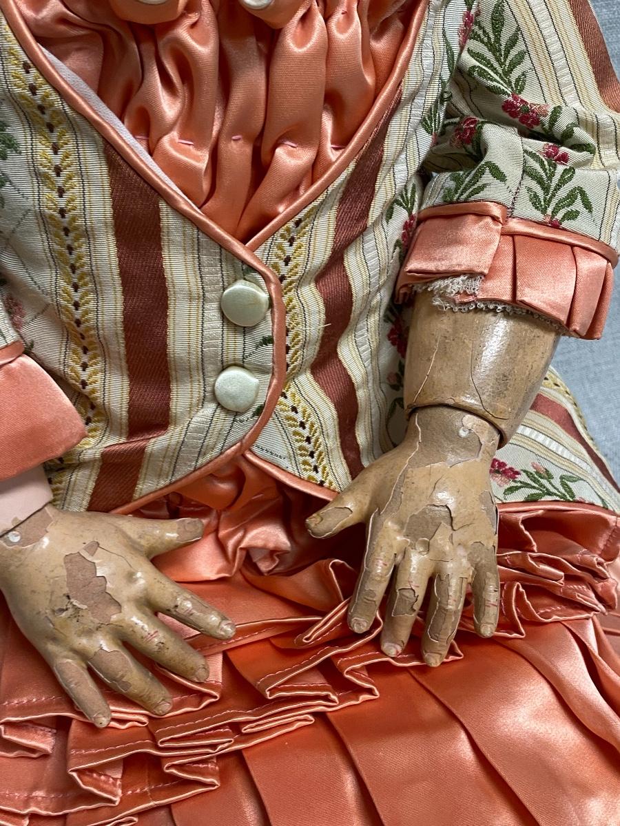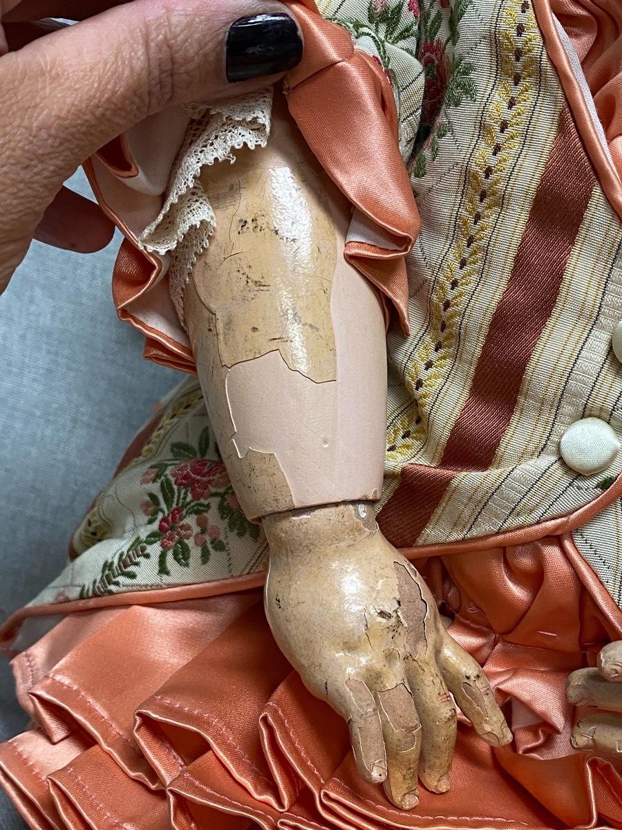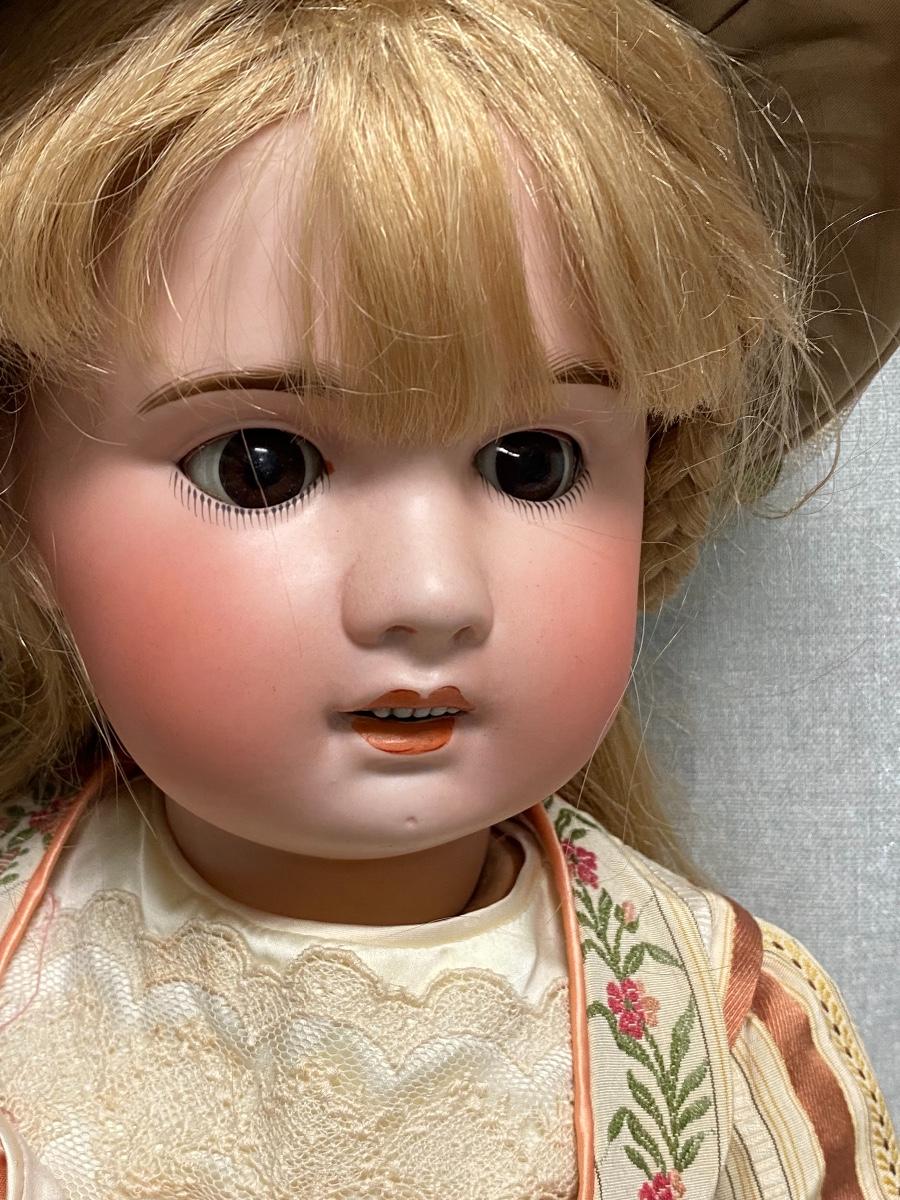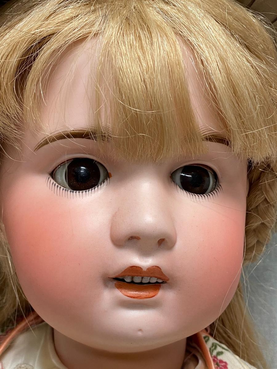 Antique 22 SFBJ Paris Bisque & Composite Sleepy Eye Doll. Blonde hair, dark eyes, open mouth with teeth, small dimple in chin. Beautiful face. Composite is not in the best condition as seen on her hands/arms. Head is marked 22 SFBJ Paris 13. About 27" size.