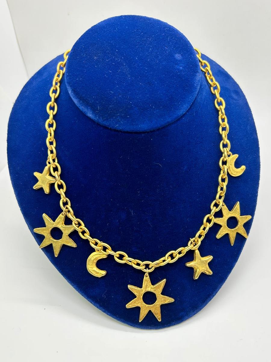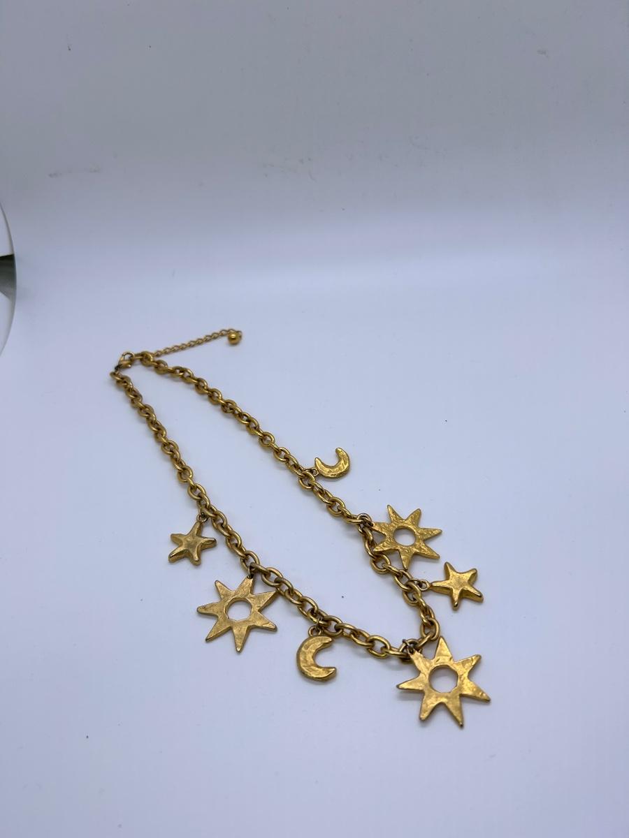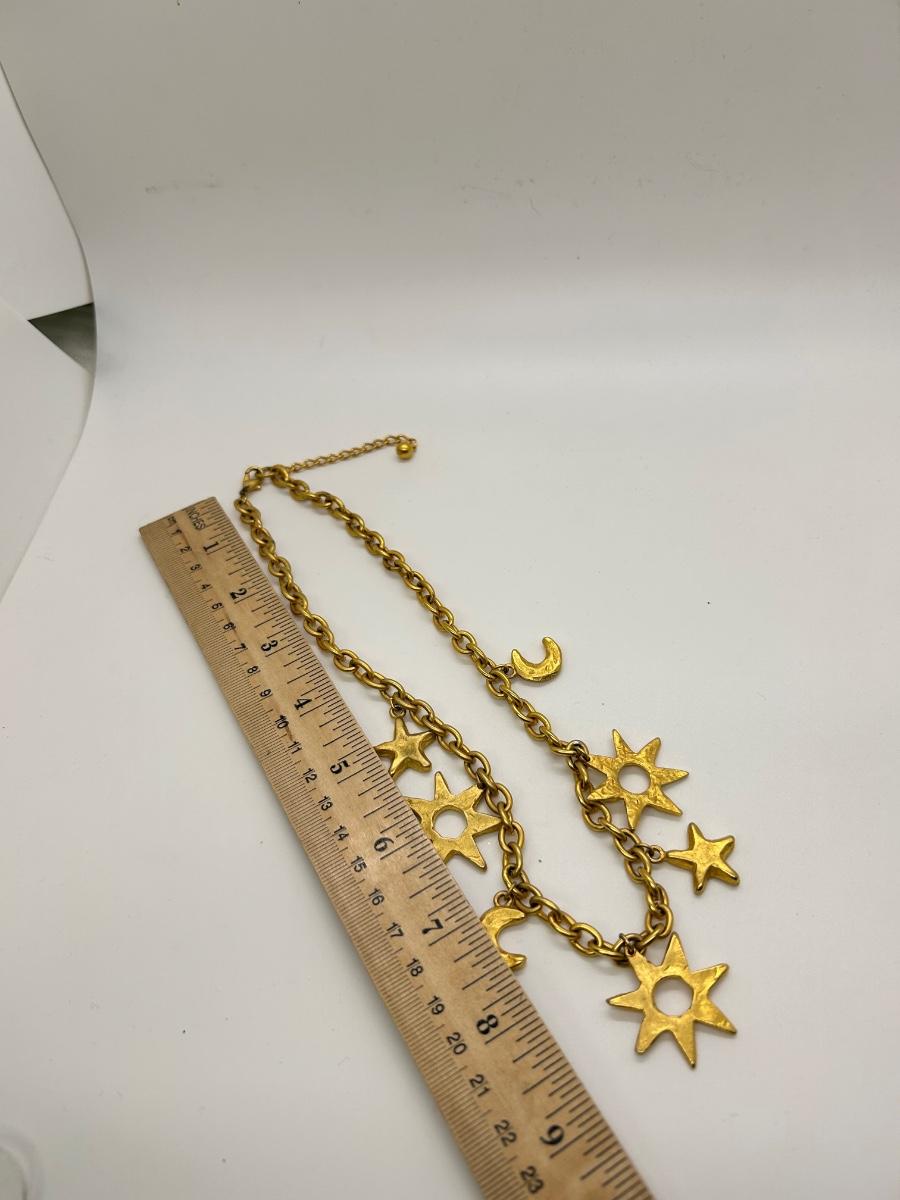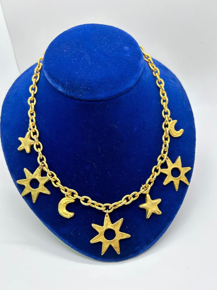 Chunky Bright Gold Tone Moon and Stars Choker Style Charm Necklace. In good condition. Metal has a bright matte finish to it.