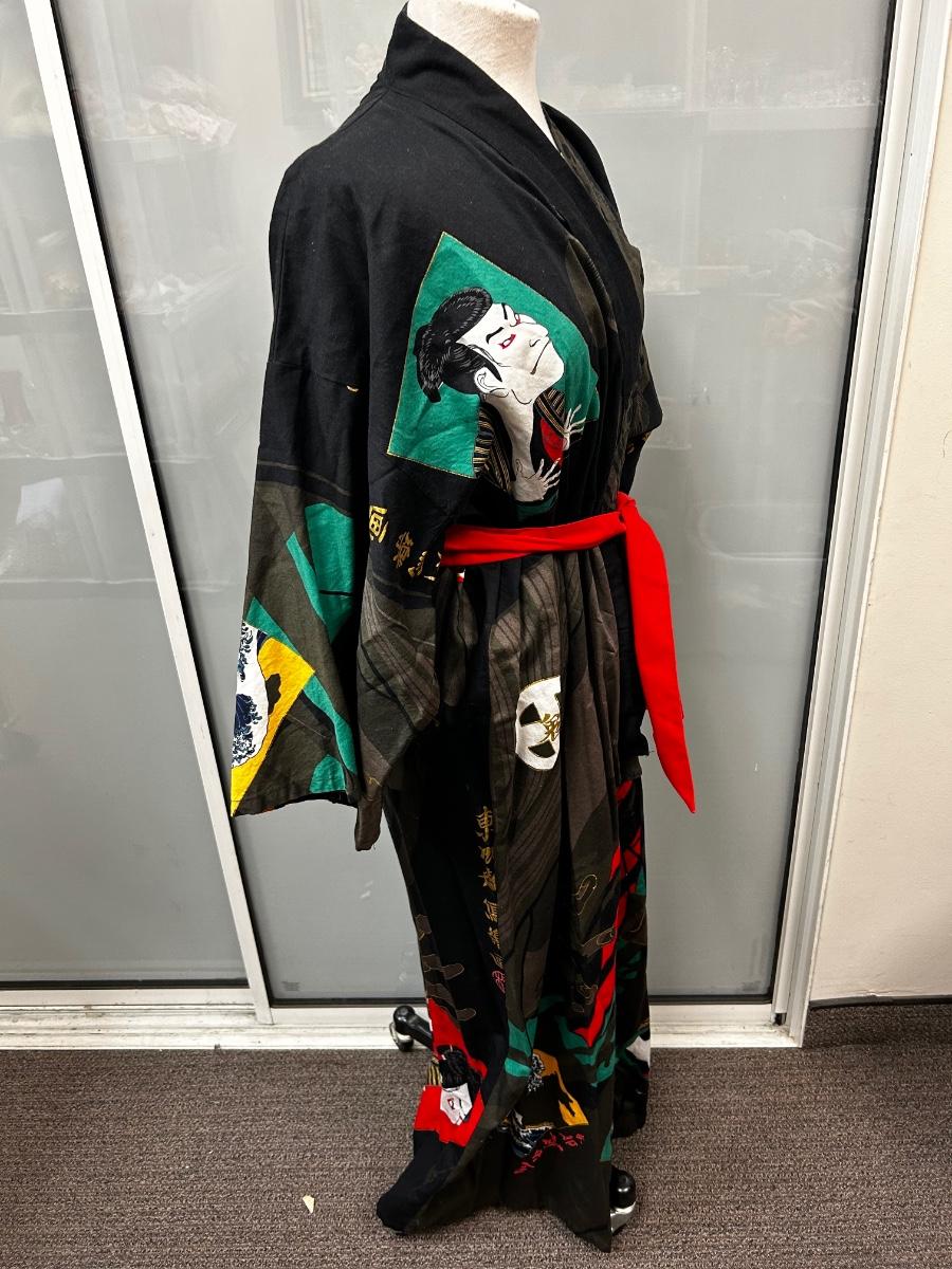Retro Japanese Kimono Kabuki Mod Print Robe Cover Up. 100% cotton. In good condition, no spots or holes noticed. Tag is a little faded, fits around a size medium.