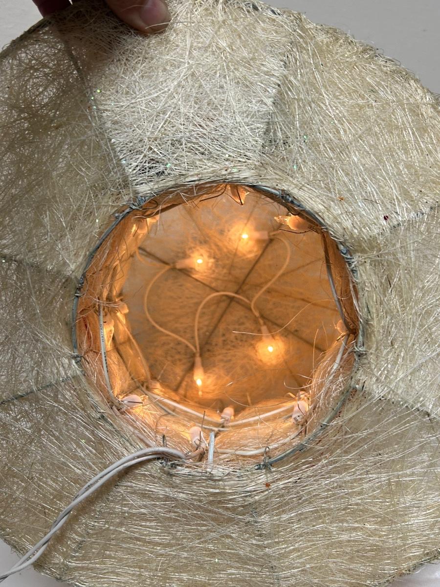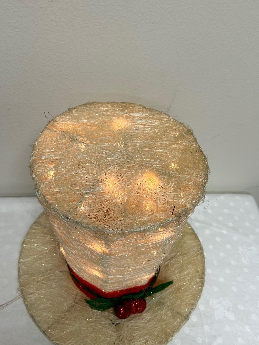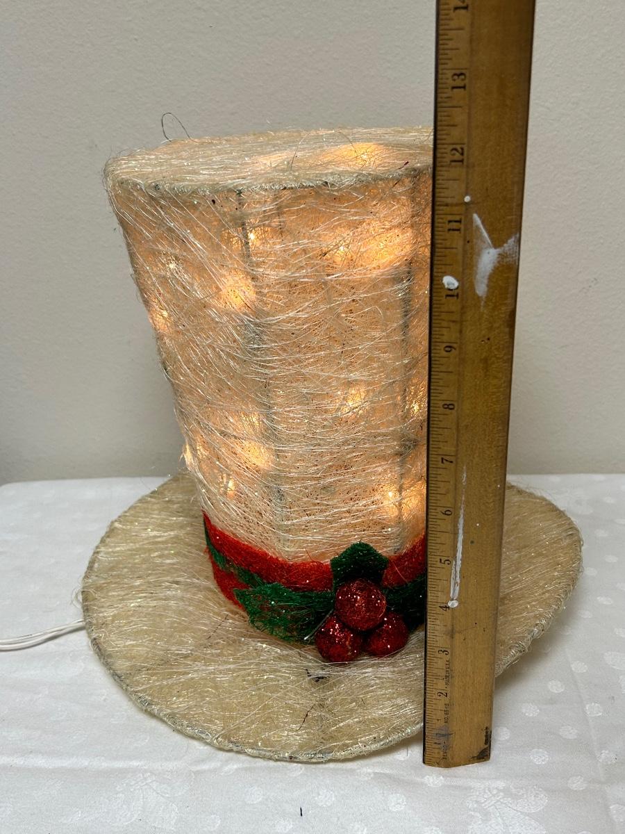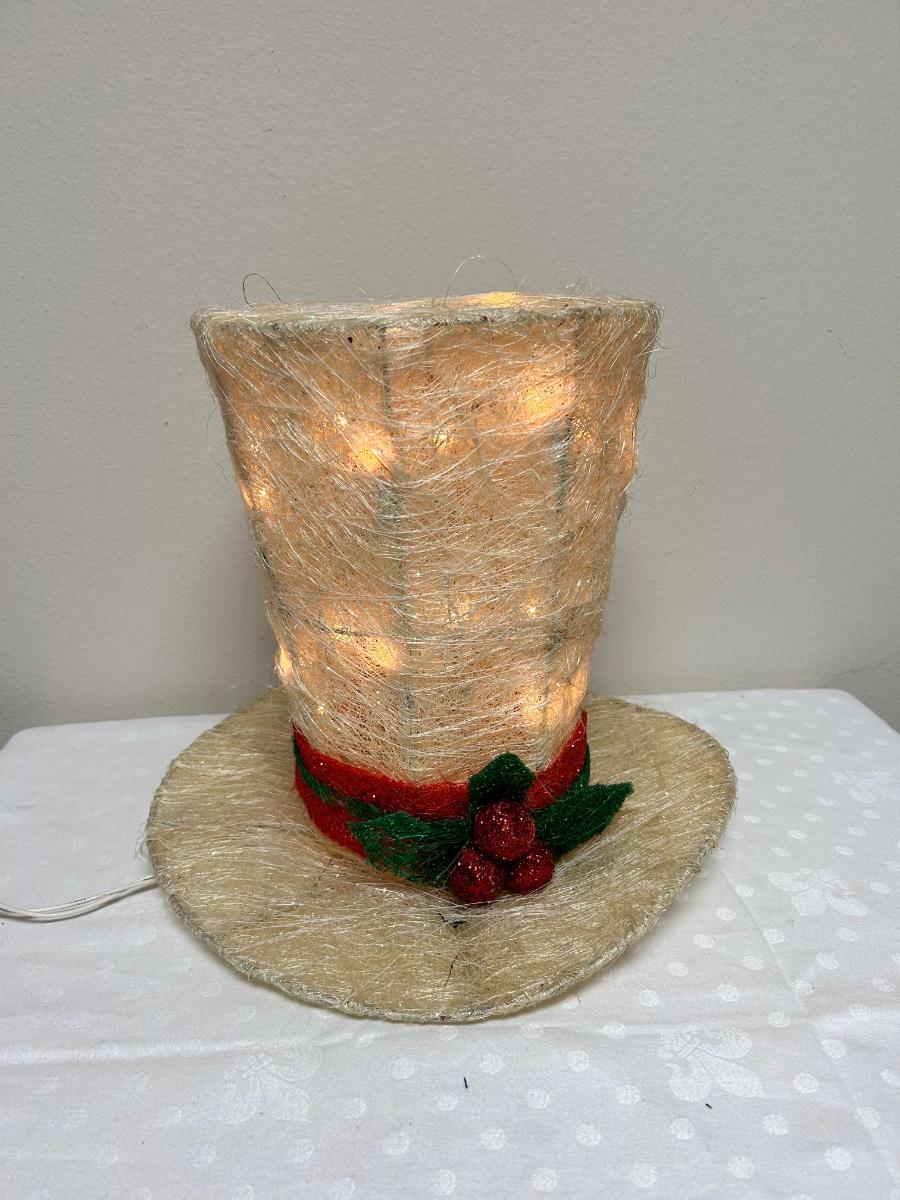 Lighted Christmas Holiday Top Hat Display. In good condition. No on and off switch, turns on when you plug it in. About 12" size.