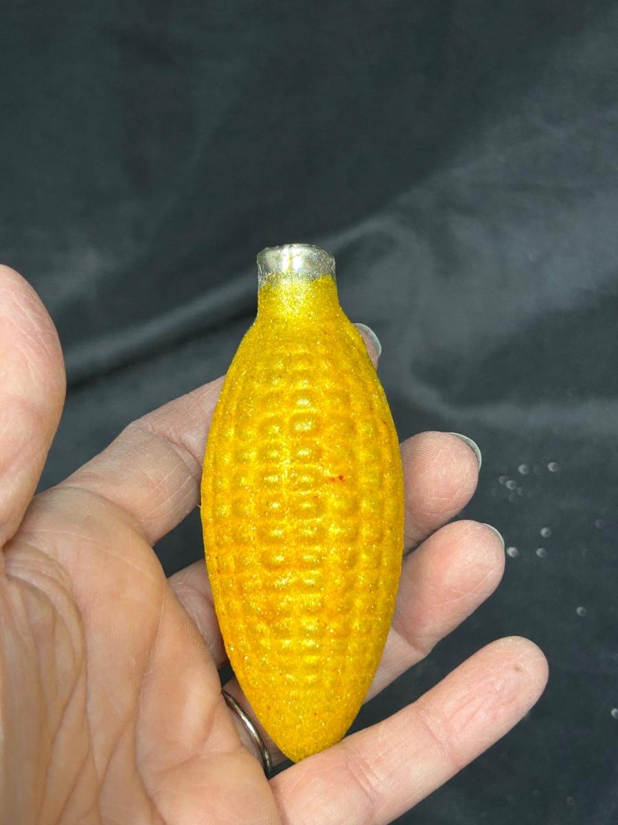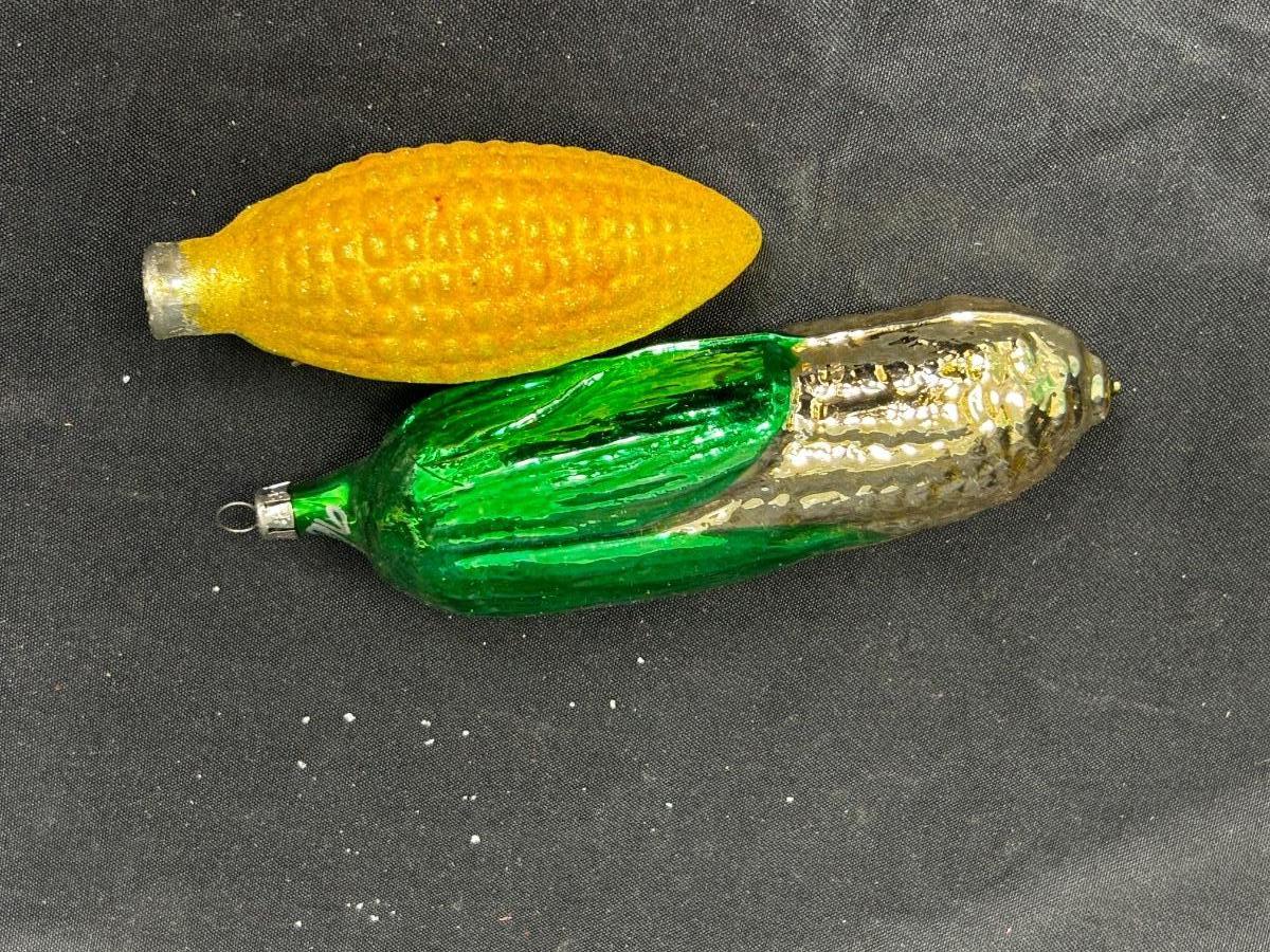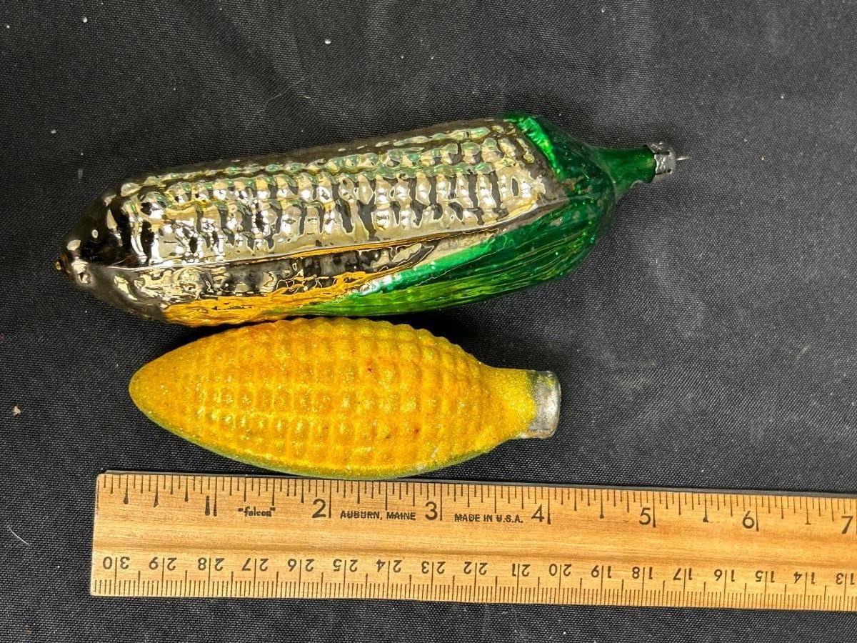 Pair of Blown Glass Novelty Christmas Holiday Tree Ornaments Corn on the Cob. In good condition. The smaller cob does need a metal hanging piece put on to it. See photos.
