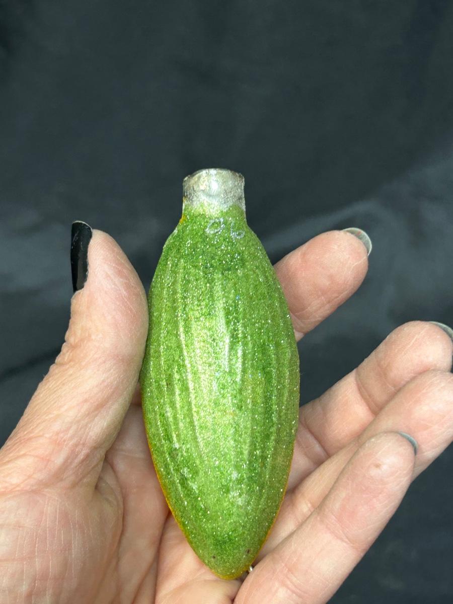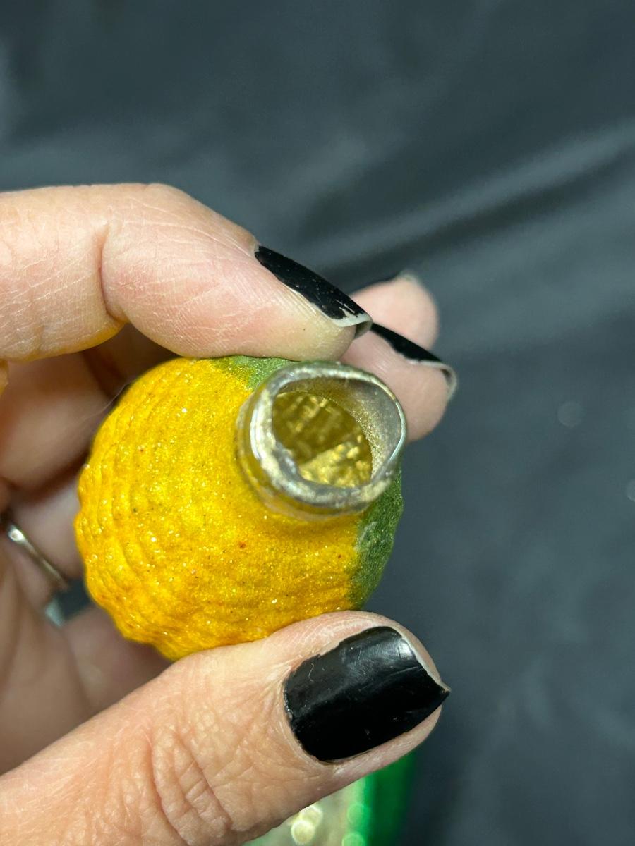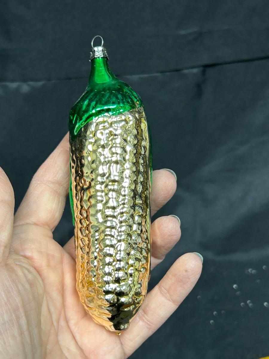 Pair of Blown Glass Novelty Christmas Holiday Tree Ornaments Corn on the Cob. In good condition. The smaller cob does need a metal hanging piece put on to it. See photos.