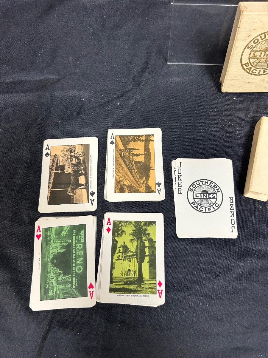 Vintage Southern Pacific Lines Railroad Train Souvenir Playing Cards Complete Deck. Cards were checked for completeness. Each card has a different location destination on the face of the card. The backs are all the same with the locomotive image. In good condition, no bent cards.