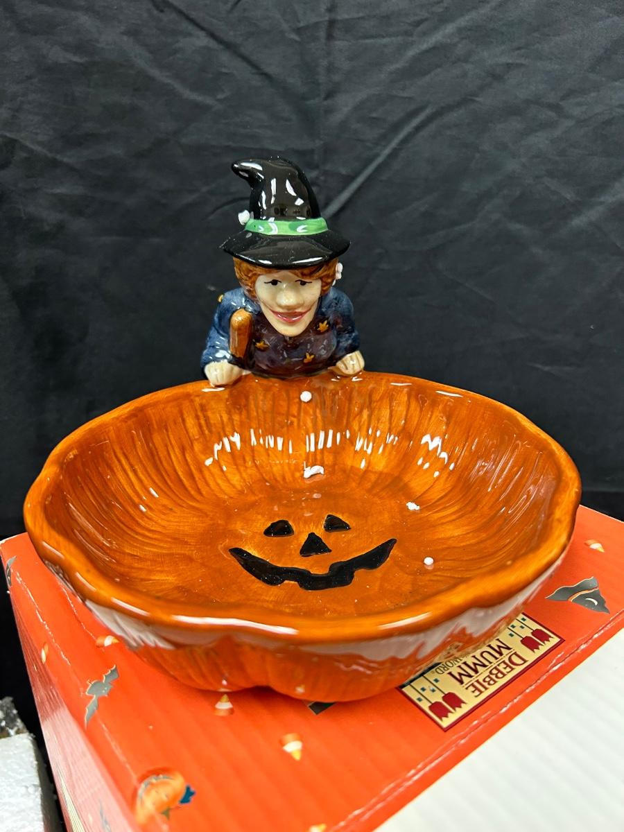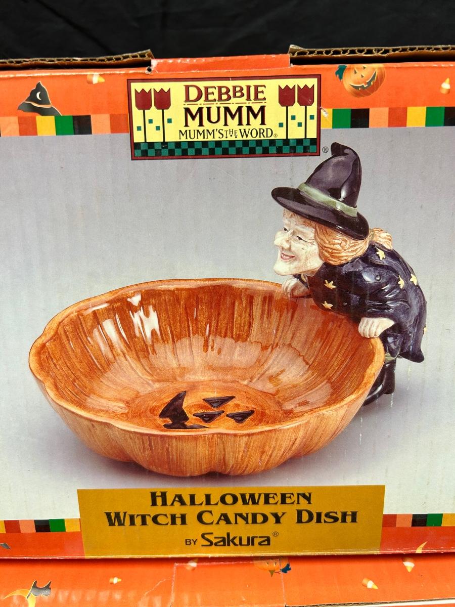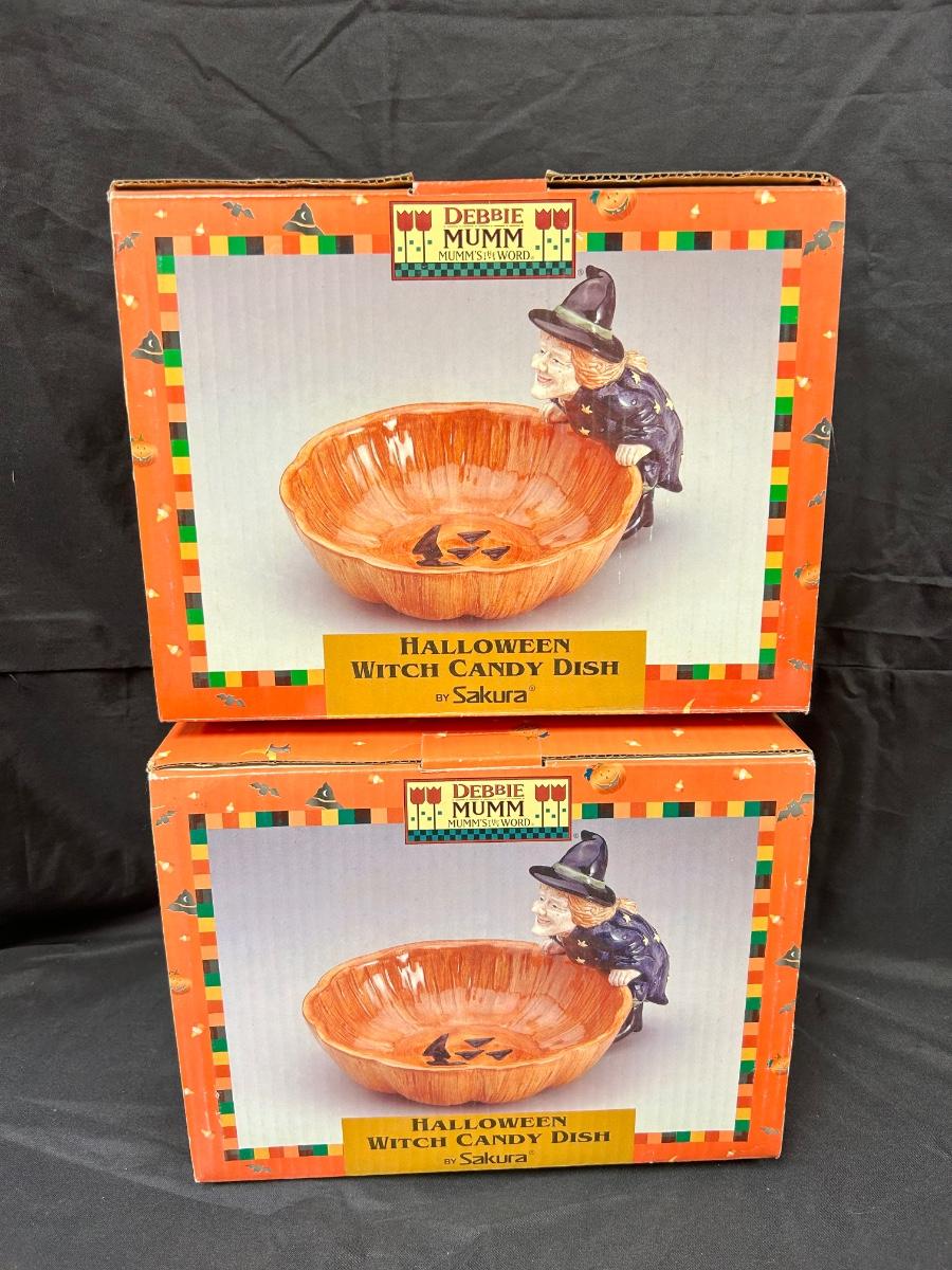 Matching Pair of Sakura Debbie Mumm Halloween Candy Dish Jack-o-lantern and Witch. Both are in good condition. Come in their original boxes.