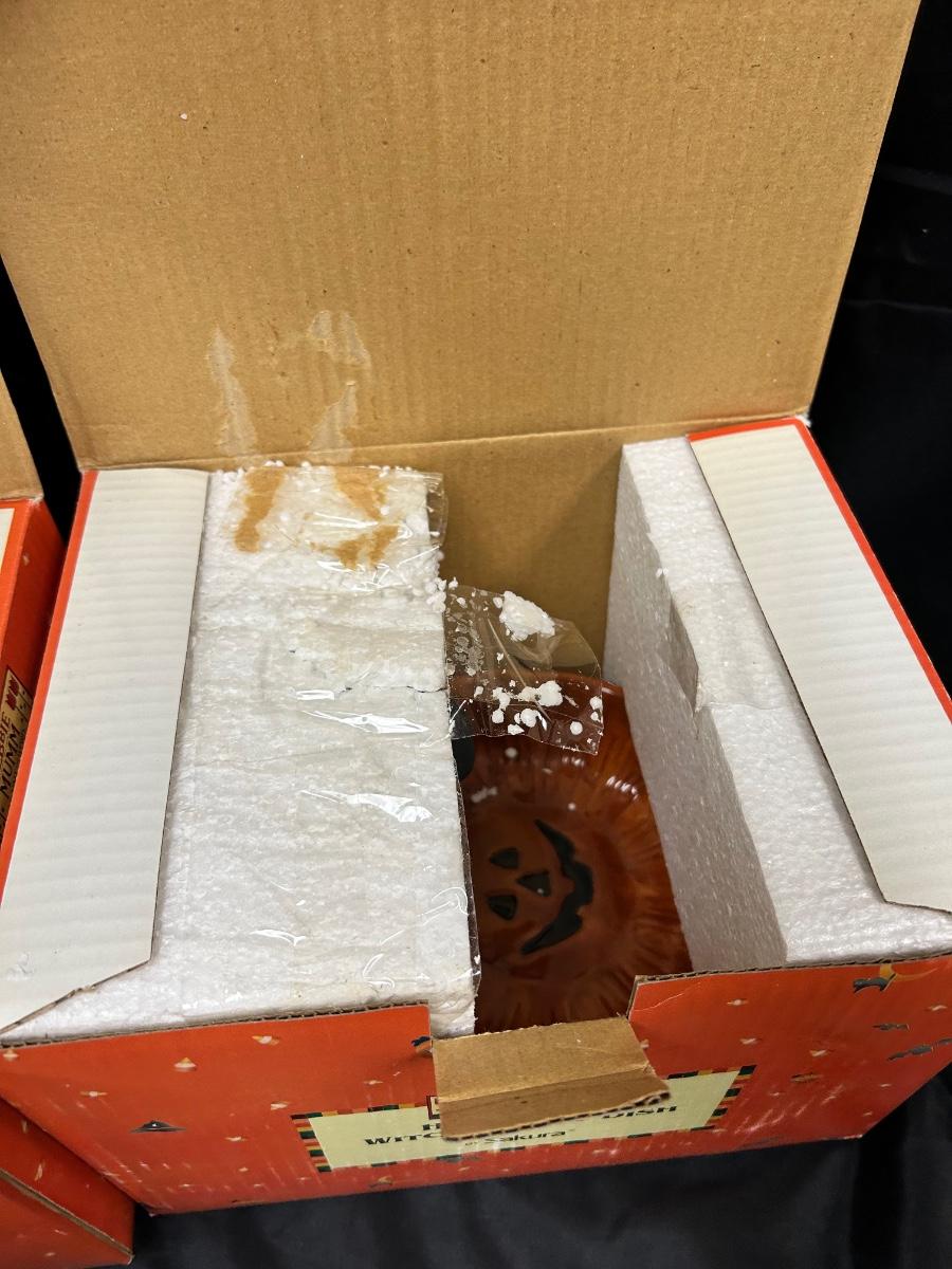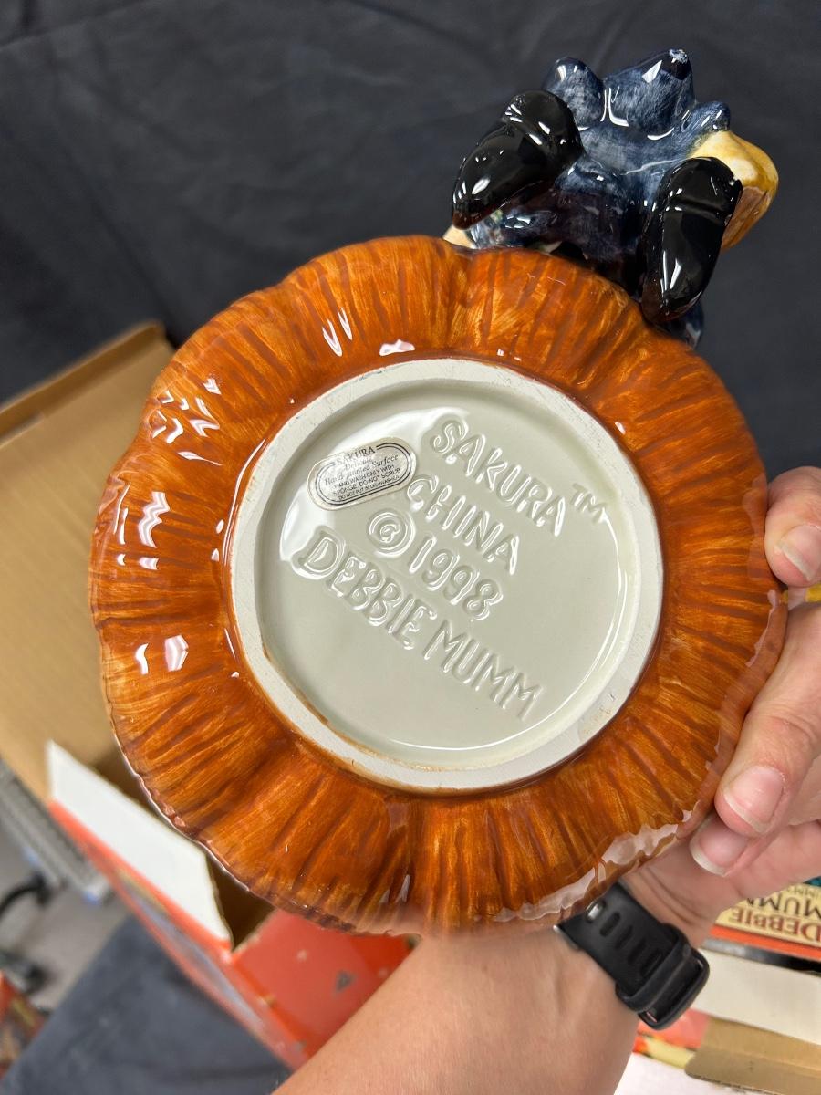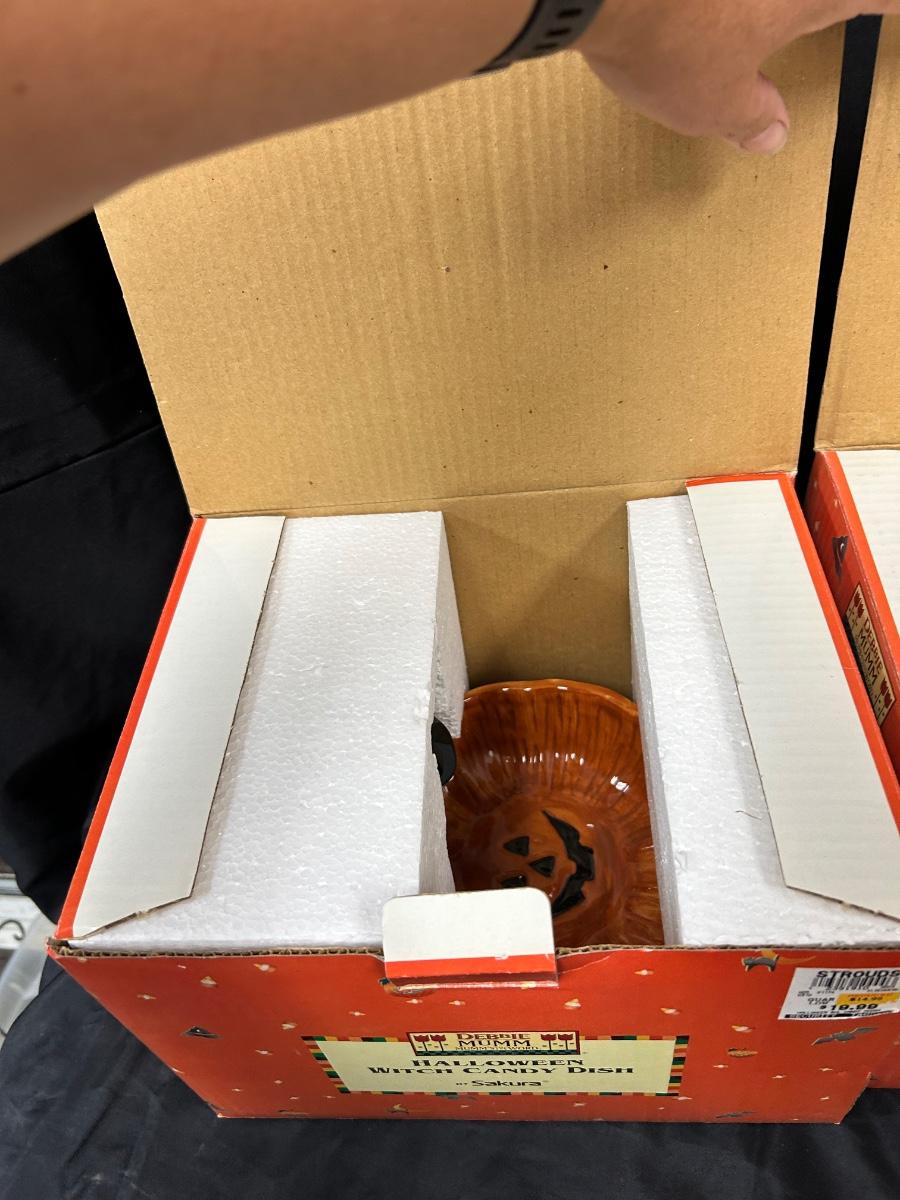 Matching Pair of Sakura Debbie Mumm Halloween Candy Dish Jack-o-lantern and Witch. Both are in good condition. Come in their original boxes.