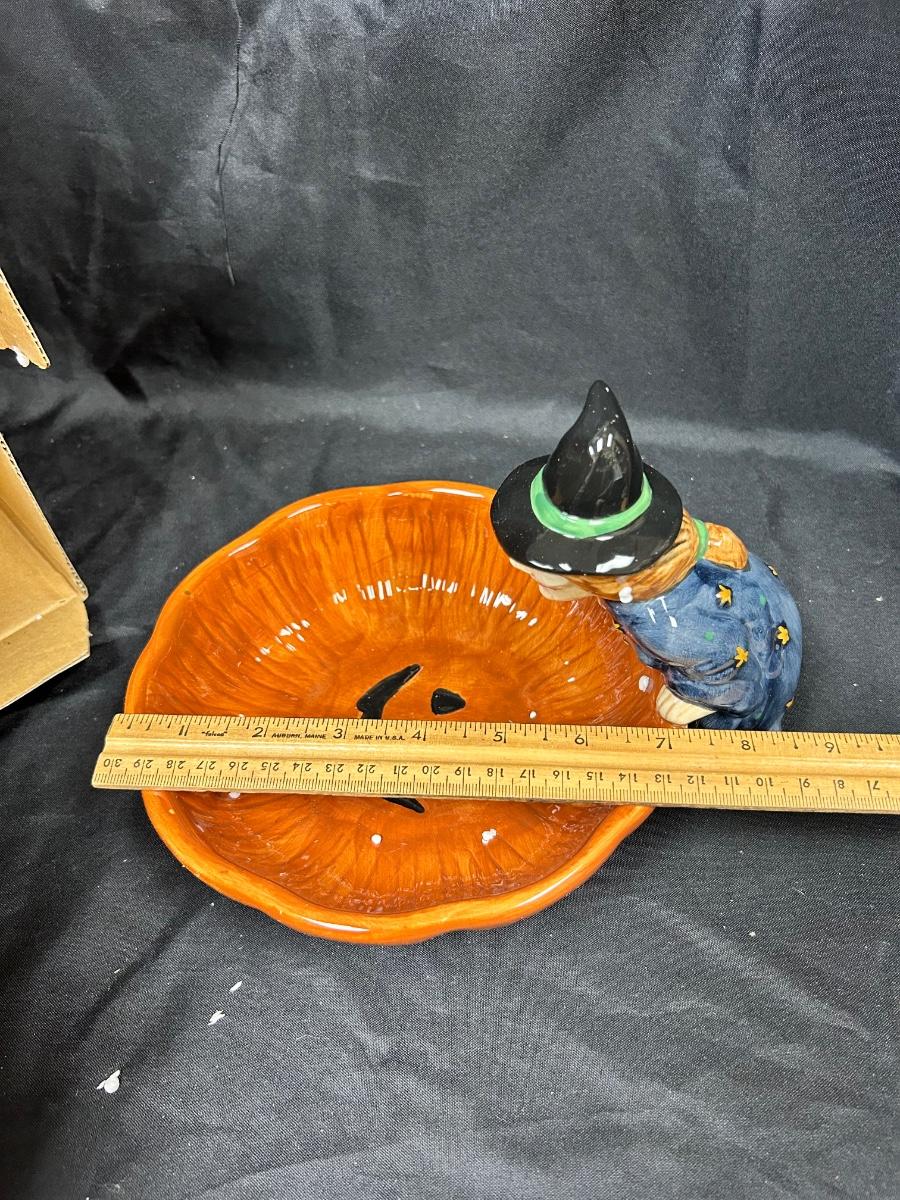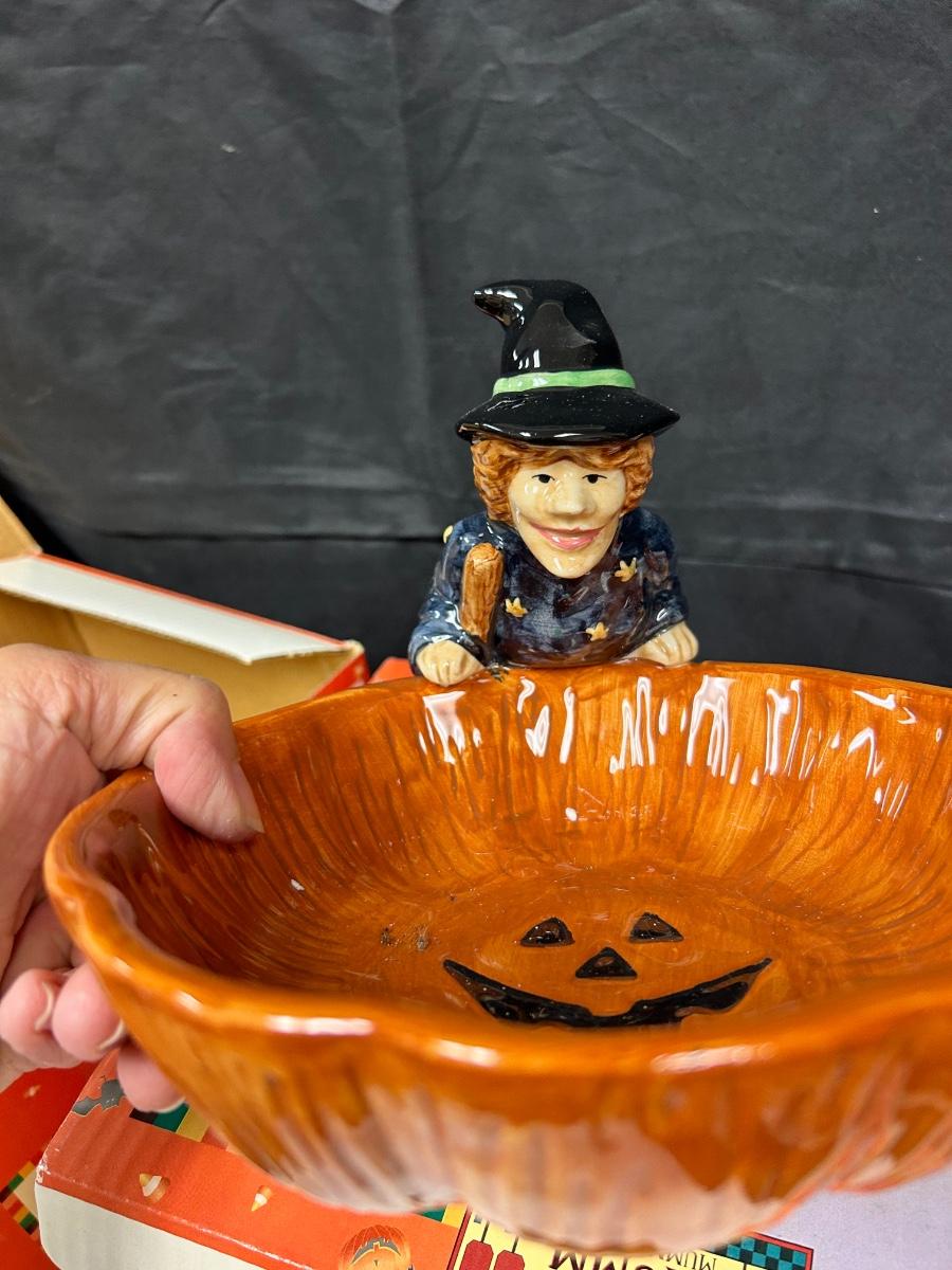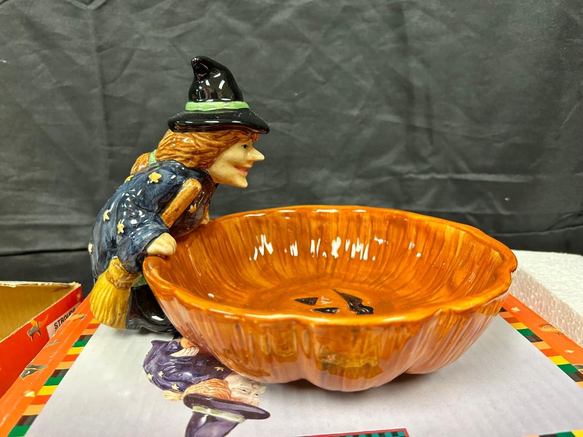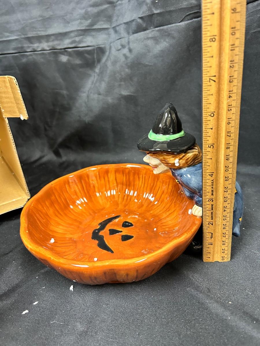 Matching Pair of Sakura Debbie Mumm Halloween Candy Dish Jack-o-lantern and Witch