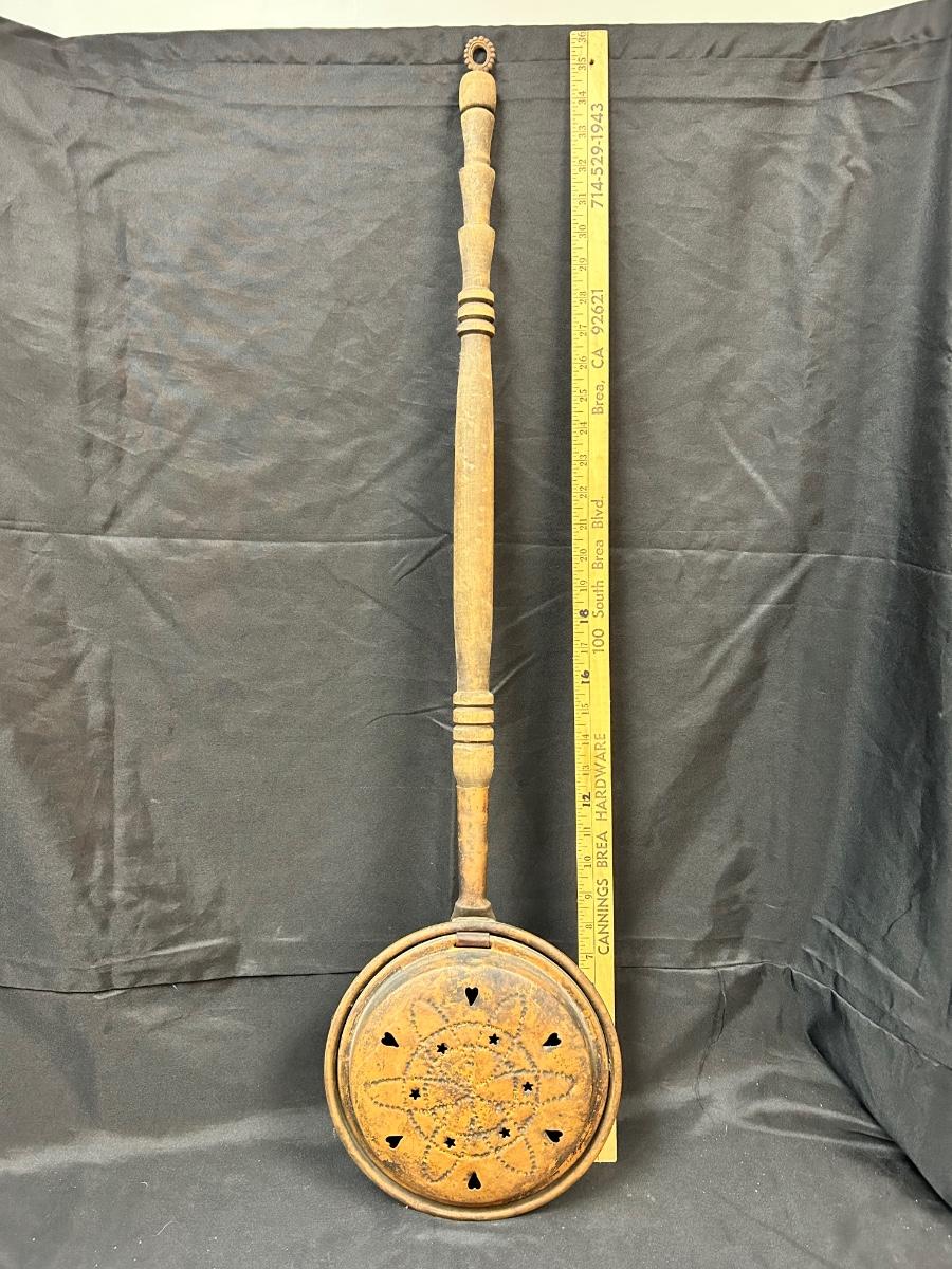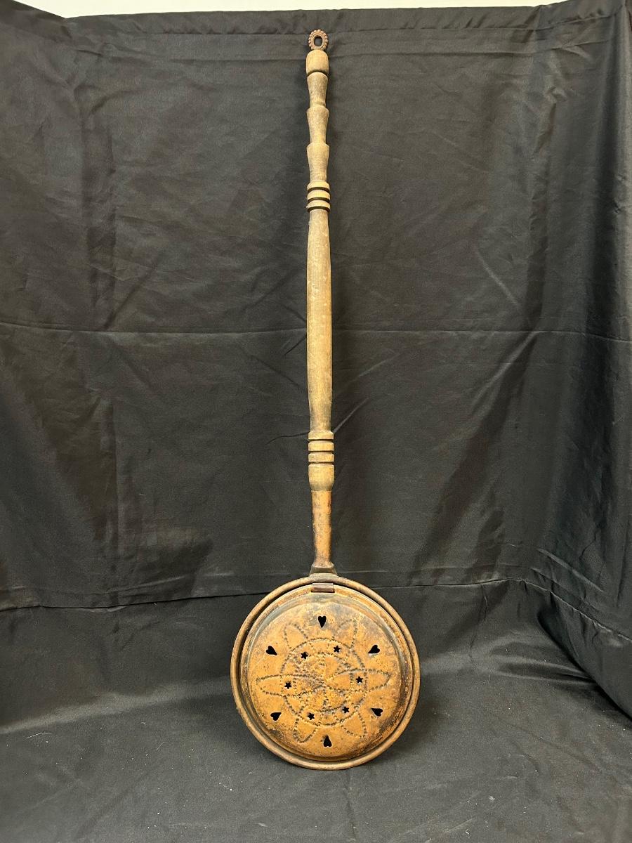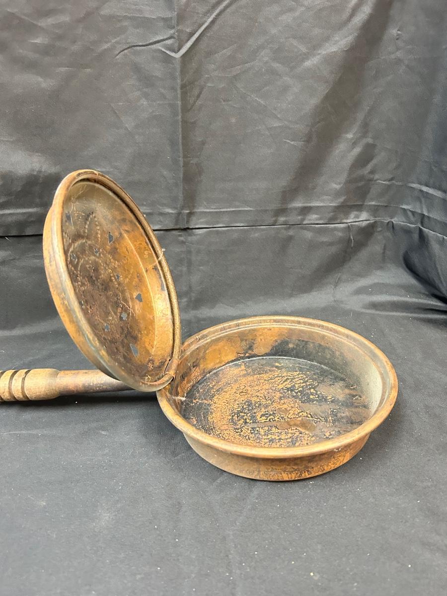 Vintage Long Wood Handled Copper Bed Warmer Chestnut Roaster Open Fire Roasting