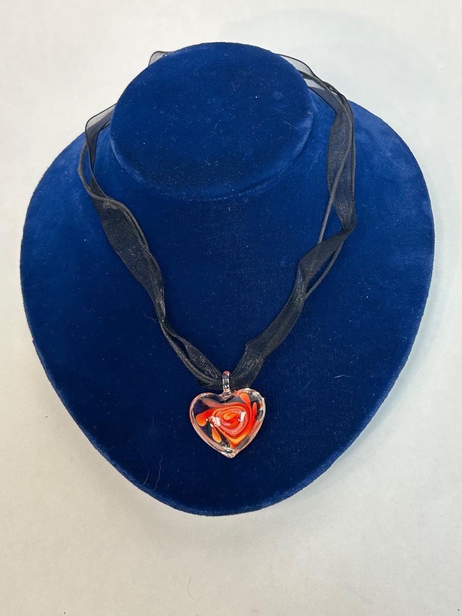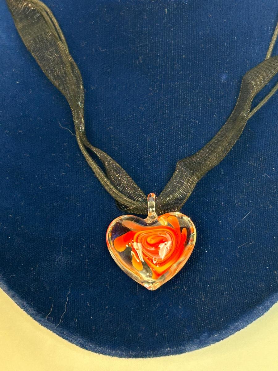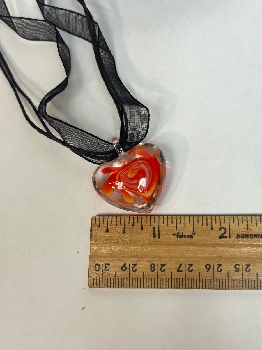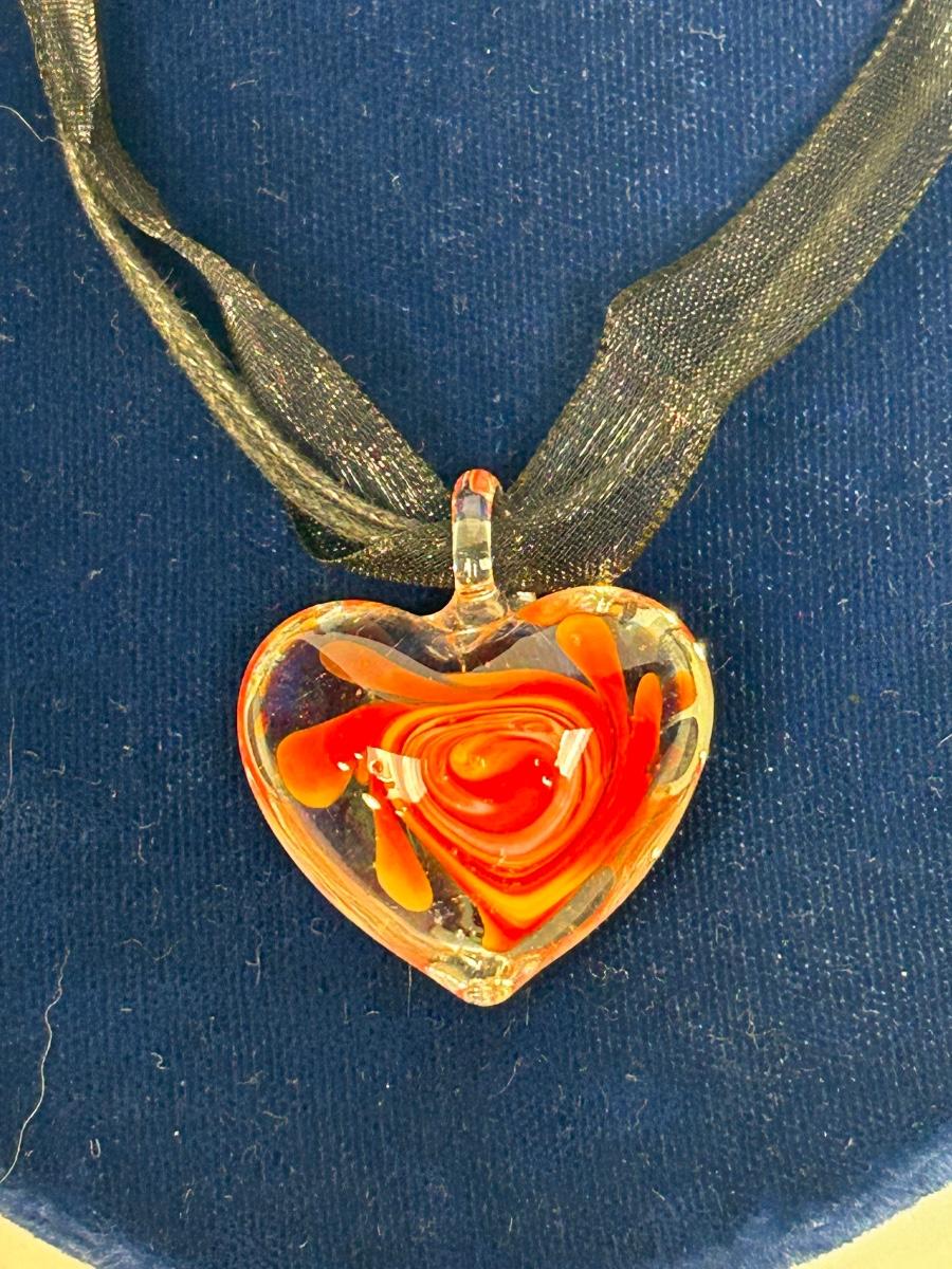 Heart Shaped Blown Art Glass Pendant Charm with Red Flower Like Swirl Inside. Currently on a ribbon like necklace but could easily be removed and place on something else. Charm is about 1" size.