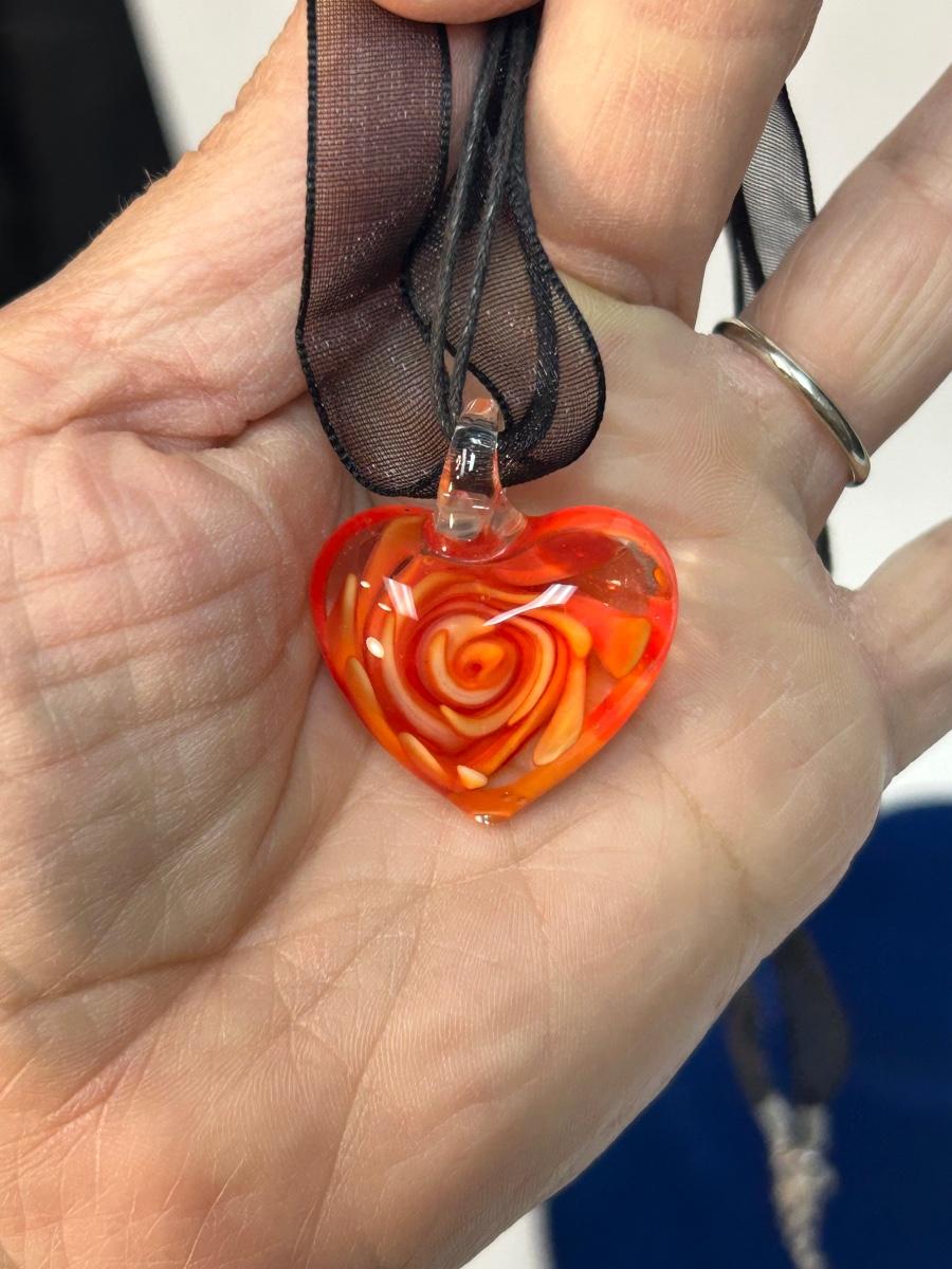 Heart Shaped Blown Art Glass Pendant Charm with Red Flower Like Swirl Inside