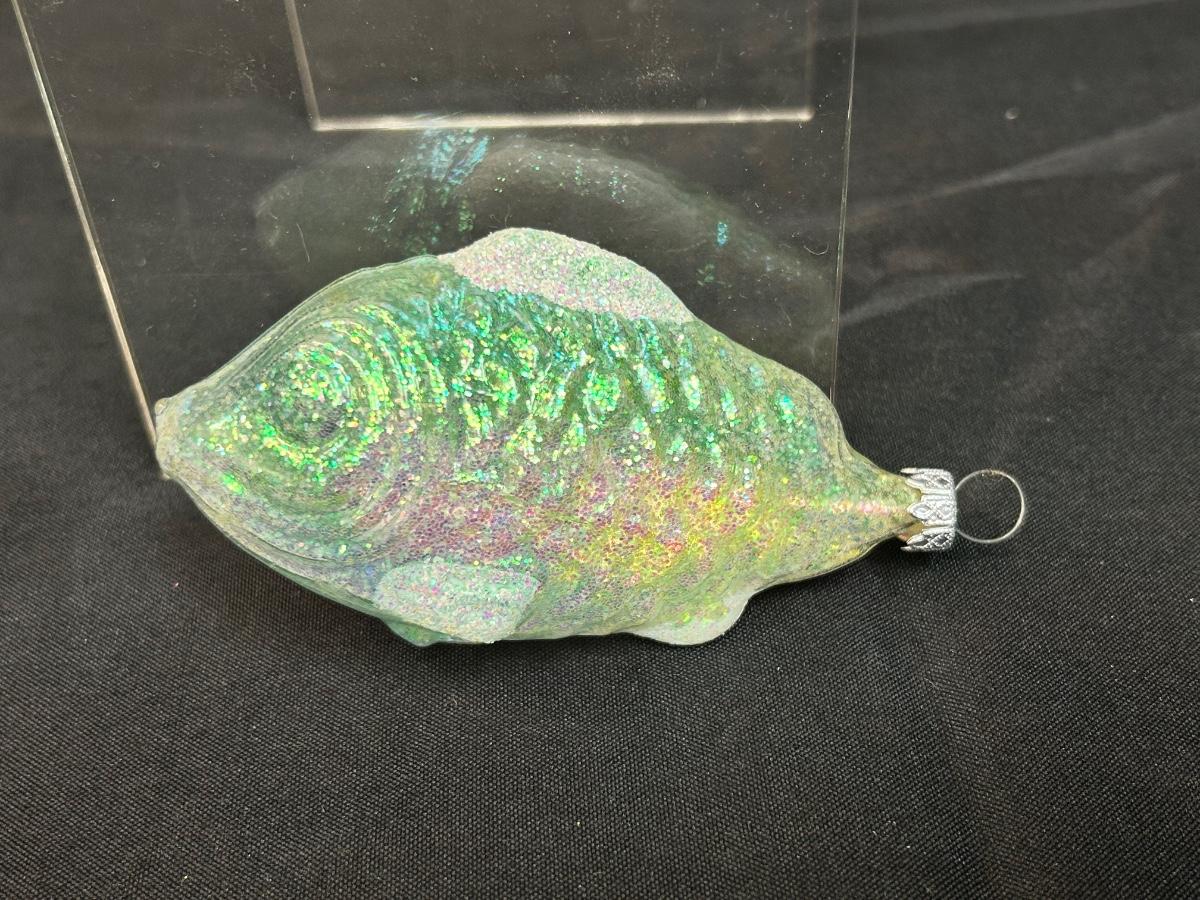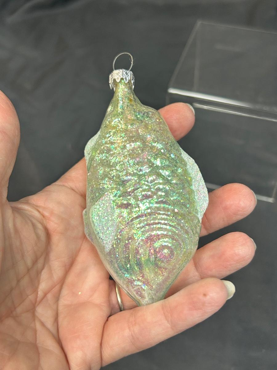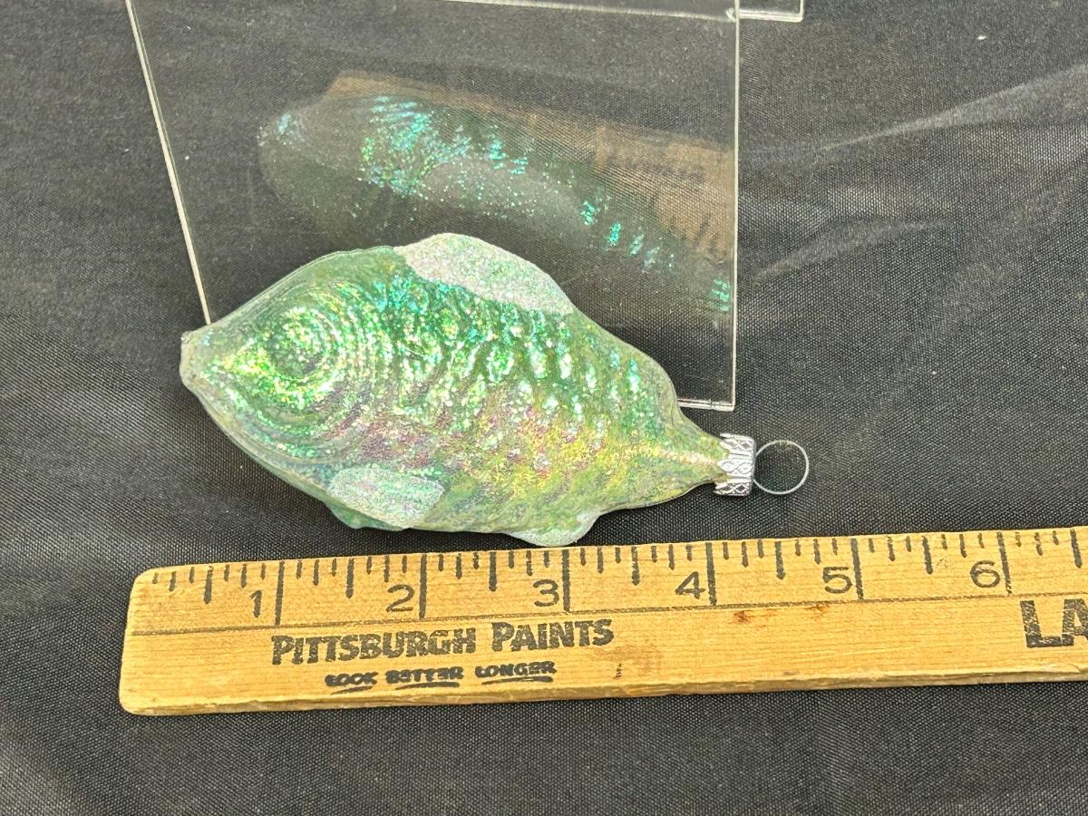 Green Iridescent Fish Shaped Blown Glass Christmas Holiday Tree Ornament Germany. In good condition. Clear glass with iridescent finish and glitter accent. Under 5" size.