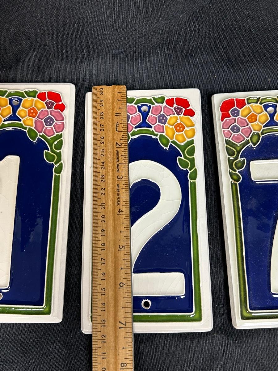 Cindy Wallace Enamel Painted Ceramic Address Number Tiles. In good condition, no chips. Have holes at top and bottom for hanging.
