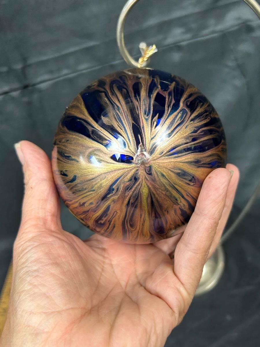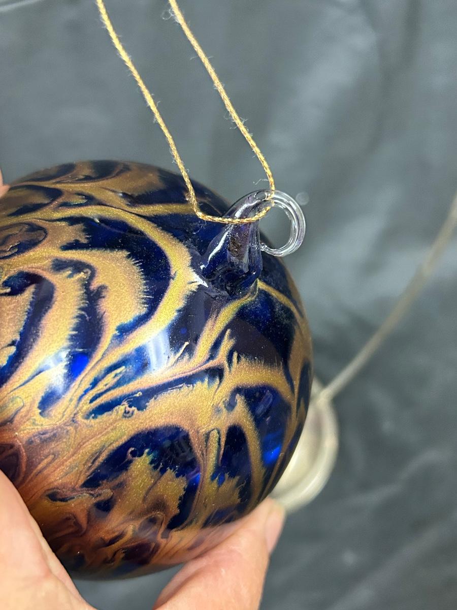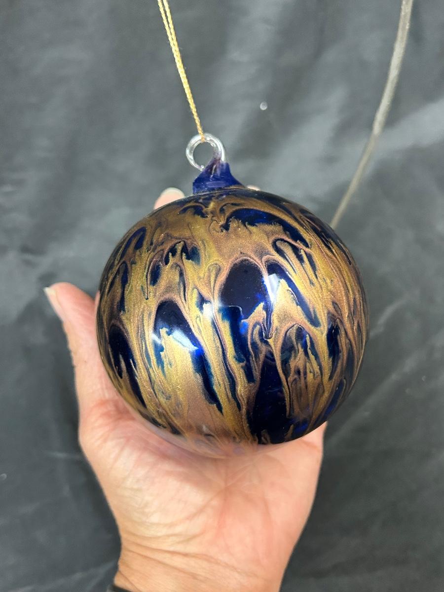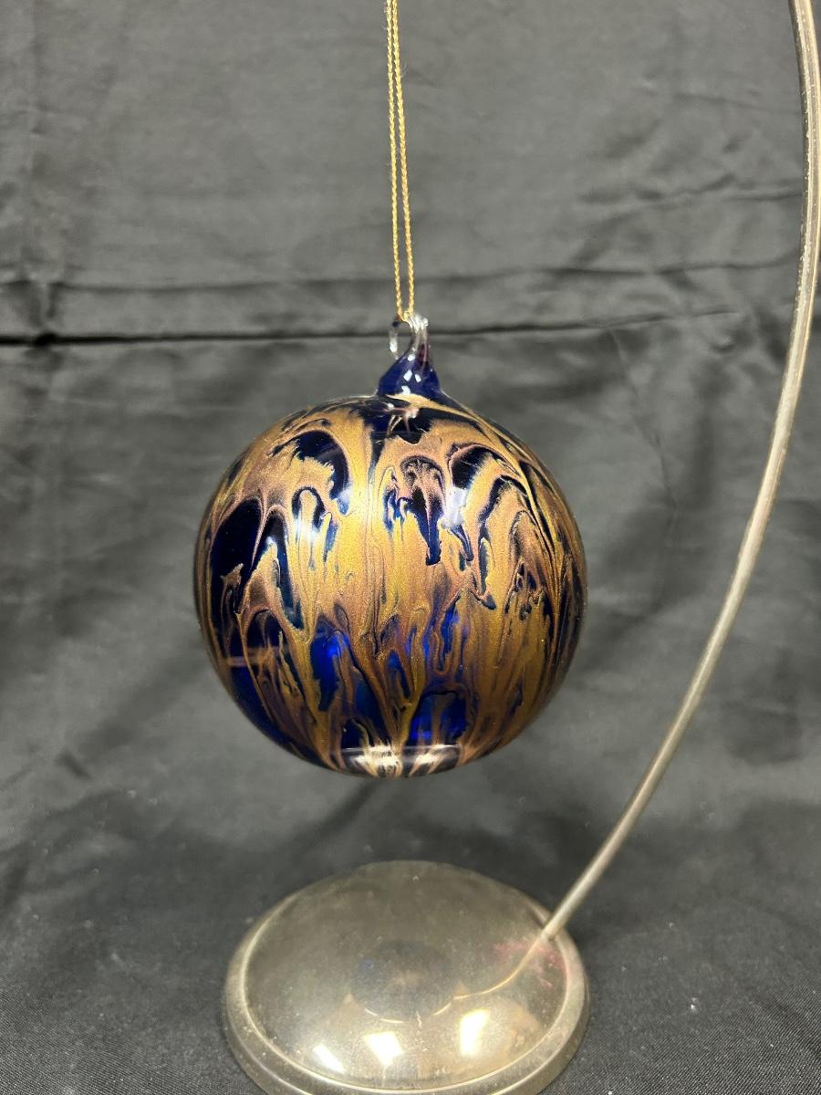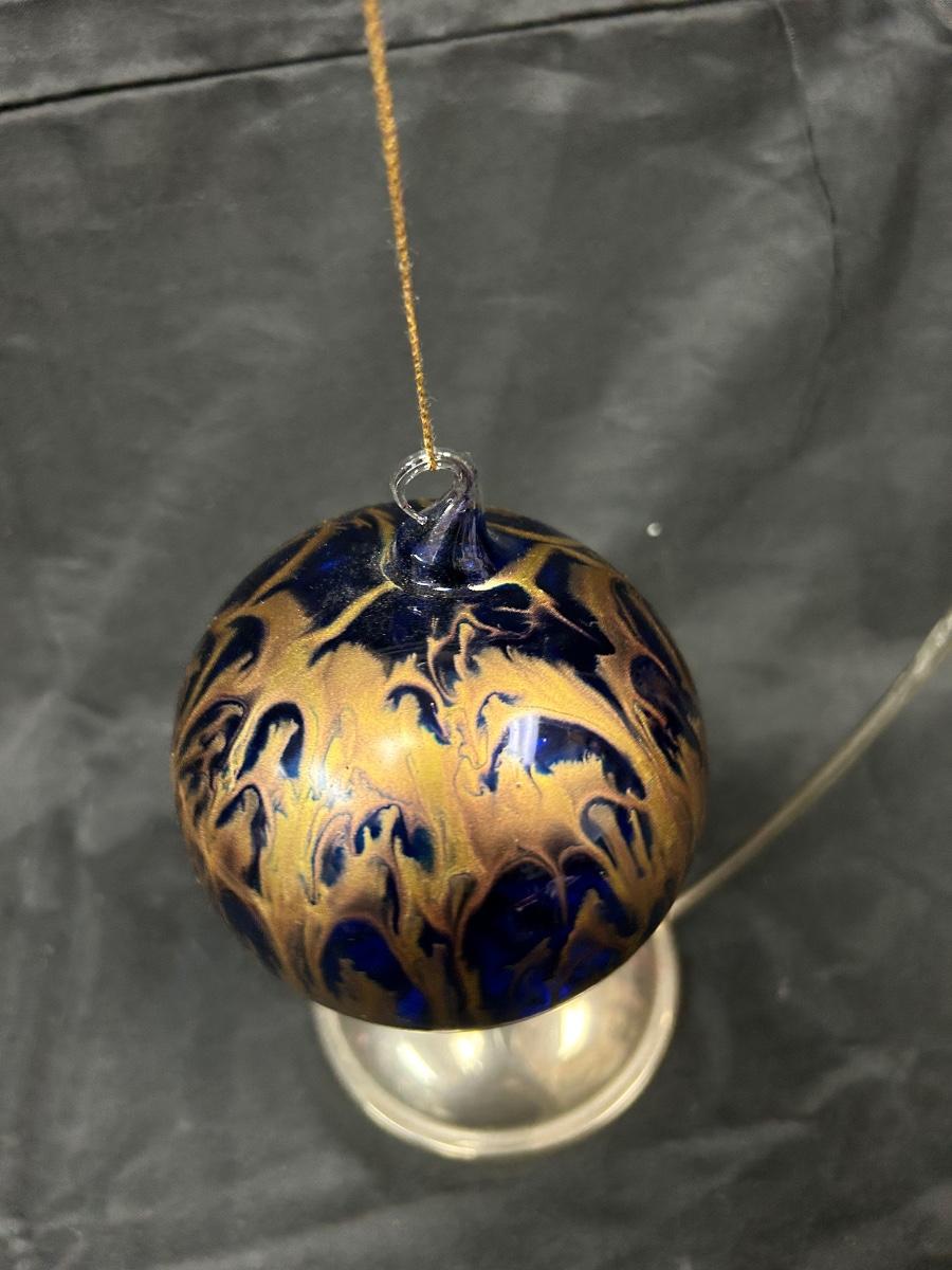 Cobalt Blue and Gold Drip Swirl Blown Art Glass Orb Ball Ornament