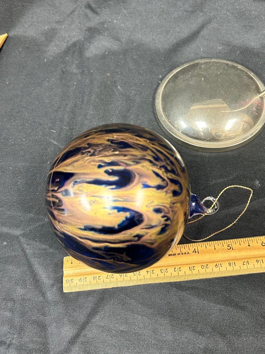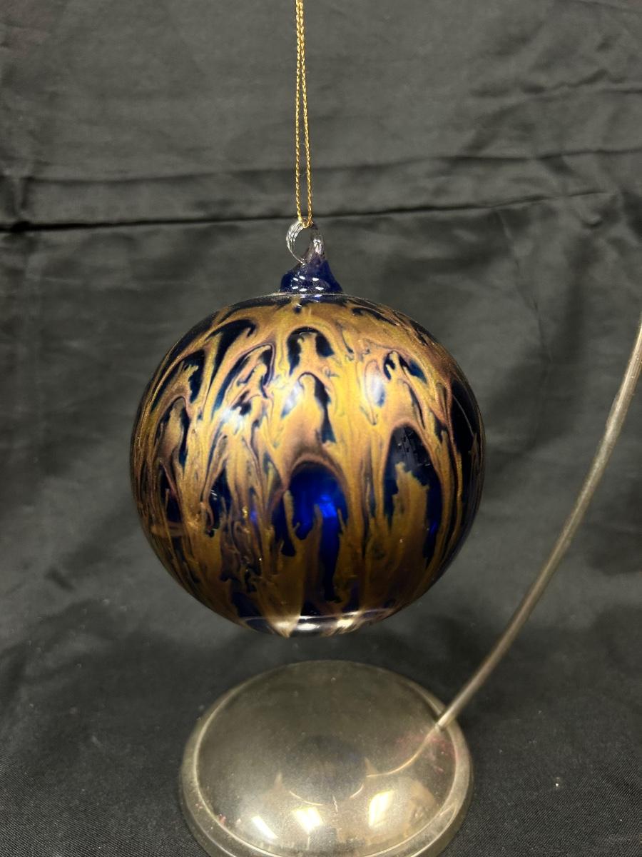 Cobalt Blue and Gold Drip Swirl Blown Art Glass Orb Ball Ornament. In good condition. Does not come with stand. Cand be hung or set on pedestal display.