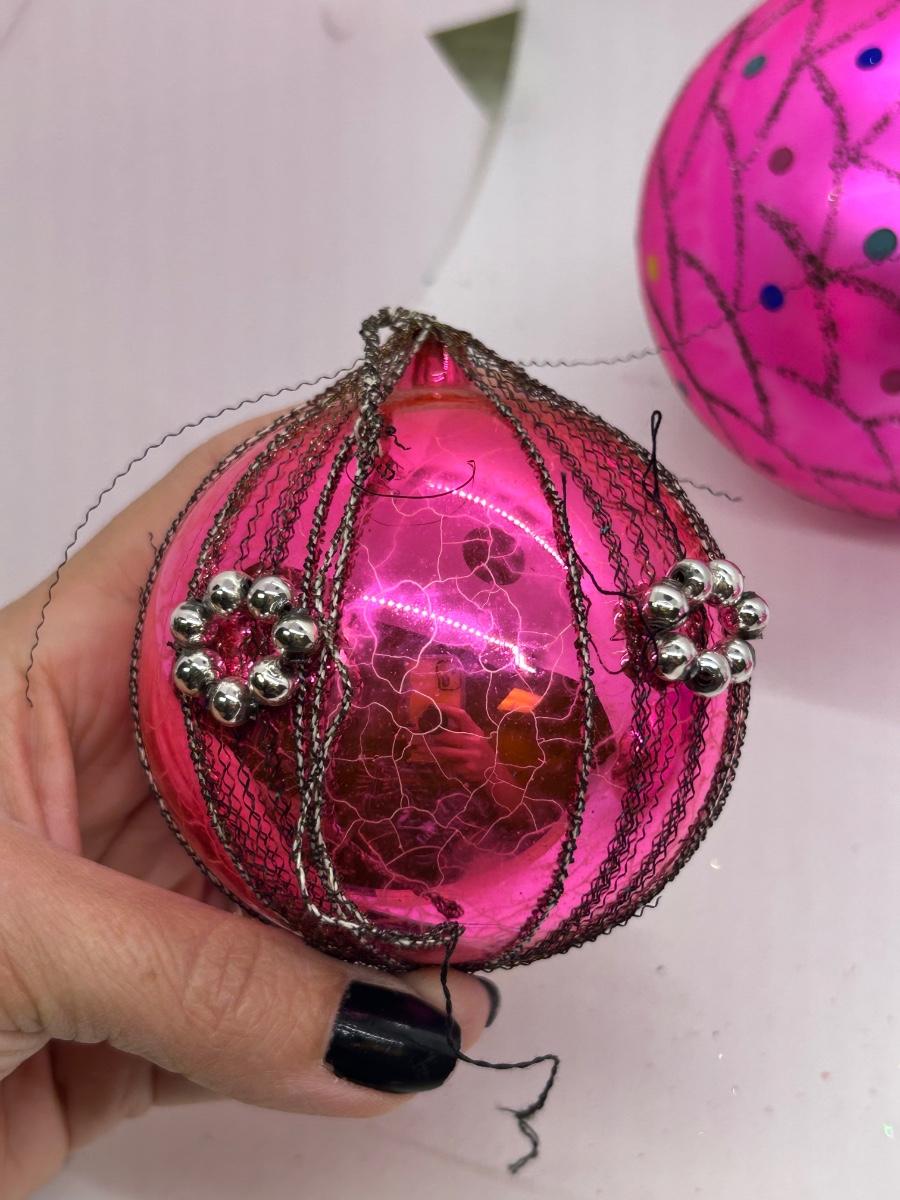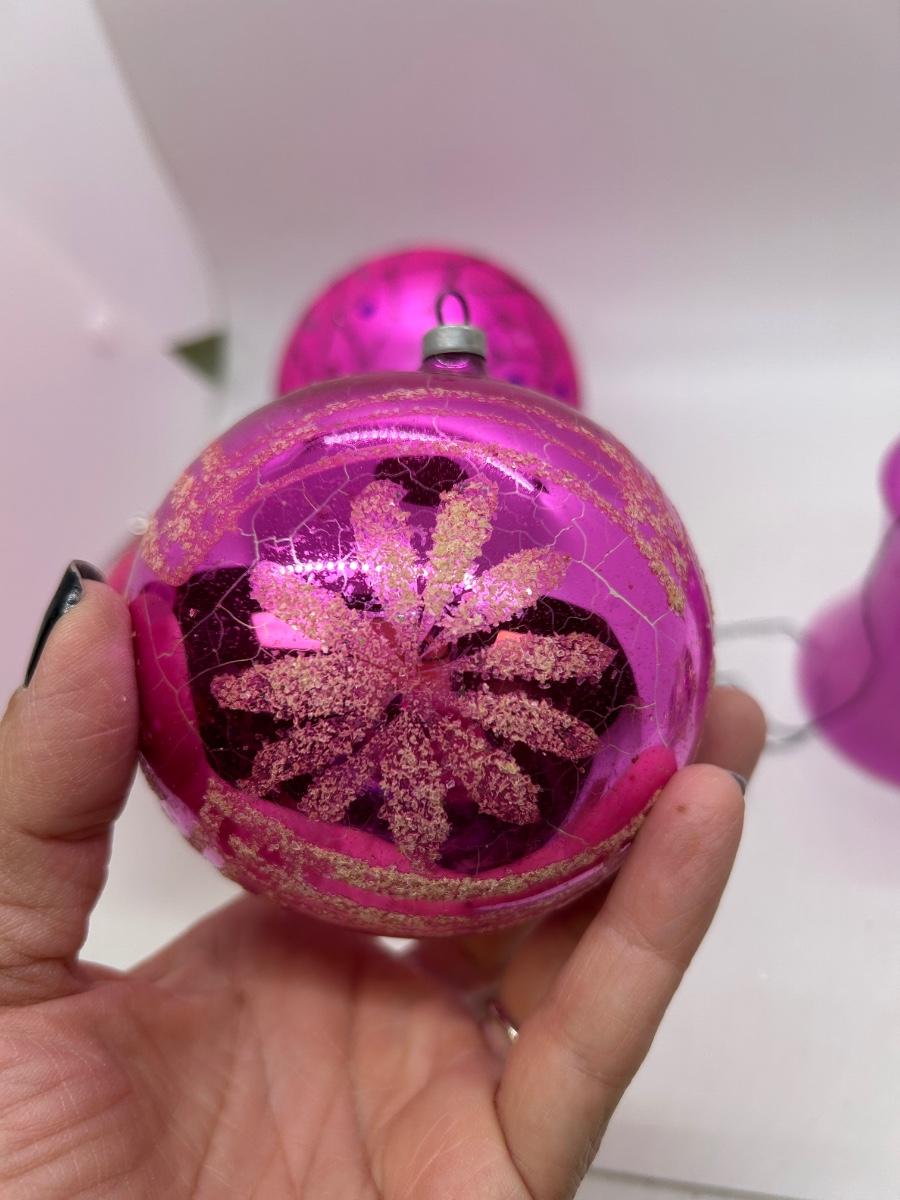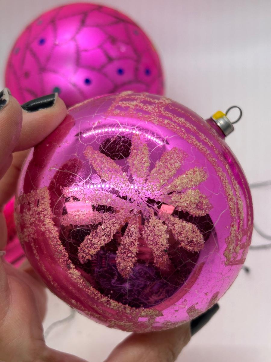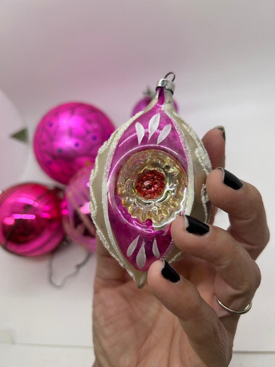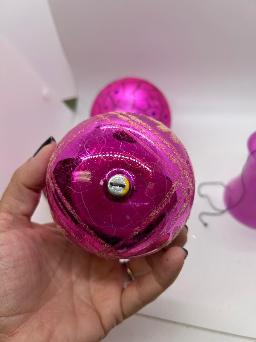 Mixed Style Lot of Vintage Pink Blown Glass Christmas Holiday Tree Ornaments. In vintage condition. Wear from age. The wire wrapped ornament and the indent one have the most wear and damage, see photos.