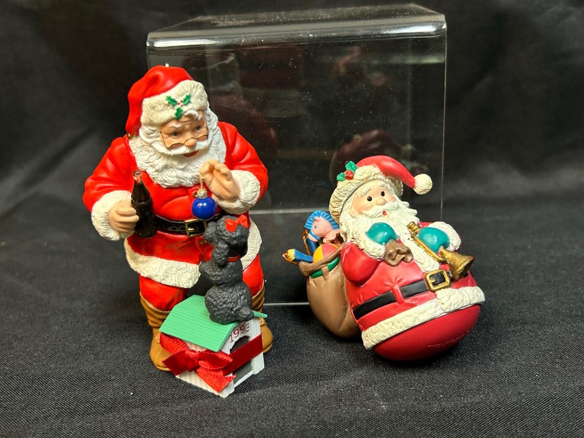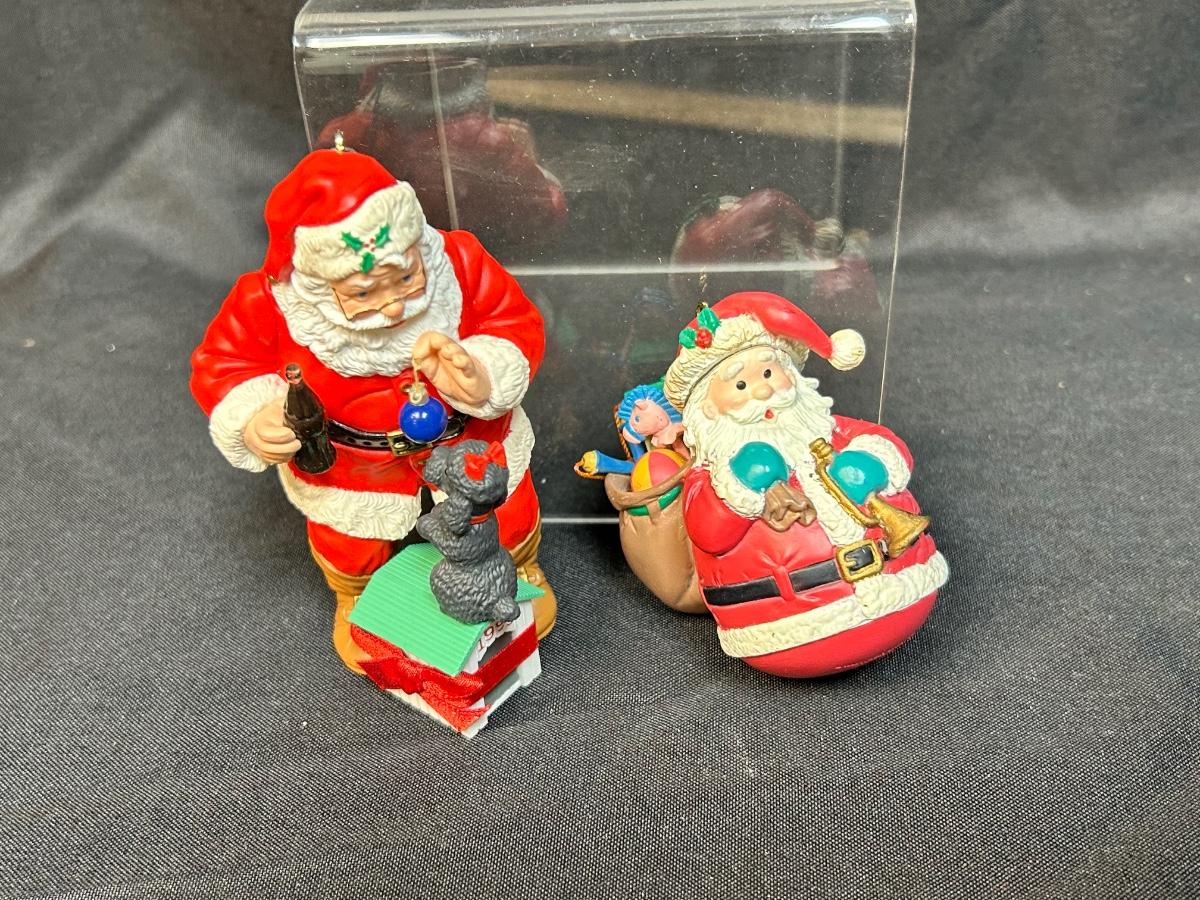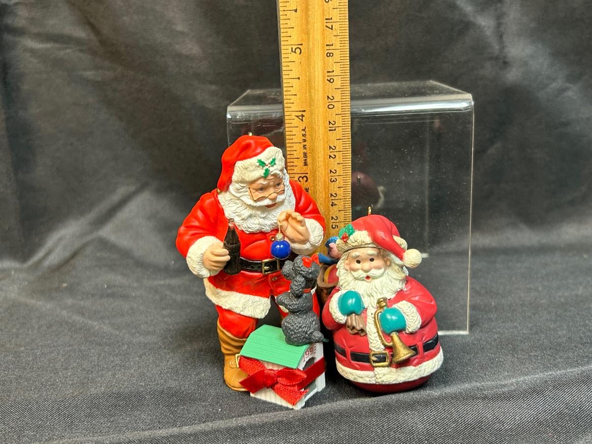 Pair of Hard Plastic Santa Claus Tree Ornaments Coca Cola Lustre Fame Early 90s. In good condition.