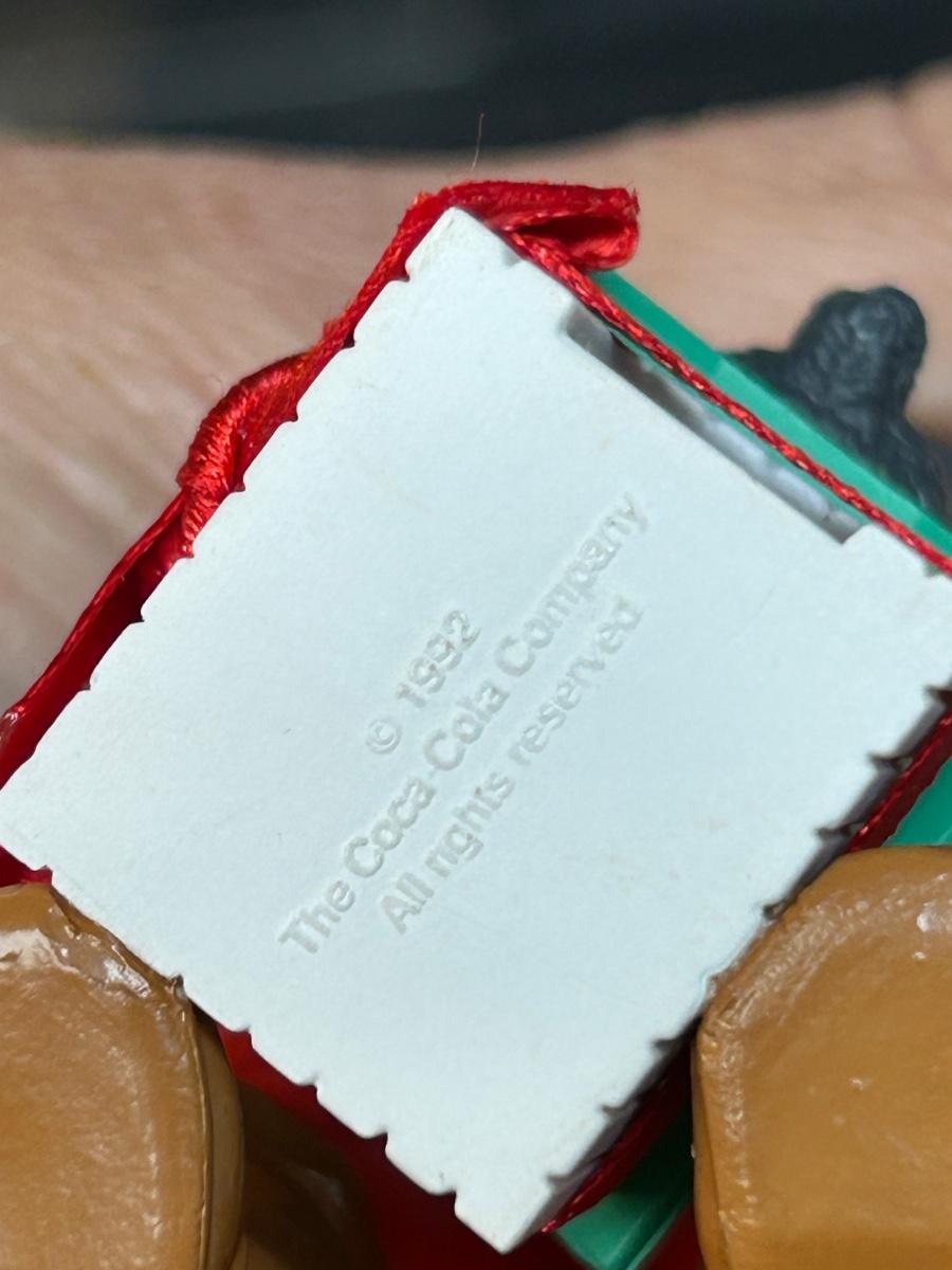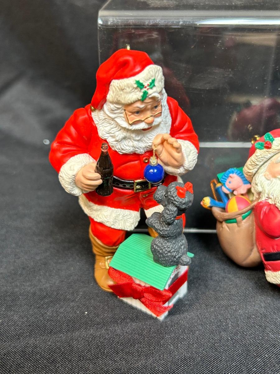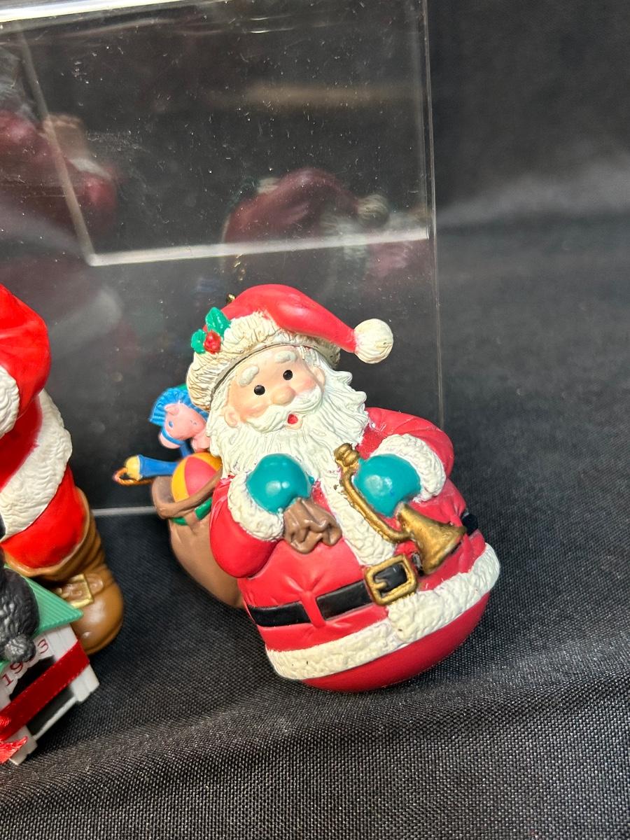 Pair of Hard Plastic Santa Claus Tree Ornaments Coca Cola Lustre Fame Early 90s. In good condition.