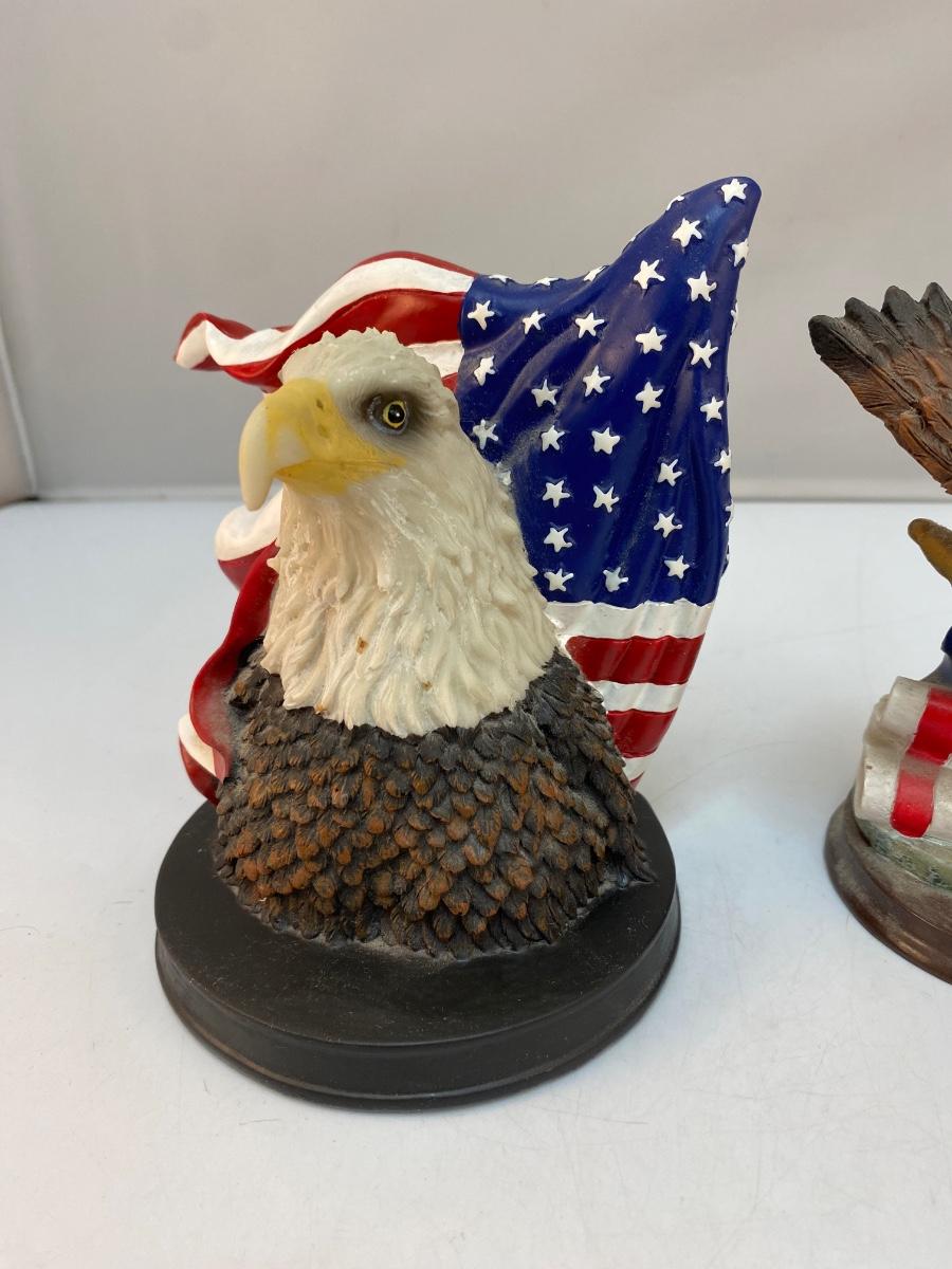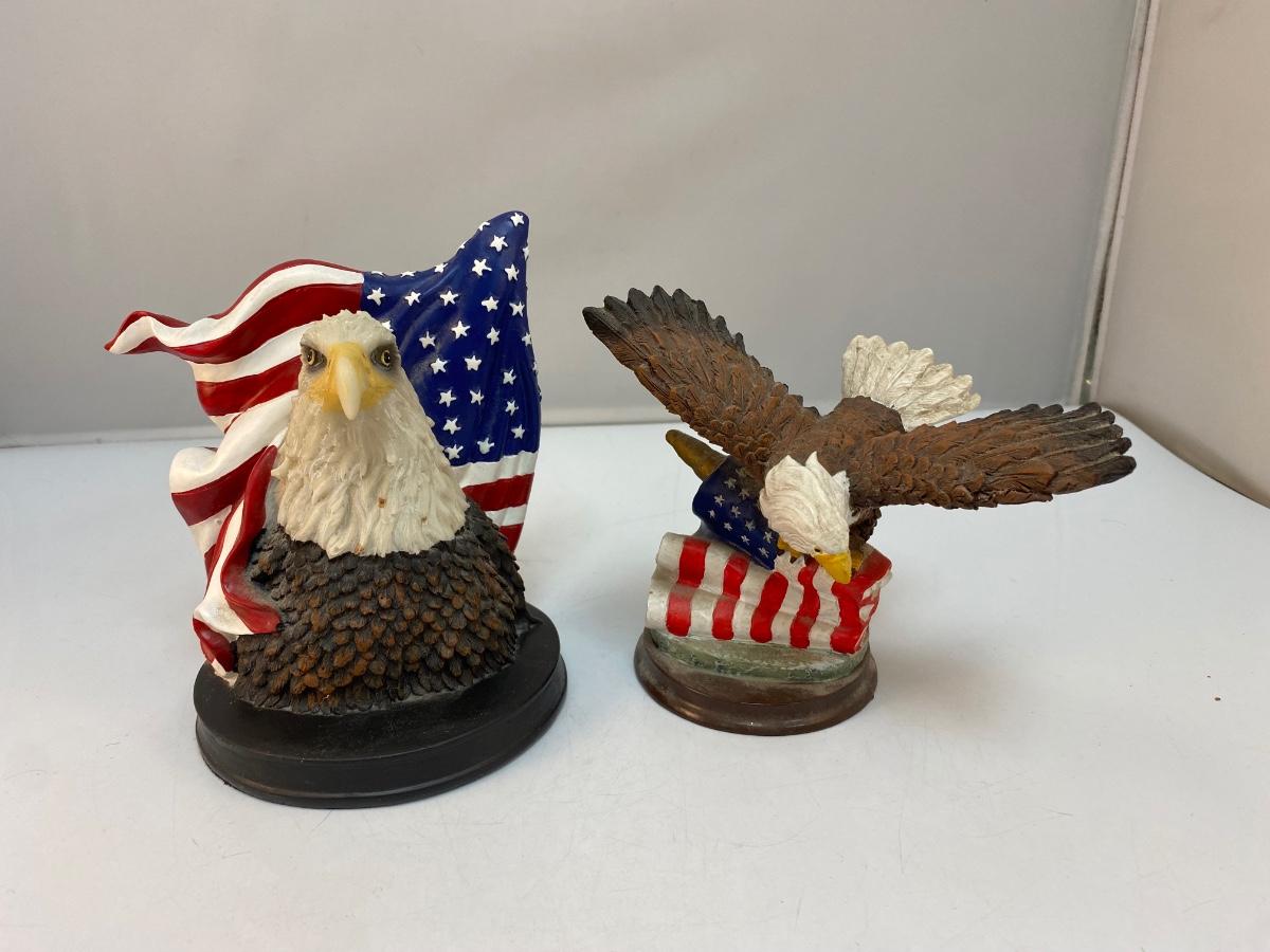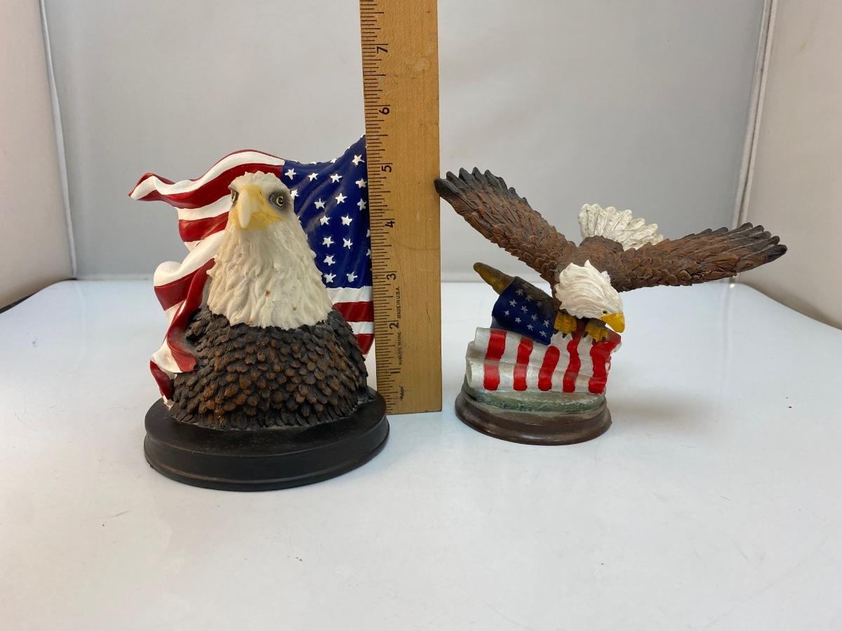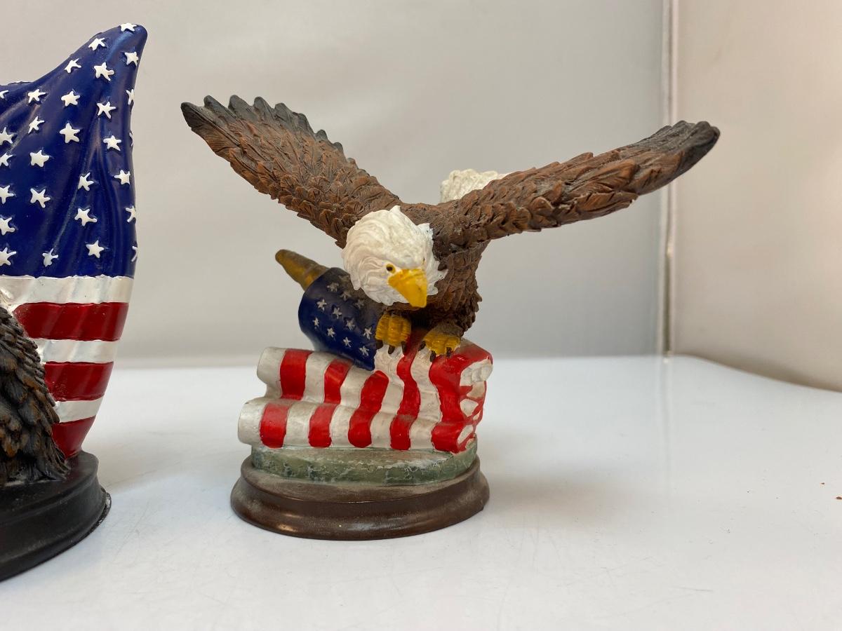 Pair of Resin Patriotic Bald Eagle American Flag Statuettes Figurines. Both are in good, displayed condition. About 6" size.
