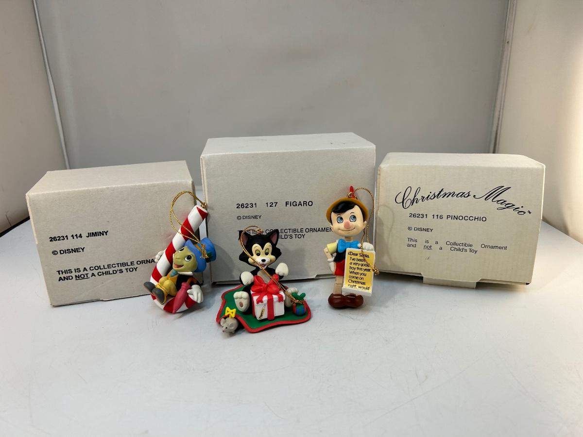 Walt Disney Christmas Magic Holiday Tree Ornament Figurines Pinocchio Figaro Jiminy Cricket. All in good condition. Come with original boxes. Made of hard plastic, under 4" size.
