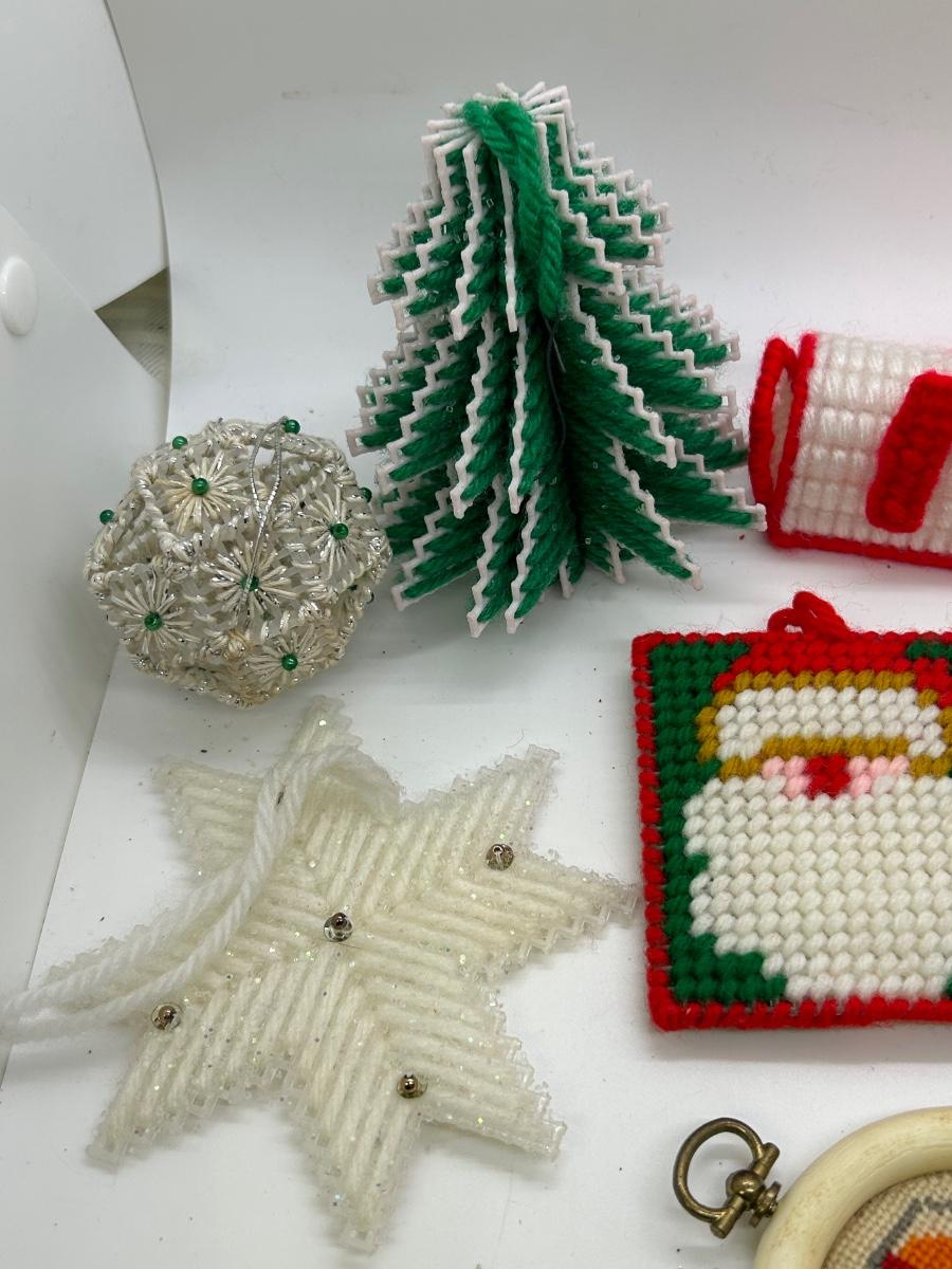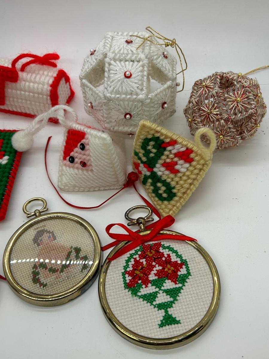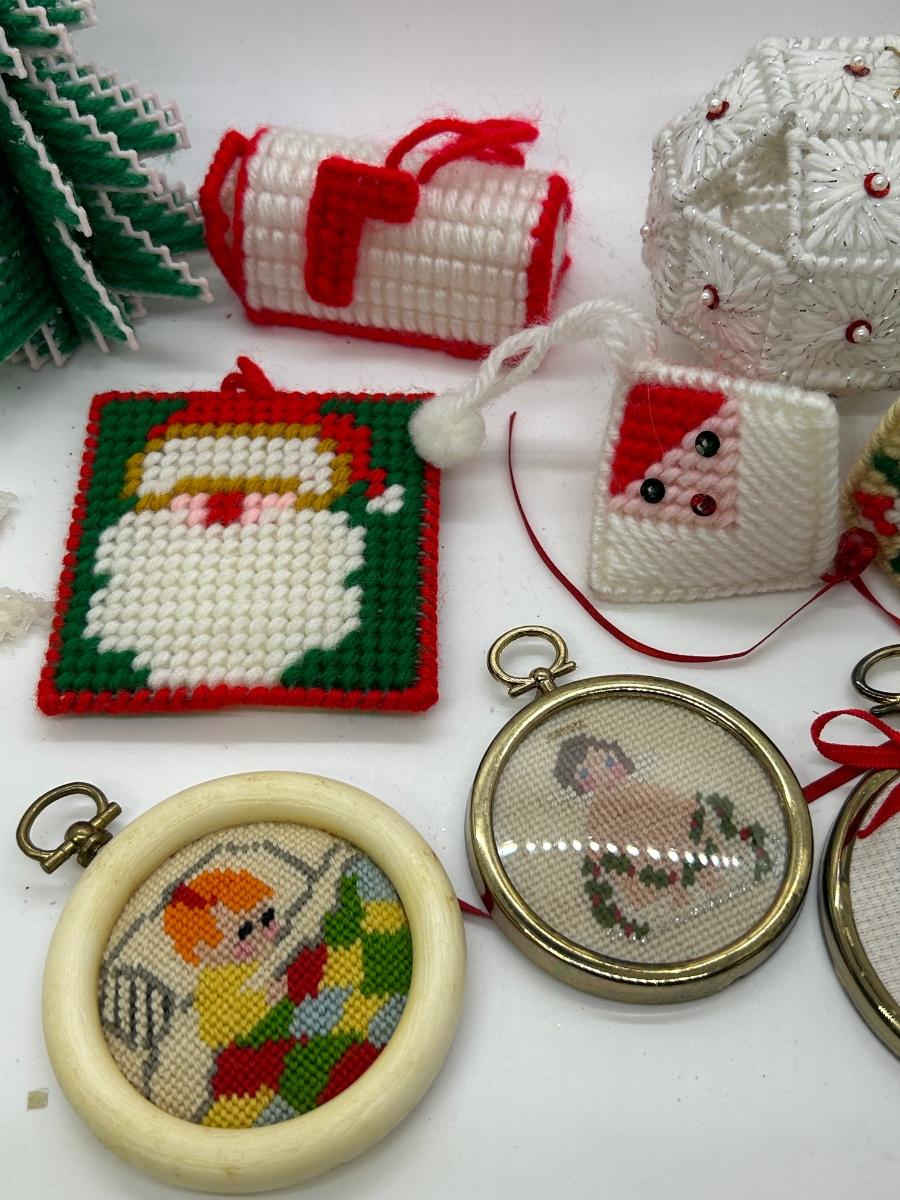 Mixed Lot of Retro Cross Stitch Needlepoint Christmas Holiday Tree Ornaments. In good previously displayed condition.
