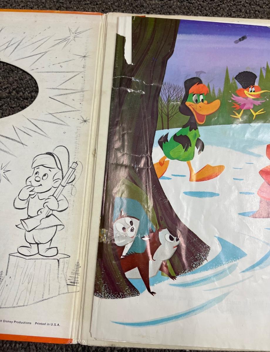 In fair used condition with lots of scratches, split edge on cover, small tears on pages inside gatefold book.
