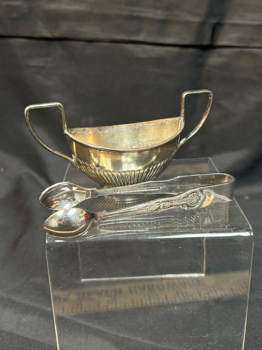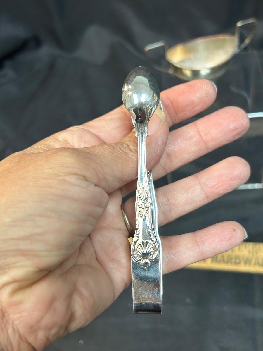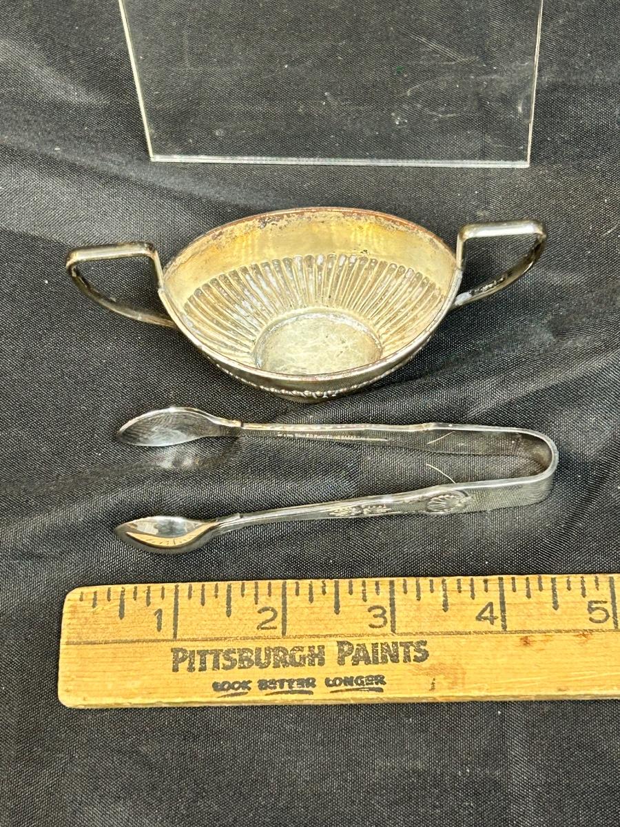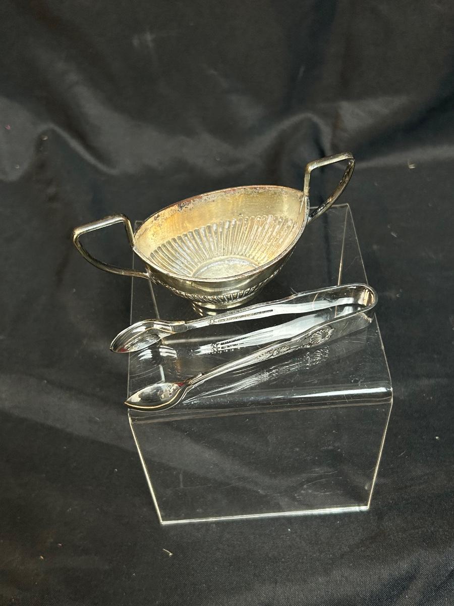Vintage Antique Silver Plate Master Open Salt Cellar and Sugar Cube Tongs