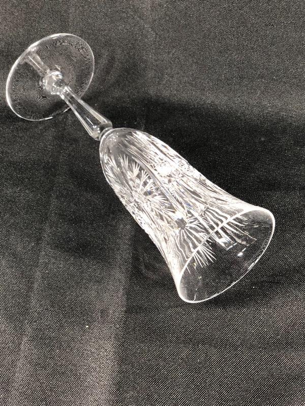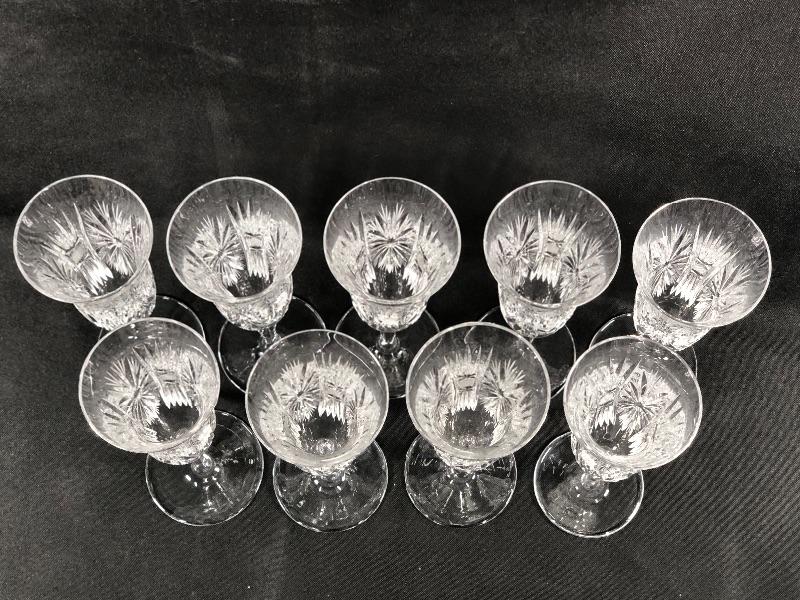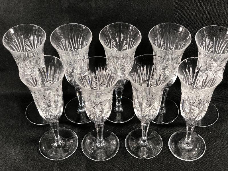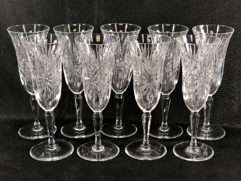 Set of 9 cut crystal champagne glasses. Beautiful cut design. May be a tiny nick in an edge. #24-30039