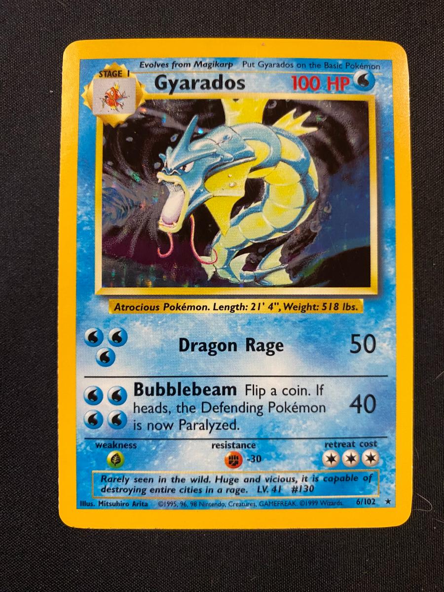 This is a Gyarados hologram card from the Pokémon Base Set. It has 100 HP and features Dragon Rage and Bubblebeam attacks. This card, numbered 6/102, is from the original Base Set and printed by Wizards of the Coast. The condition is described as light play, with some minor wear expected from regular handling. The reverse side showcases the standard Pokémon card back design.