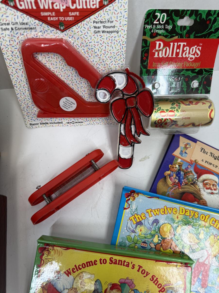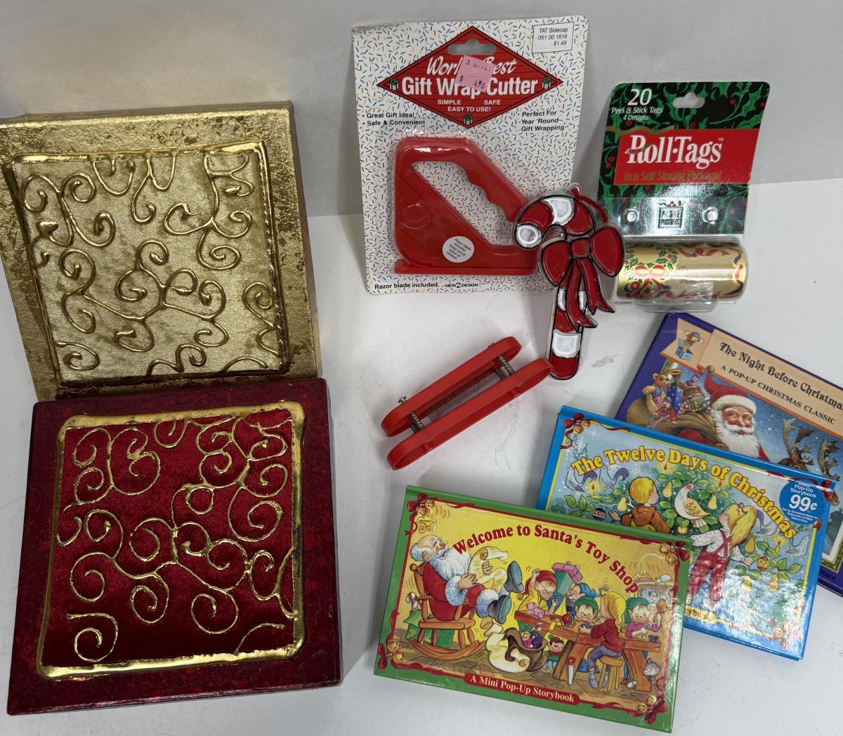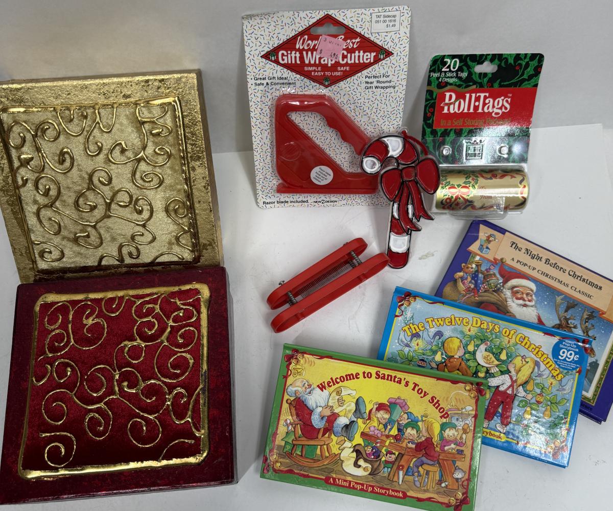 Christmas gift wrapping Lot - two empty boxes, ribbon shredder, paper cutter, name tags, Pop-up books
