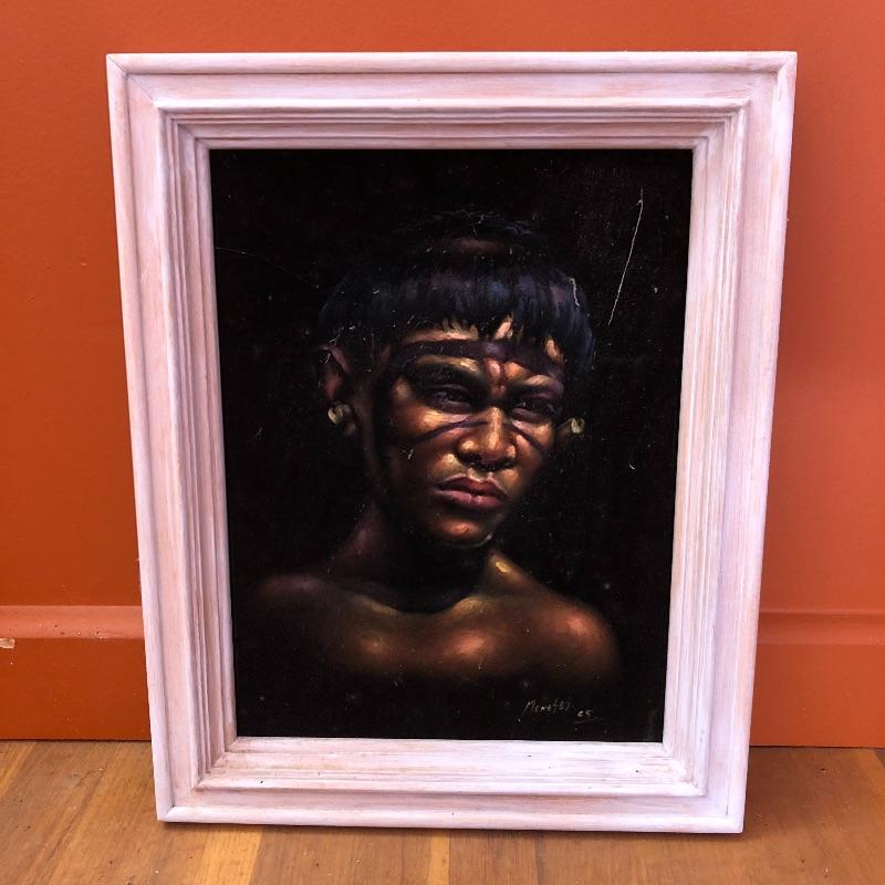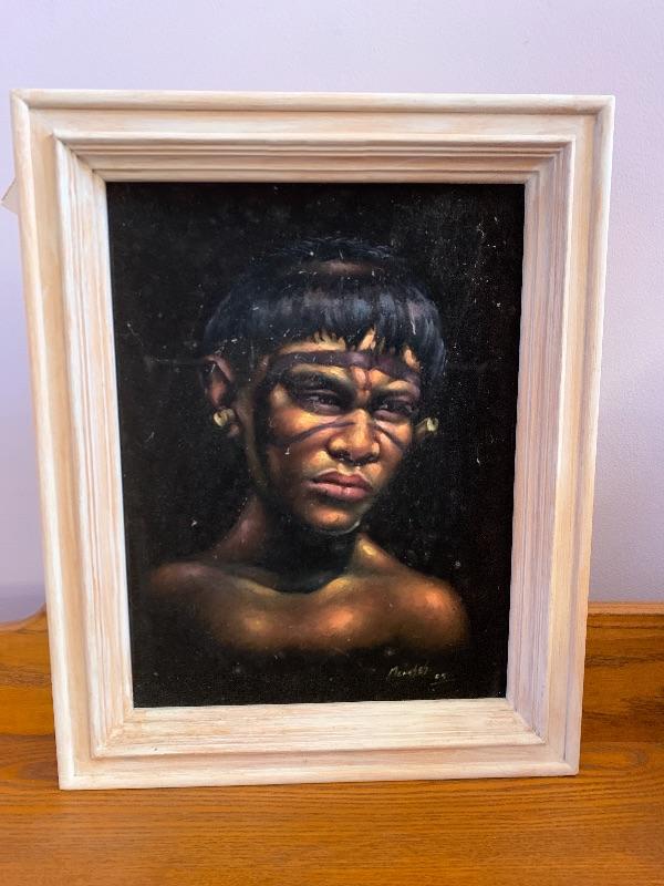 This beautiful painting on black velvet depicts a Native person. It is in a wooden frame and is dusty. Shipping Available. Shipping Art can be costly please call UPS store at 828-252-6930 for quote.