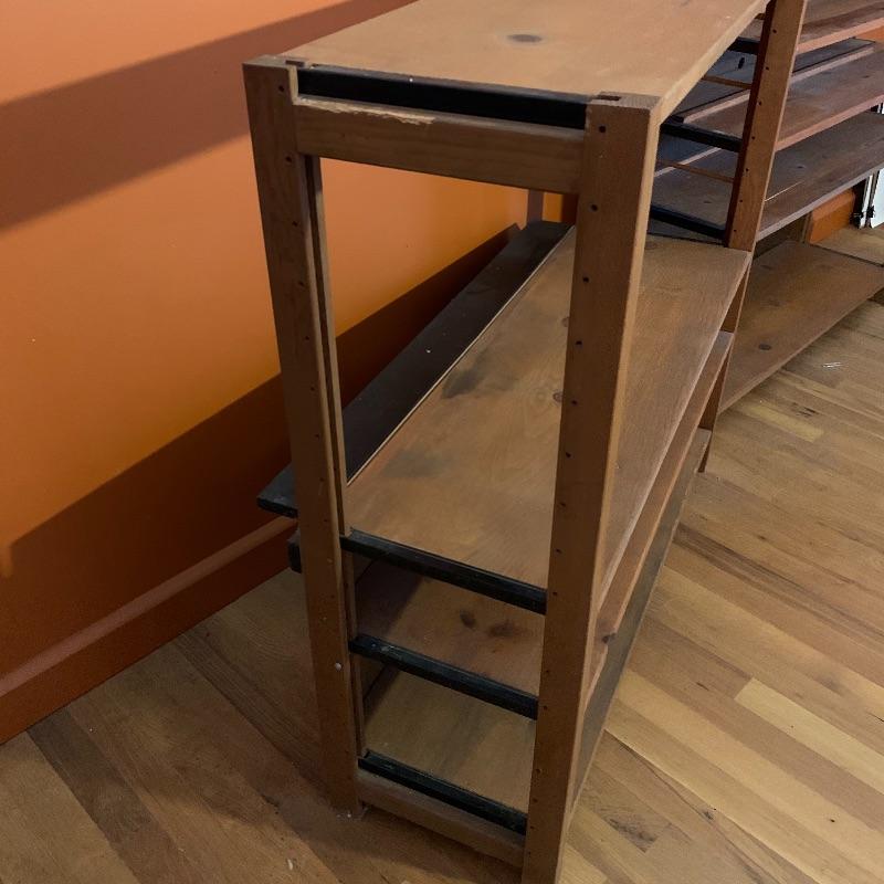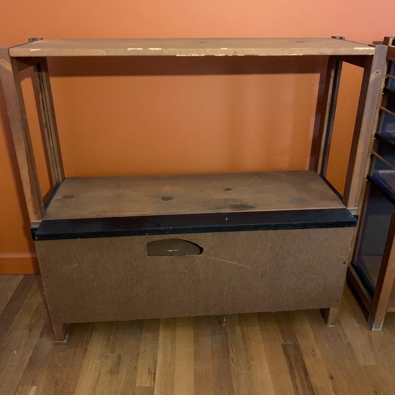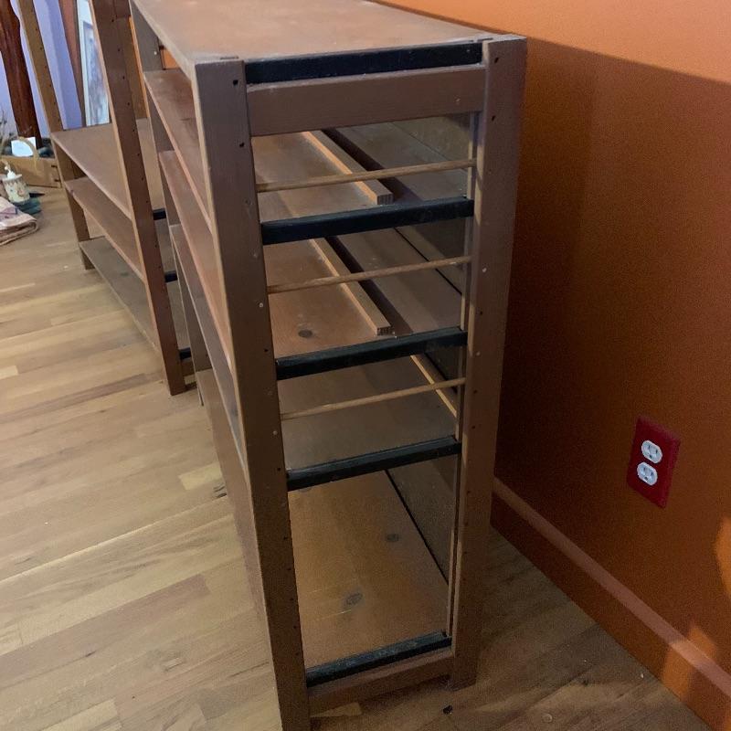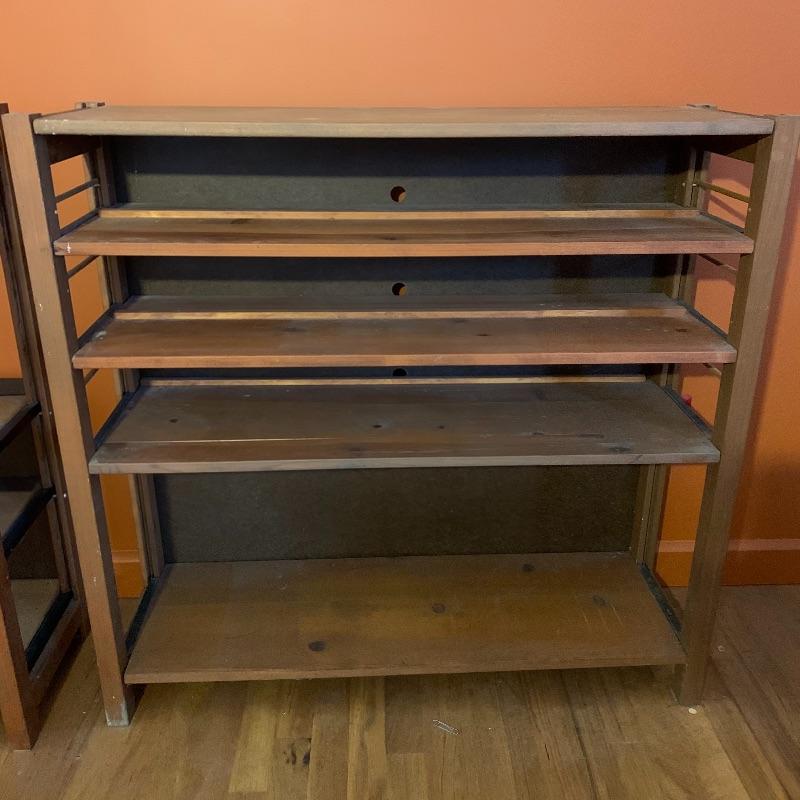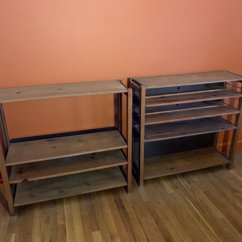 This lot contains two beautiful all wood with metal framing adjustable shelves that can be used for many different things! You can use them to store books, collectibles, put a TV on them, and more! The shelf on the left (37” x 12” x 36”) has four shelves, including the top level, and the shelf unit on the right (37” x 12” x 35.5”) has five shelves including the top level. They both have some very minor stains, and the right shelf has a hole in the backing, as well as some minor peeling in the back. The left shelf has no backing at all. Local pickup only.