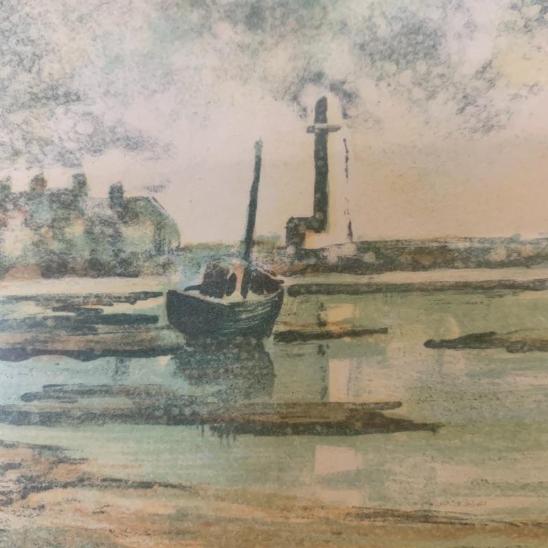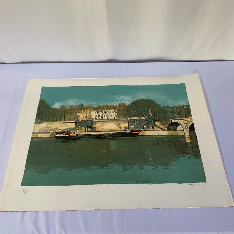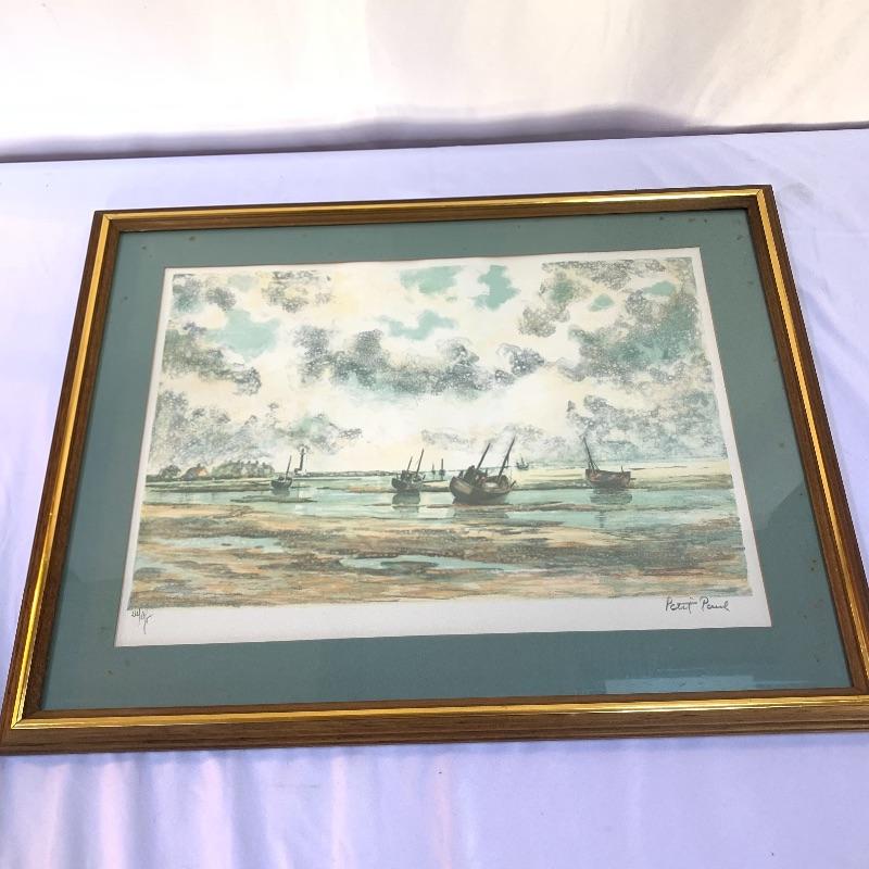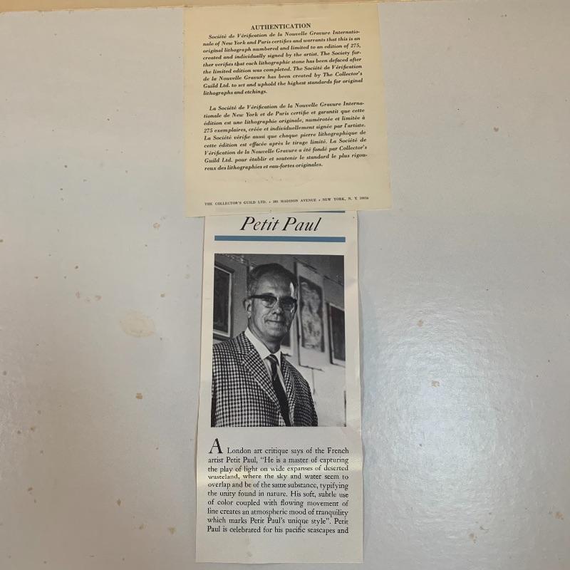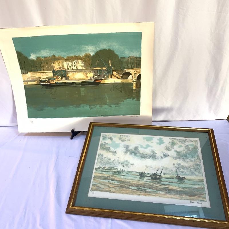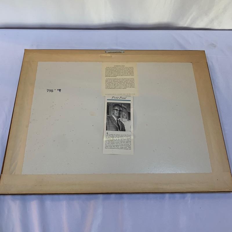 This lot contains two beautiful pieces. The first is a framed and matted piece measuring 25” x 19”by Petit Paul, and depicts ships in a bay. It is a signed and numbered lithograph with COA on the back of frame. The second item in this lot is an unframed Roger Forissier print that also appears to depict a ship on the water, and also comes with a small informational article about the artist. This print is also signed and numbered but no COA has been found. Shipping available.