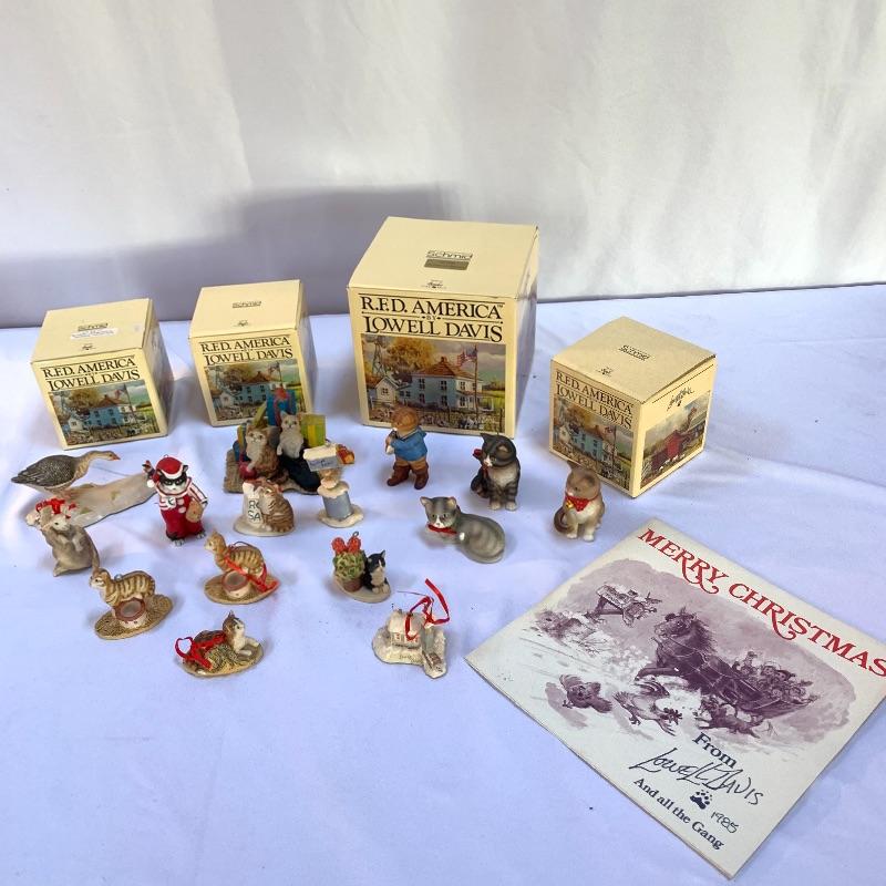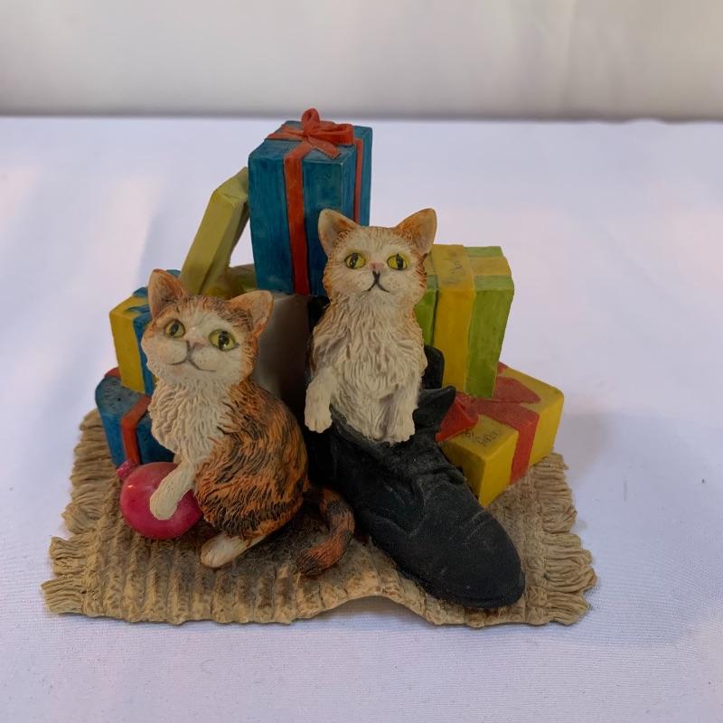 Calling all Christmas fanatics!! This lot contains 15 small cat Christmas-themed figurines. It depicts the cats doing things such as sitting next to presents, wrapped in a bow or wreath, and more! The goose with the small mouse called “The Arrival of Stanly” measures 5” x3” x2” and has a box. Only a few have boxes and most are smaller than this one and can be ornaments or figurines. Lot also comes with a Christmas record from Lowell Davis, which can be used for decoration, or if you have a record player you can play it! Shipping available.