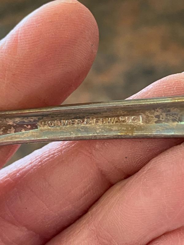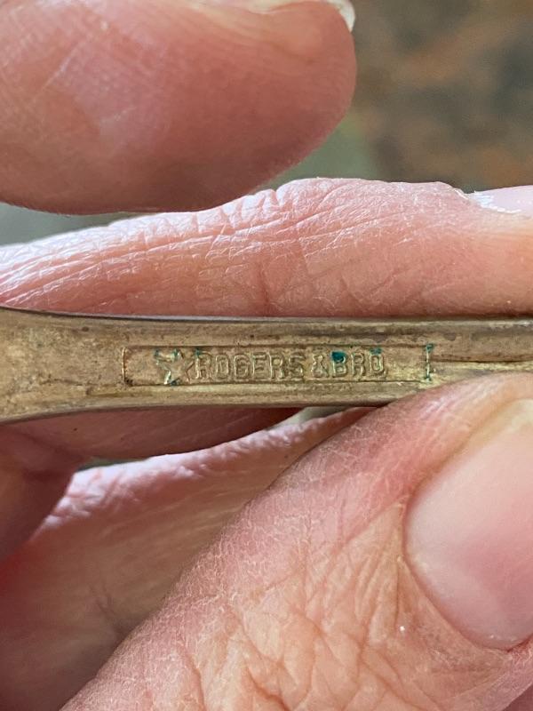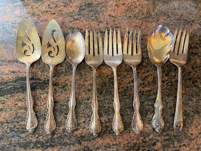 8 large serving utensils. Silverplate, need to be cleaned.