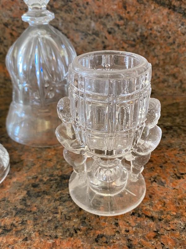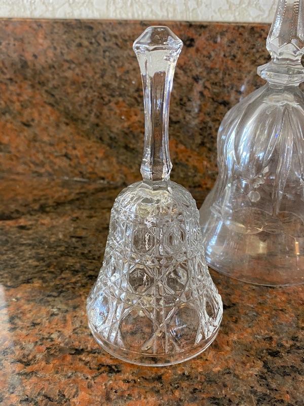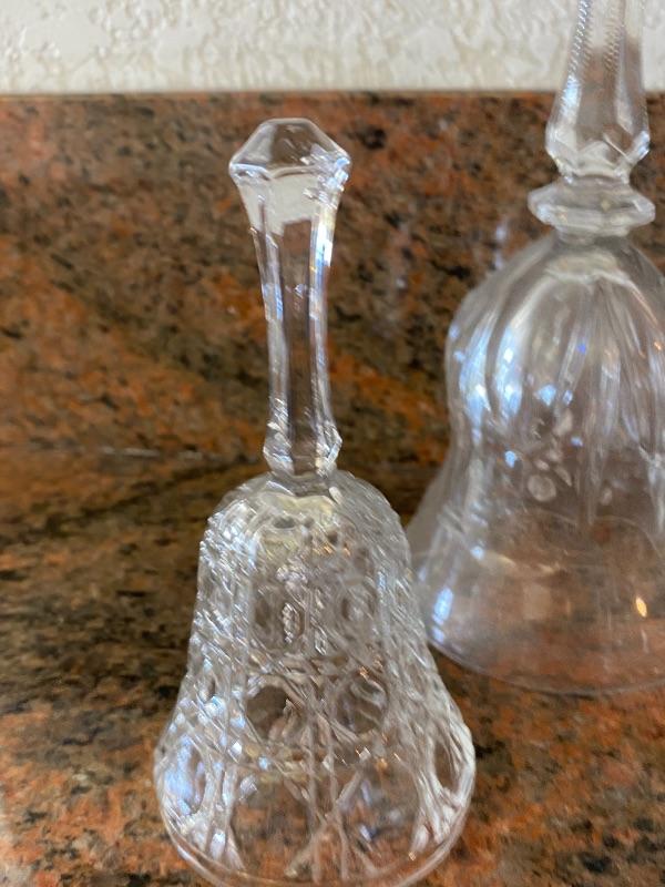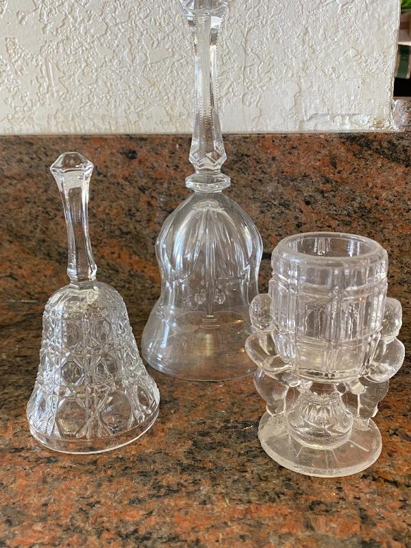 Pair of crystal bells and a glass toothpick holder. Good condition, a little dusty from display.