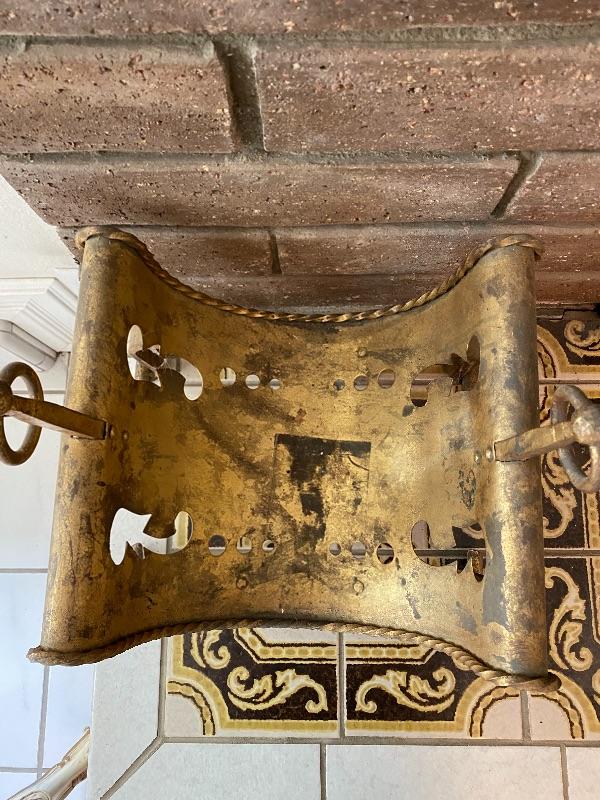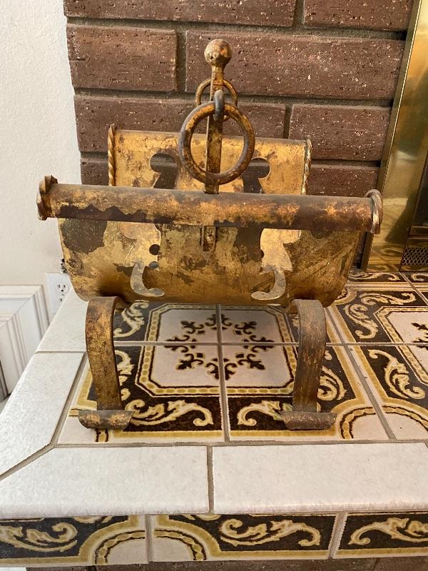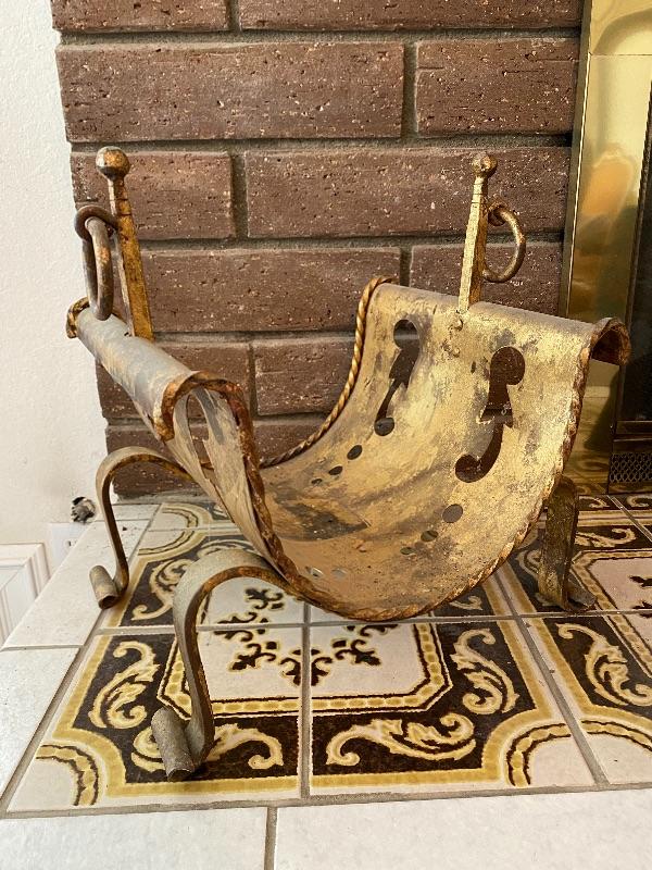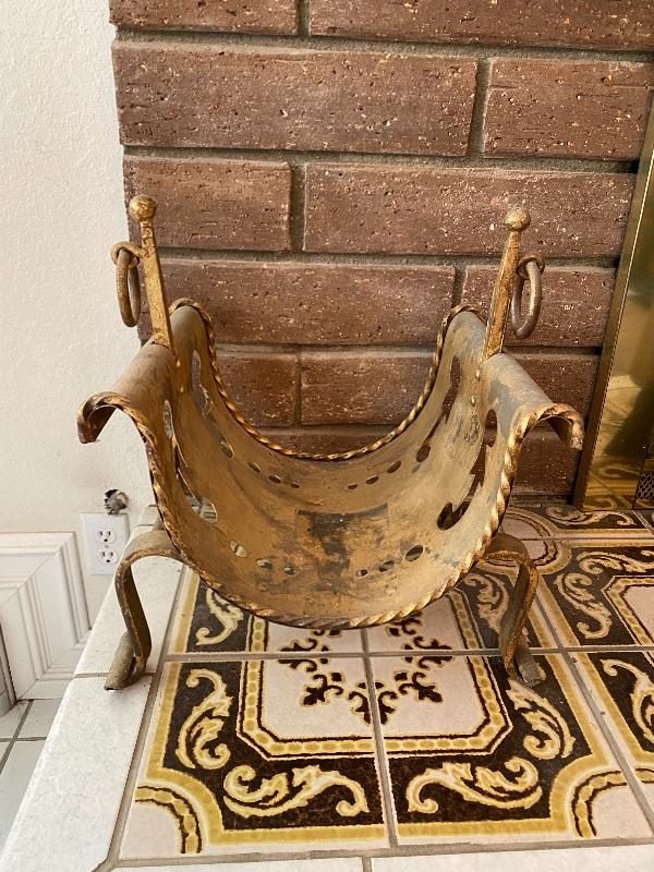 Vintage fireplace log holder. Heavy metal, unsure if it is solid brass or plated cast metal. Needs to be cleaned up. Great curved design.