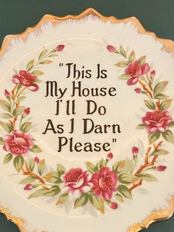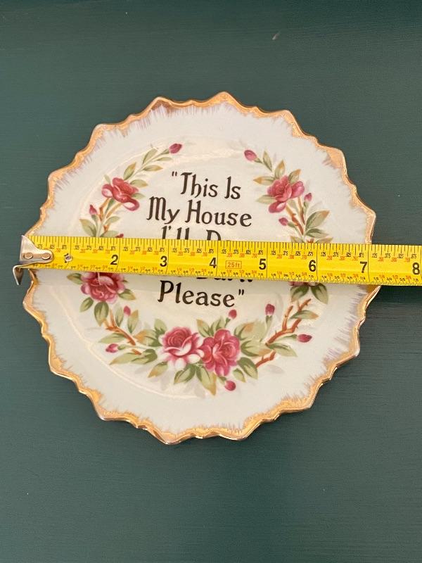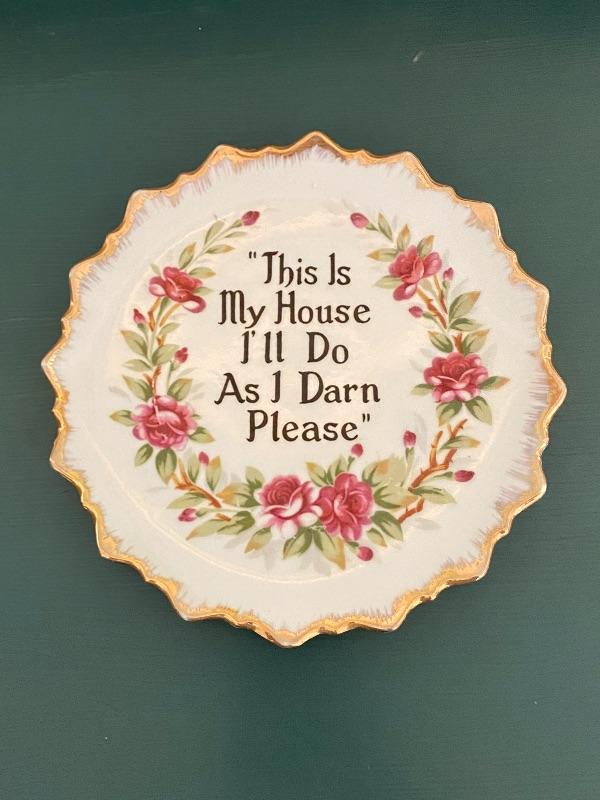 Vintage floral plate. Has the quote "This Is My House I'll Do As I Darn Please" written in the center. Gold edging. About 7" size.