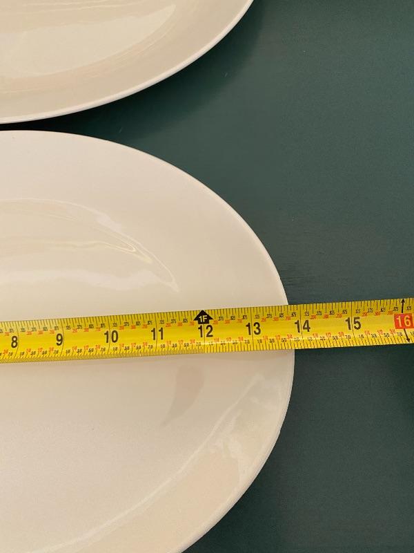 Set of 4 plain white oval dinner plates. Heavy. About 14" wide. Great as serving platters.