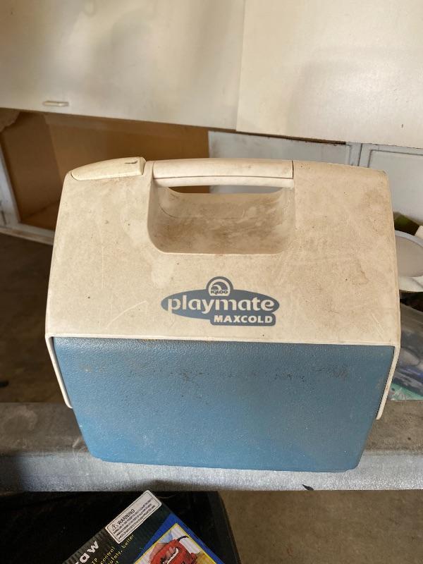 Pale blue Playmate Max Cold ice chest. Six pack size. Dirty from garage and light signs of use.
