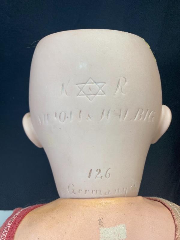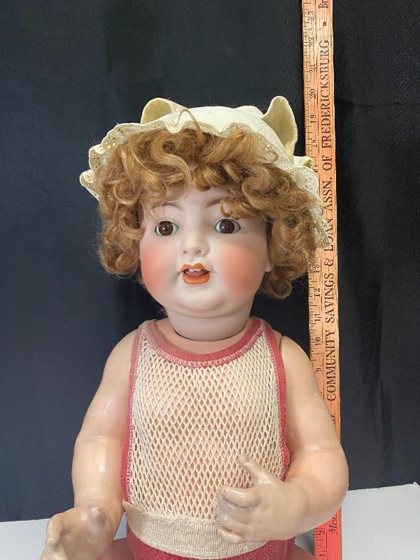 Antique K⭐R Simon & Halbig 126 doll. Bisque head marked by maker & Germany 62 at bottom. Composition baby body. Head and body look kinda odd together but they did make this head and body together. Brown sleep eyes, soft tongue. Pencil marks inside head, possibly repainted. Wearing a vintage bathing suit. Composition has discolor. Overall good condition, displays nicely, about 25" total length.
