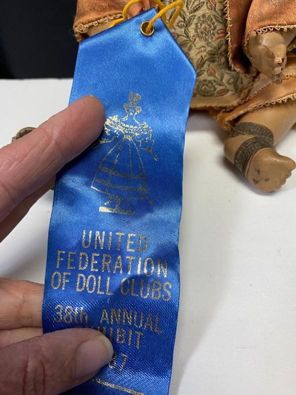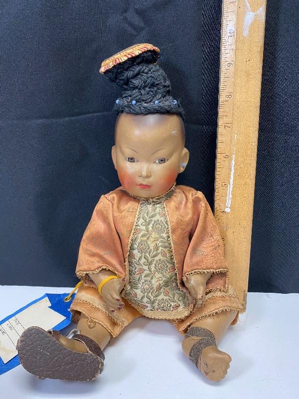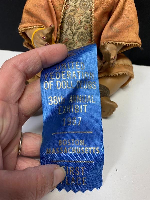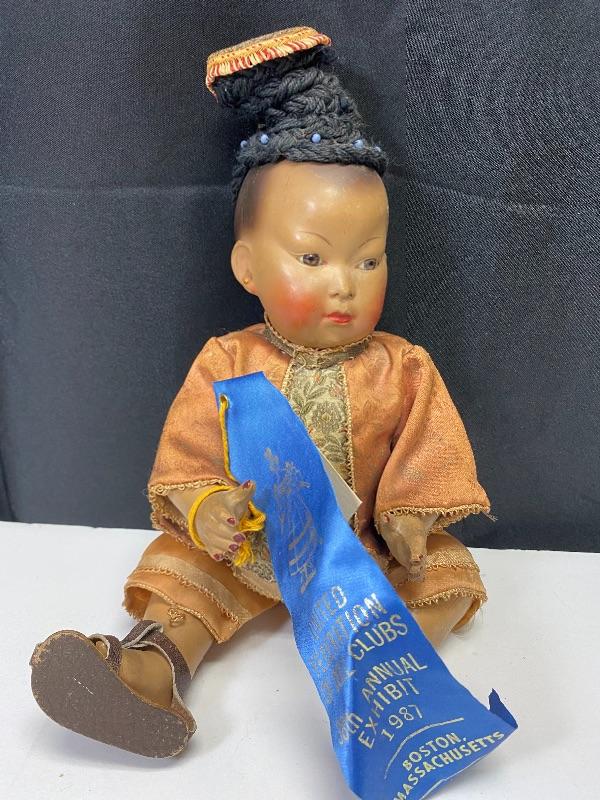 Antique Petitcollin Asian doll. Made in France, marked on back and head. Has a blue ribbon attached for 1st place in the 38th annual exhibit of the United Federation of Dolls Club, but there is no identifying marks on ribbon, may have come from another doll. From online search I believe the outfit is correct but the added hair and nail polish is not. Missing one shoe. In good condition, no major damage, wear to paint, some scuffs, and scratches. About 11" size