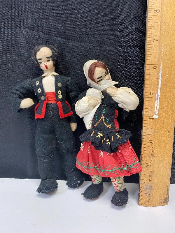 Pair of felt dolls. Spanish styled man and woman. Under 7" size. Wired inside making them bendable. Faces are stitched rather then painted. Display nice, do not stand alone though, need stand or lean against something. Light discolor to fabric.