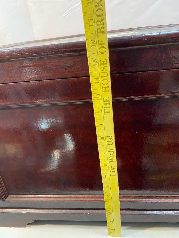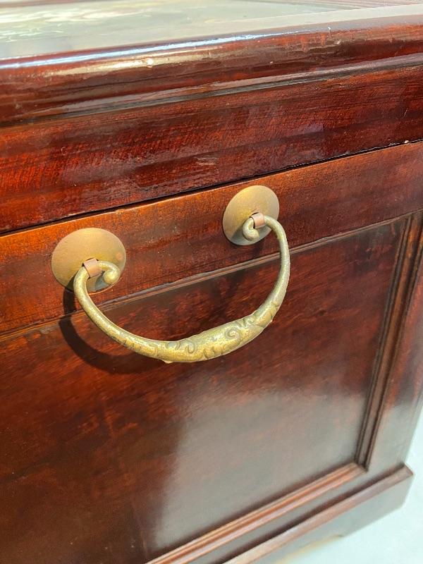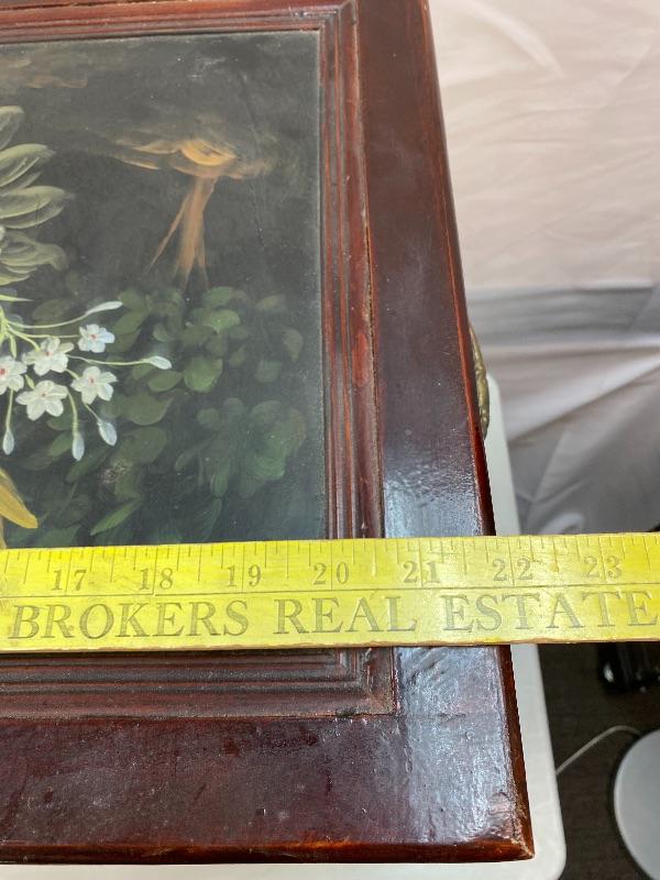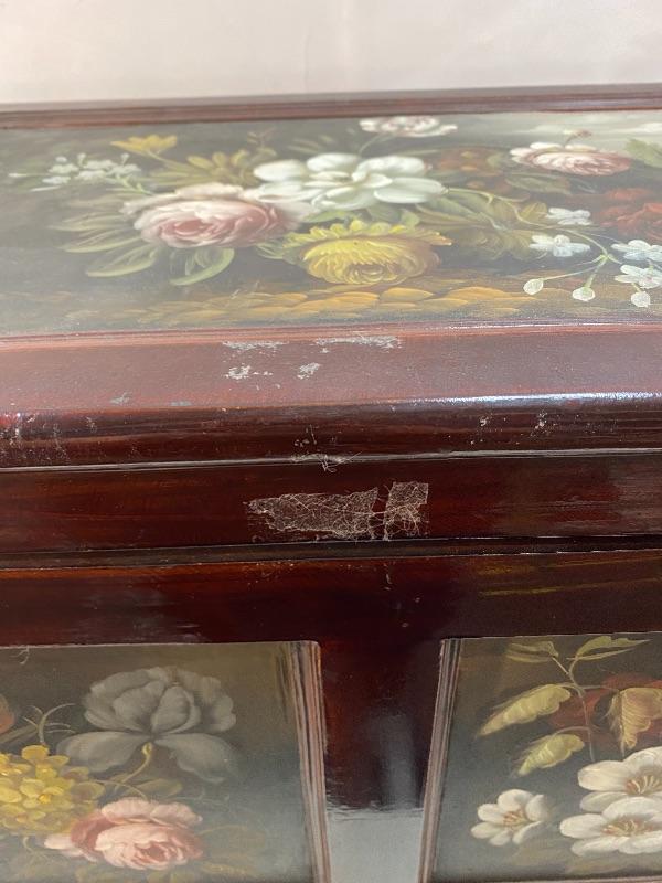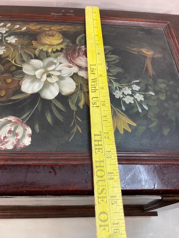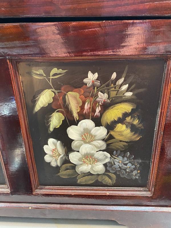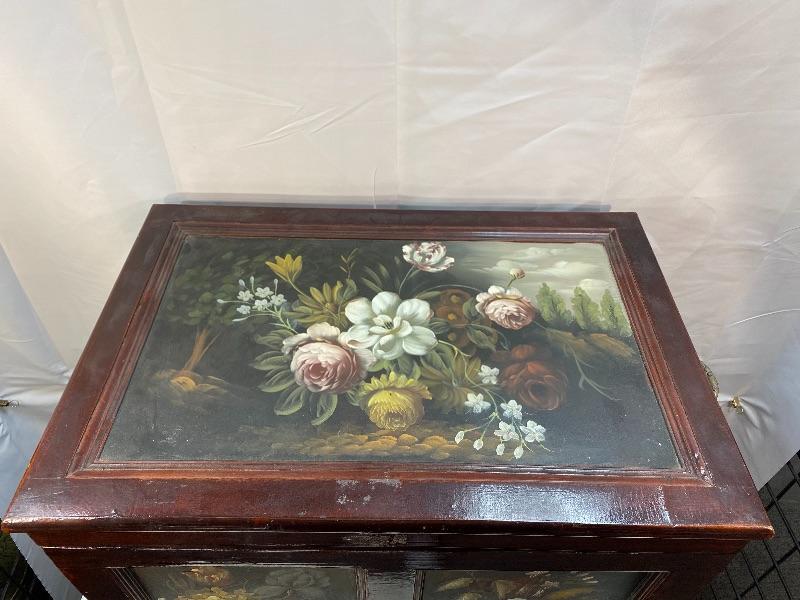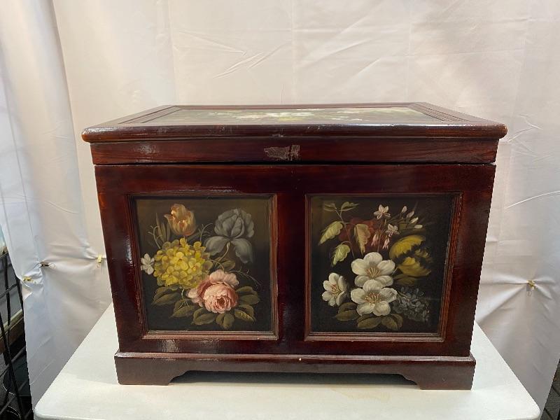Floral painted wood chest. Hinged lid and front have painted flowers. Not very heavy, thin wood. Signs of age. Measures 22"x16"x15".