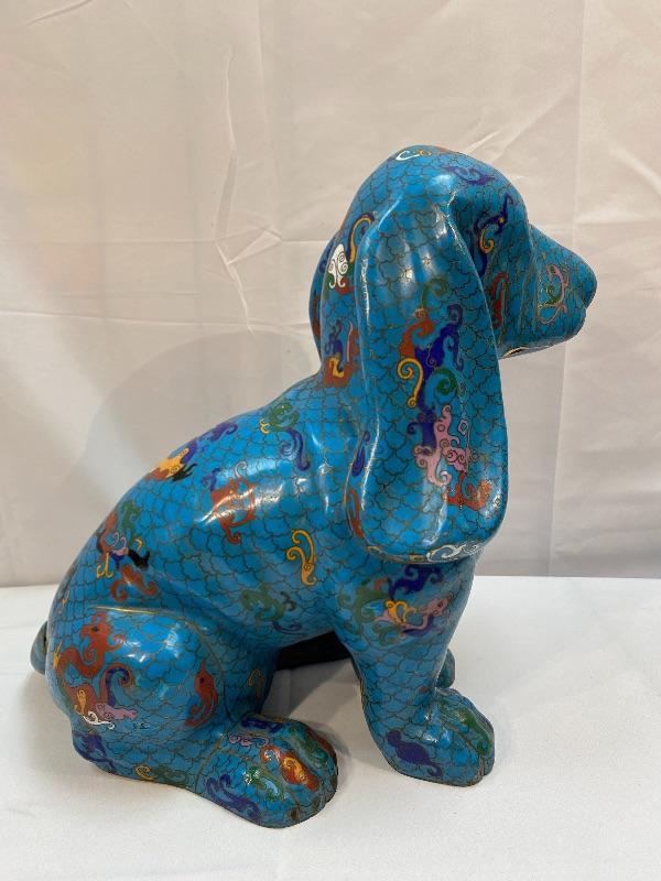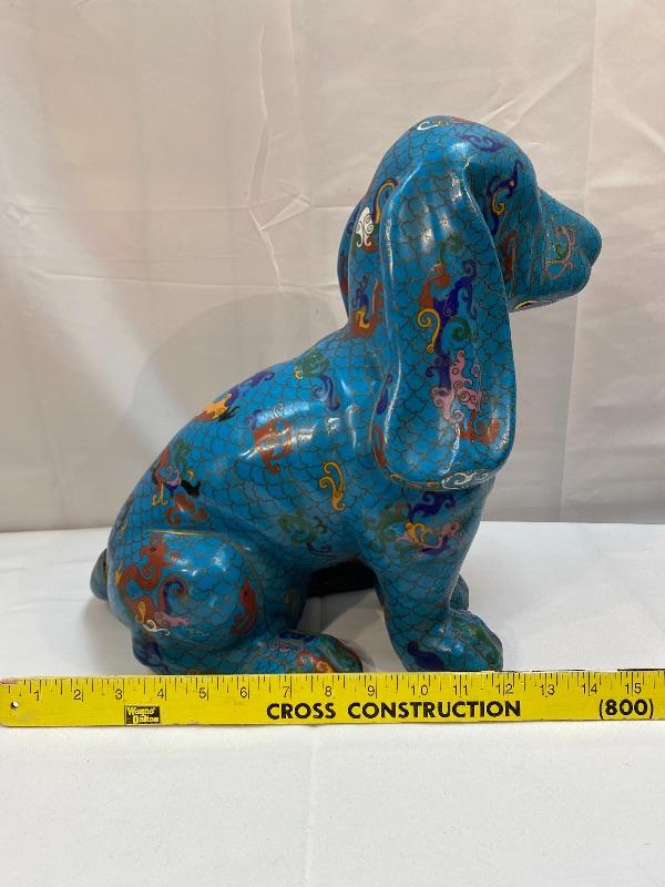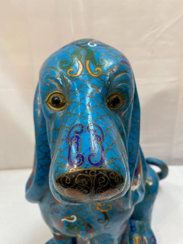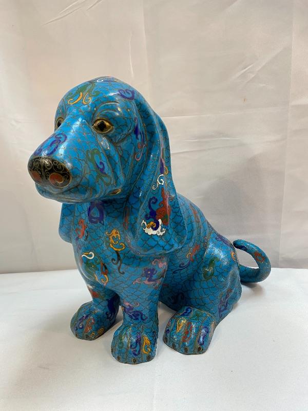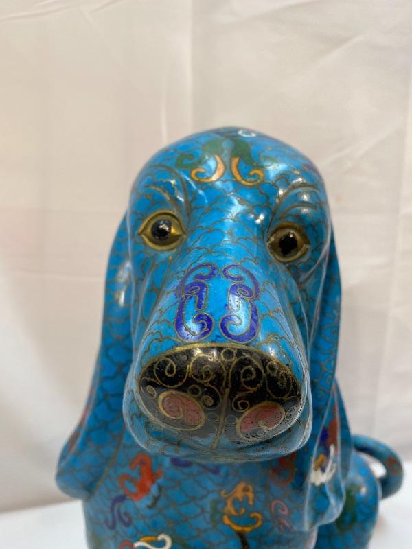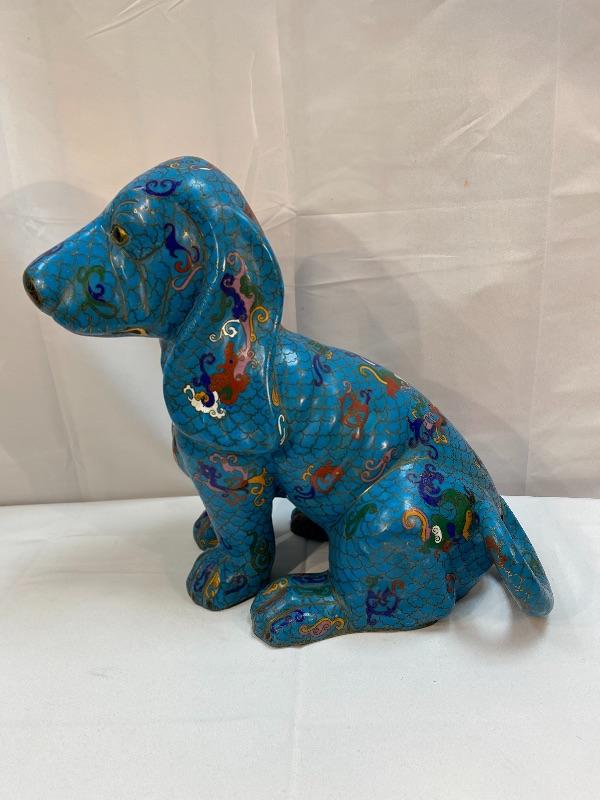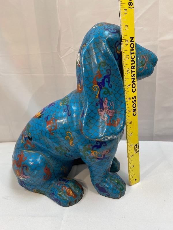 Large vintage dog cloisonne statue. Looks like a beagle or basset hound. Highly detailed cloisonne pattern. Blue scales with dragons all over. Heavy brass. Nicely done, only one spot noticed where there is enamel partially missing. Stands under 14" tall.
