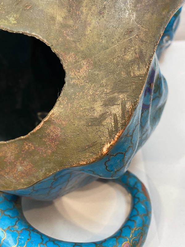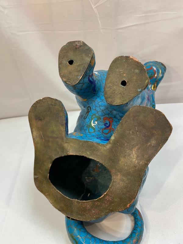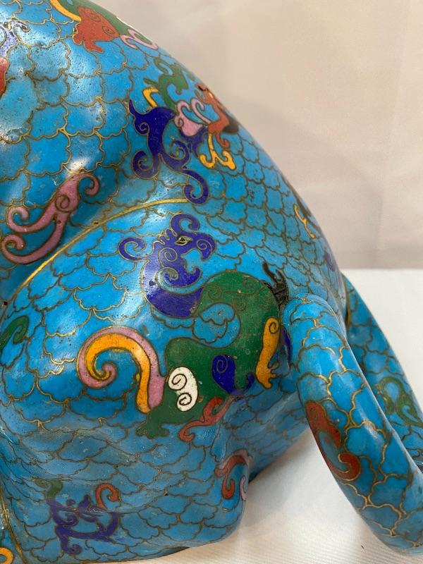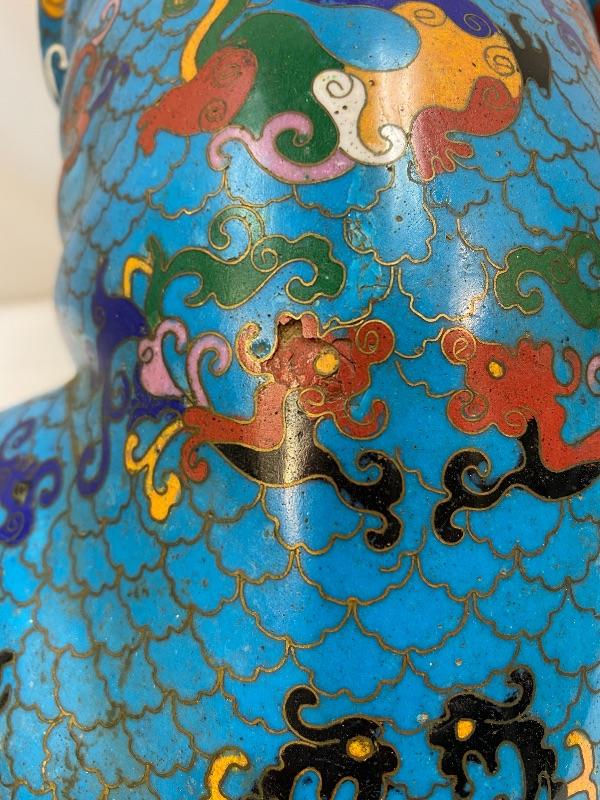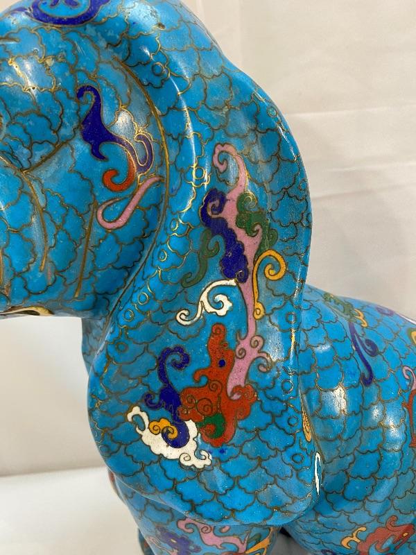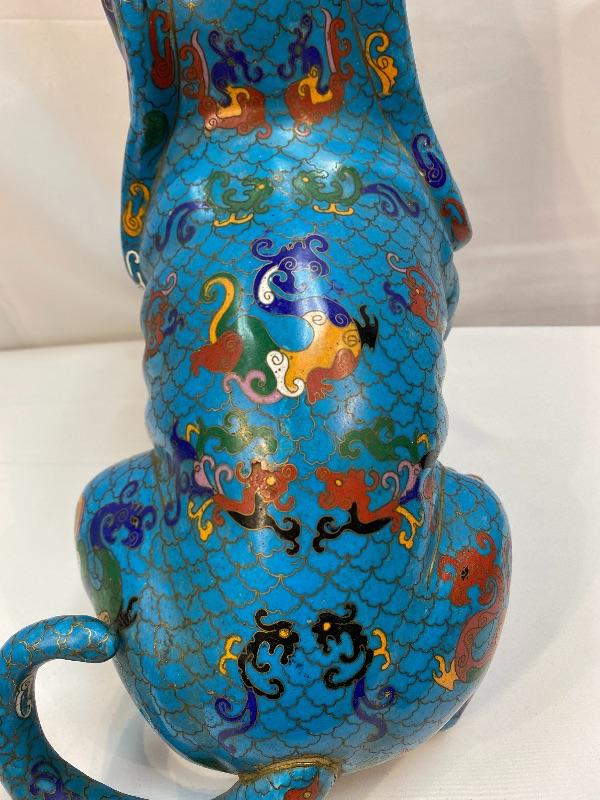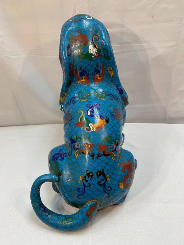Large vintage dog cloisonne statue. Looks like a beagle or basset hound. Highly detailed cloisonne pattern. Blue scales with dragons all over. Heavy brass. Nicely done, only one spot noticed where there is enamel partially missing. Stands under 14" tall.