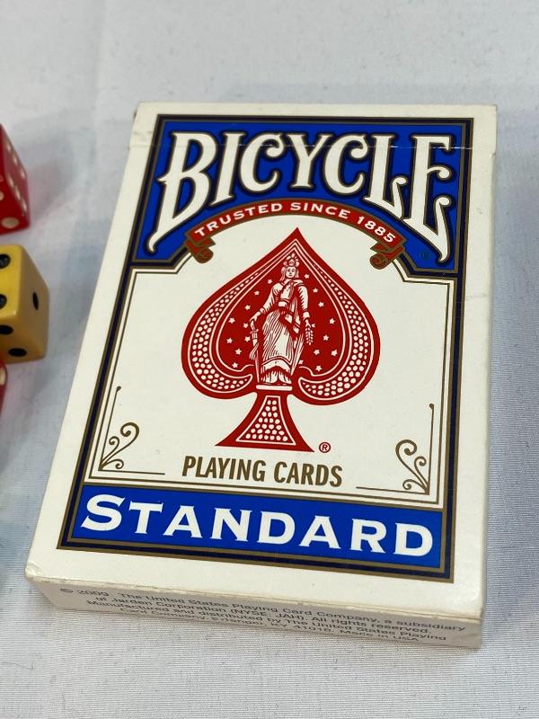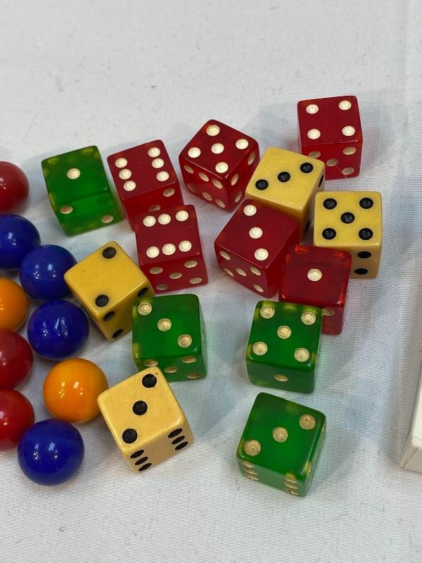 Mixed lot of game night items. Vintage dice, marbles and cards. Good conditions.