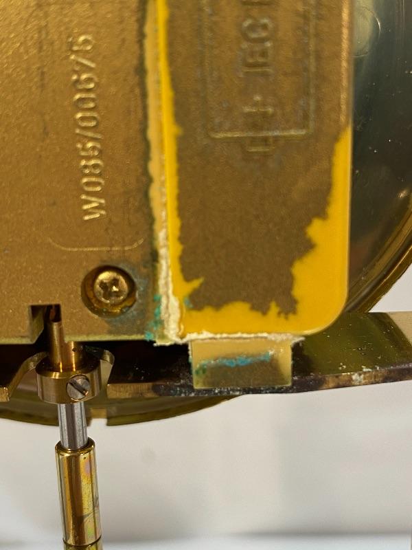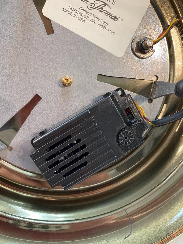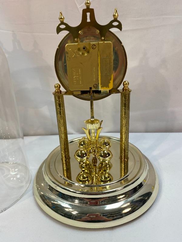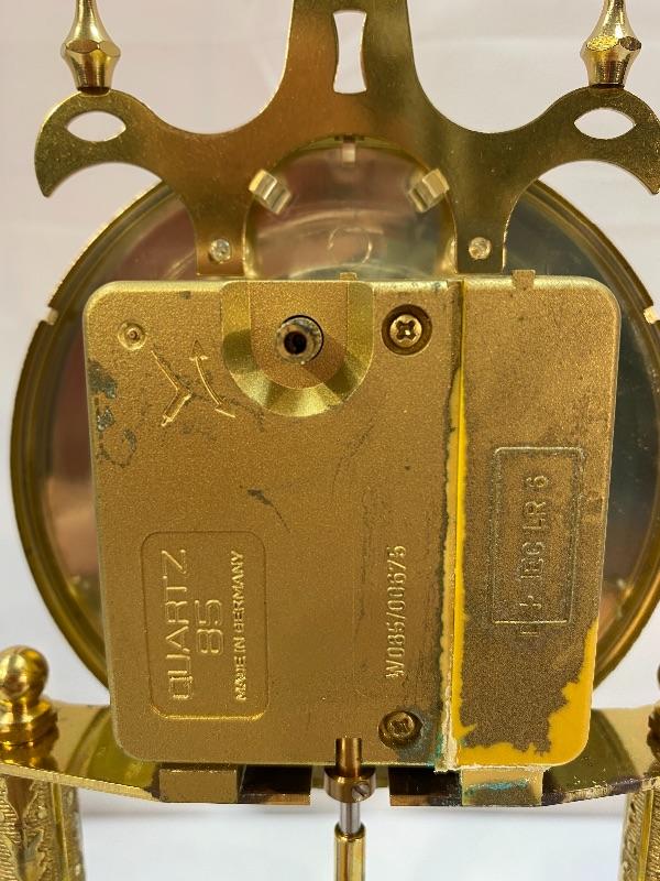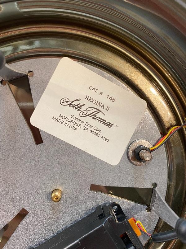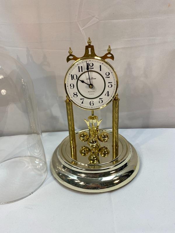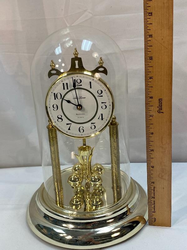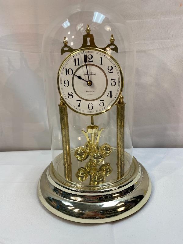 Seth Thomas table clock. Glass dome cover. Battery operated. Battery compartment looks a little corroded, did not open, currently not running. Plastic base.