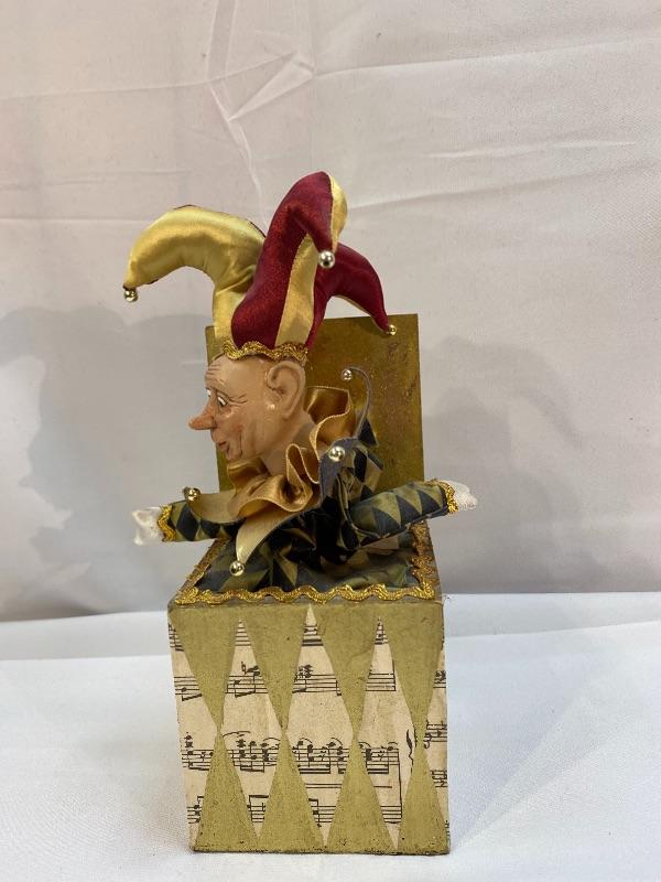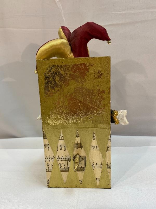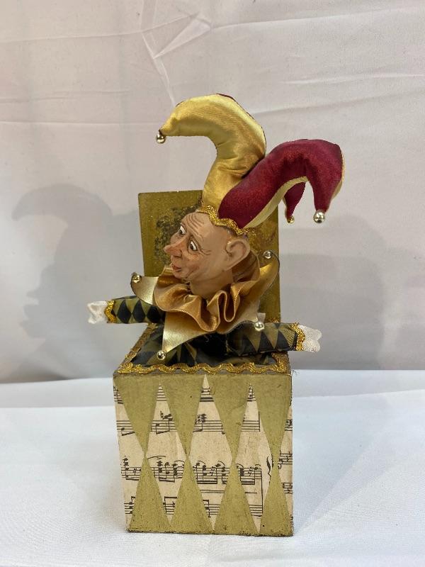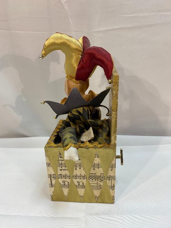 Wayne Kleski jack in a box jester music box. Works. The jester moves around while playing.