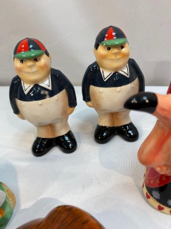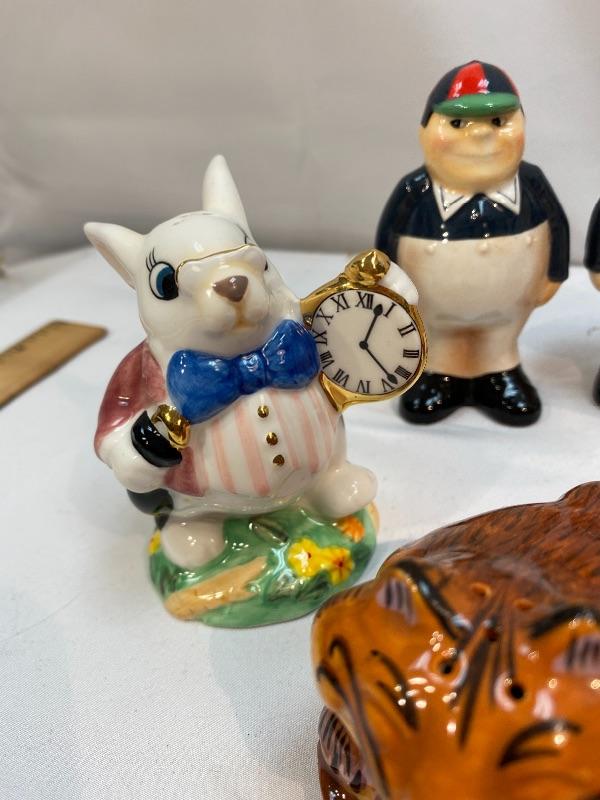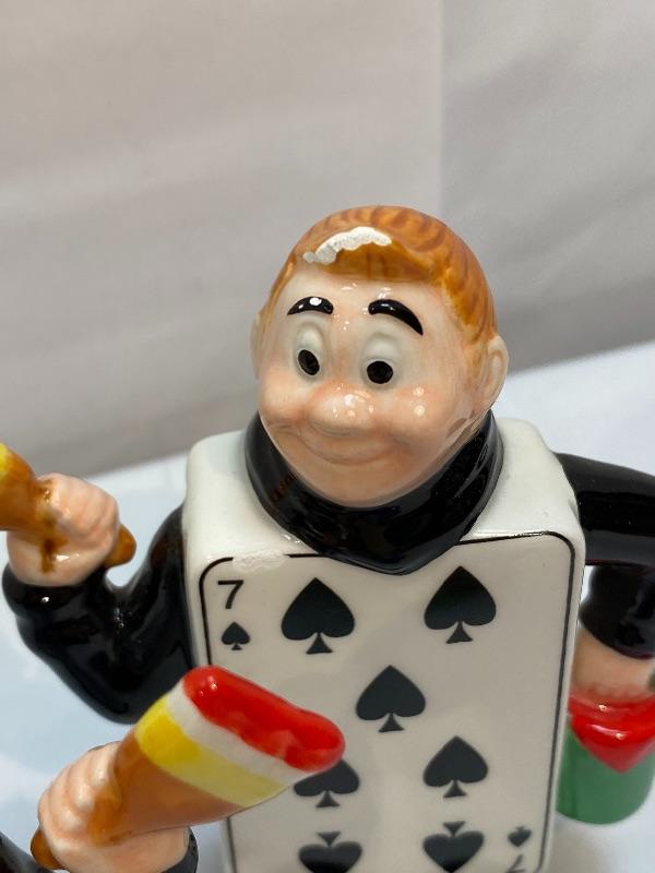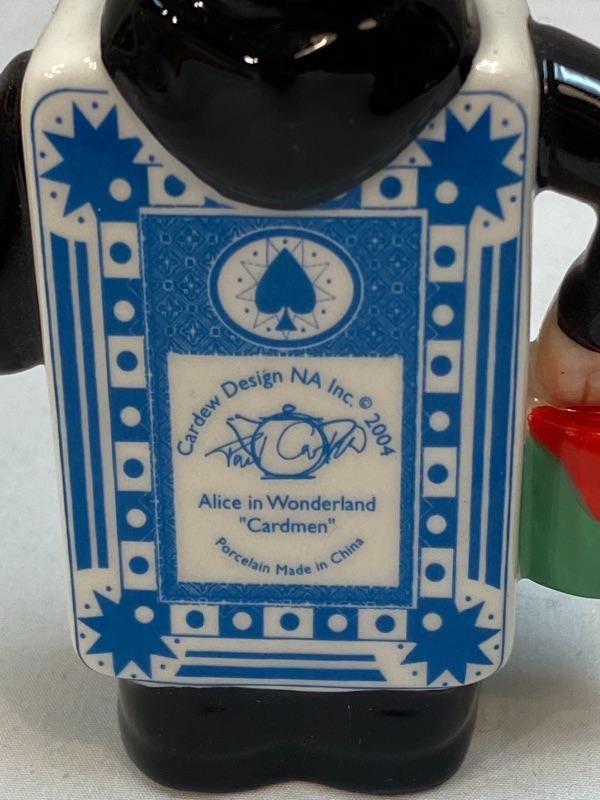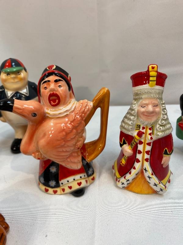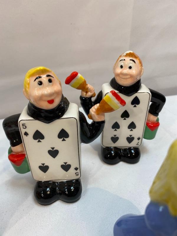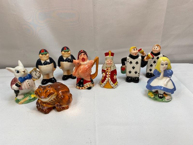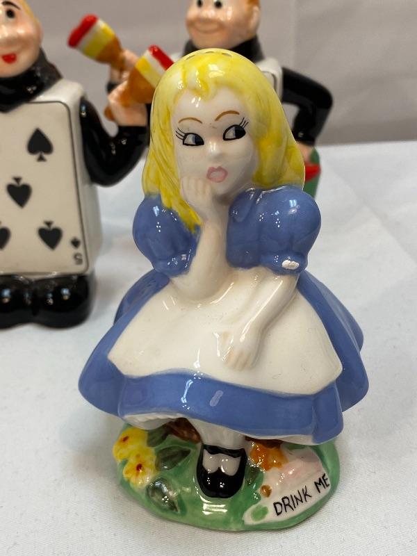 Cardew Design Alice in Wonderland shaker set. 2004 release. 9 shakers include Alice, the white rabbit, Cheshire cat, tweedle dee & tweedle dum, the queen, the king, and two cardsmen. Good condition.