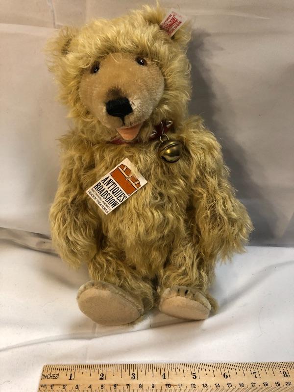 12" vintage Steiff & Antiques Roadshow limited edition teddy bear. Jointed bear, golden fur. Has both Antiques Roadshow tag and Steiff tag still attached. Released in 2007.
