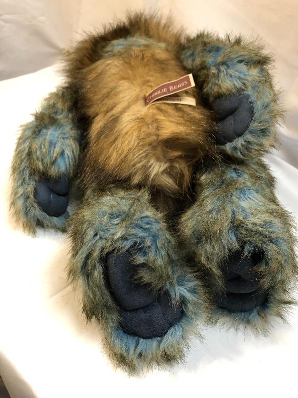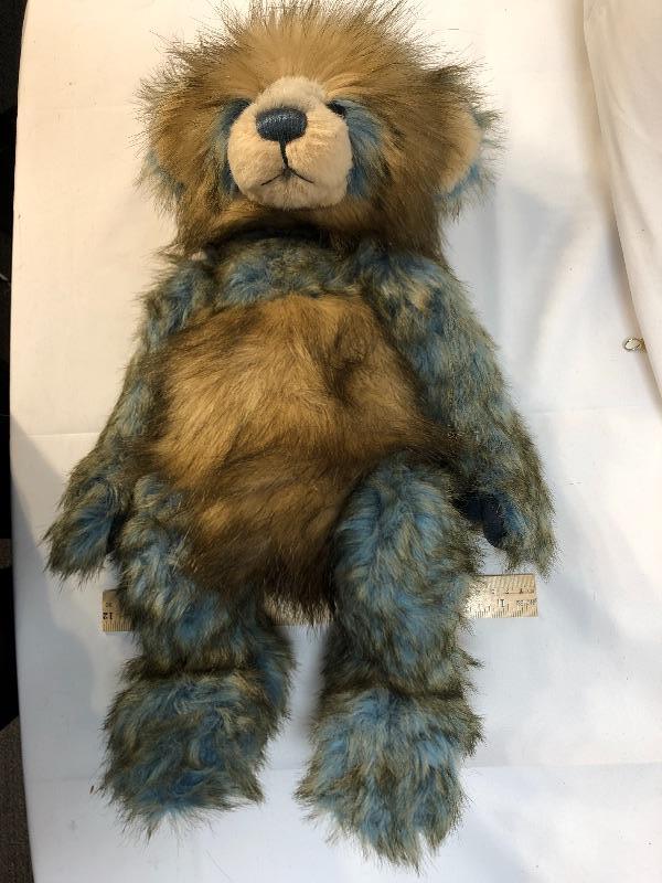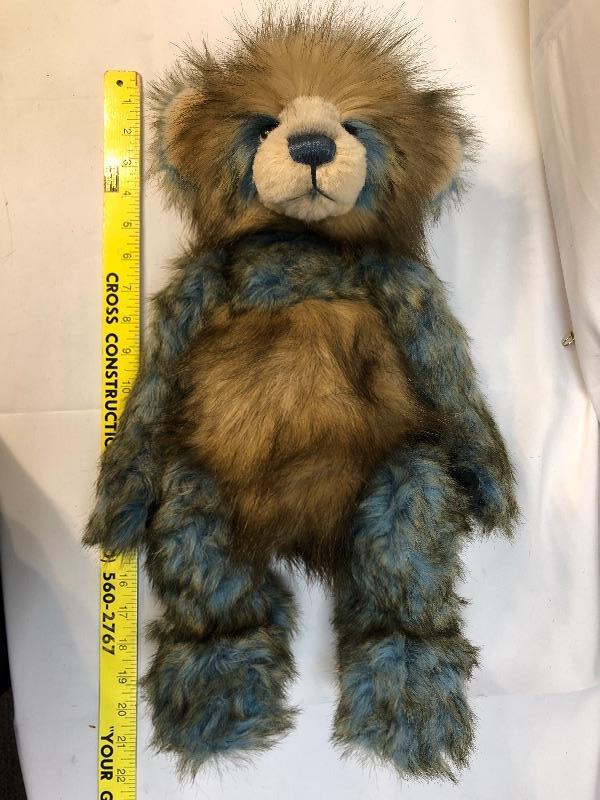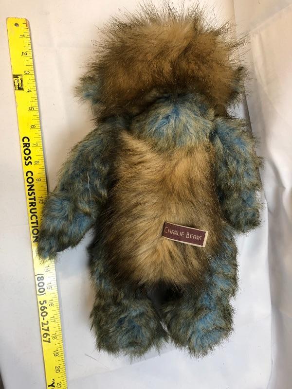 Charlie Bears brown and blue teddy bear plush. Jointed arms and legs. Almost 20" size. Good condition.